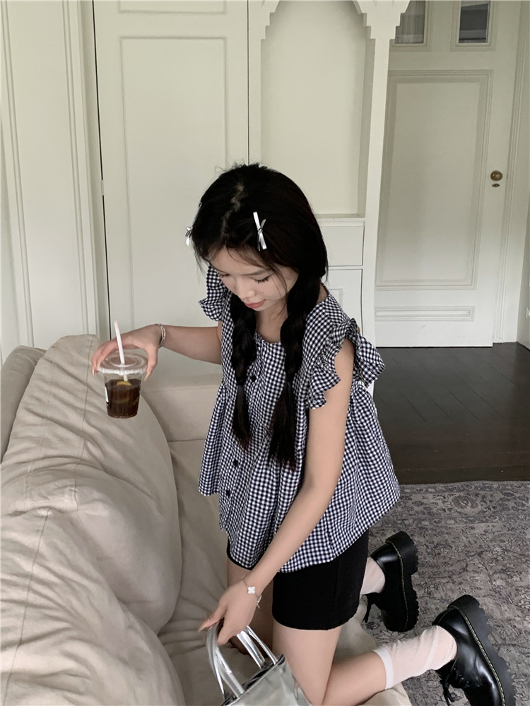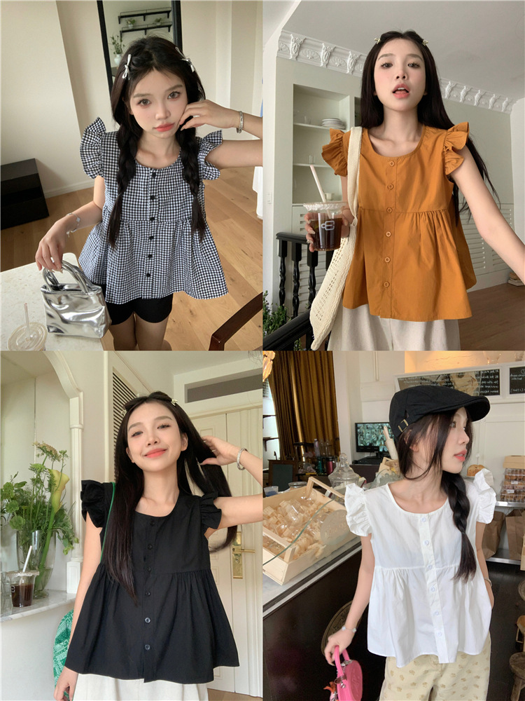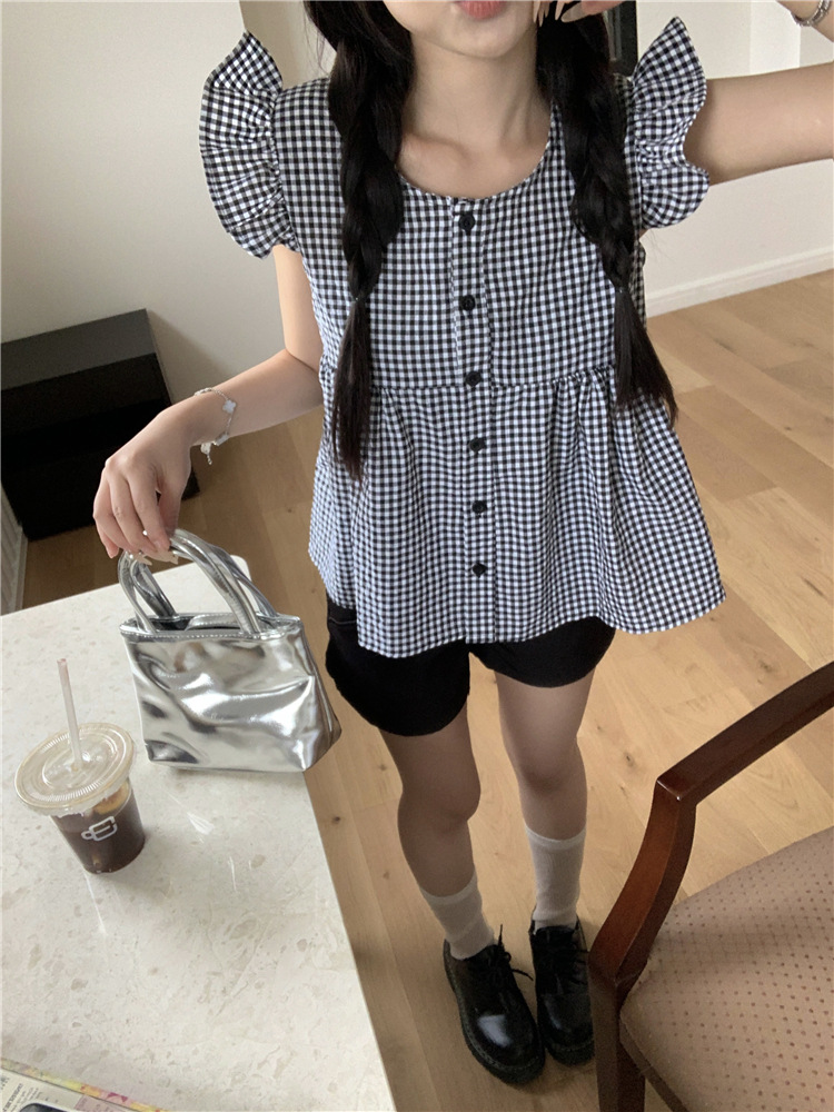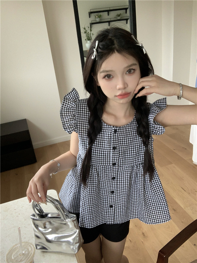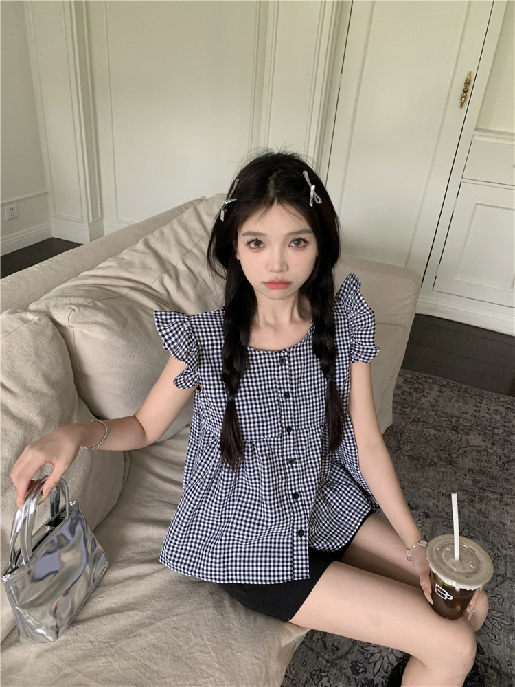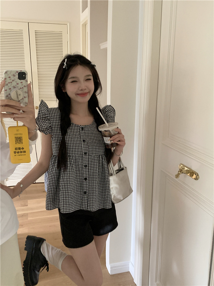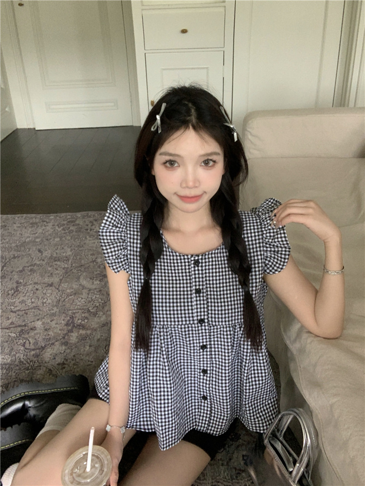 시폰 2025 새 스타일 배꼽 노출 핫 소녀 짧은 단색 반팔 여름 드레스 플라잉 슬리브 스퀘어 넥 격자 무늬 프렌치 스타일스토어 가기