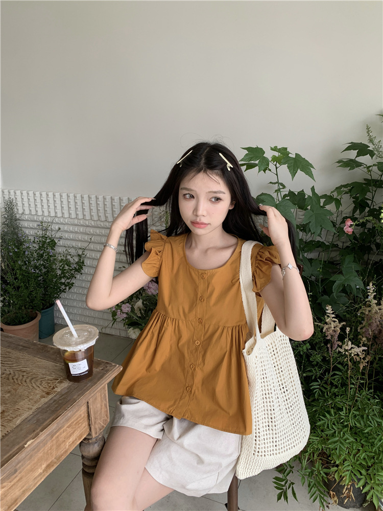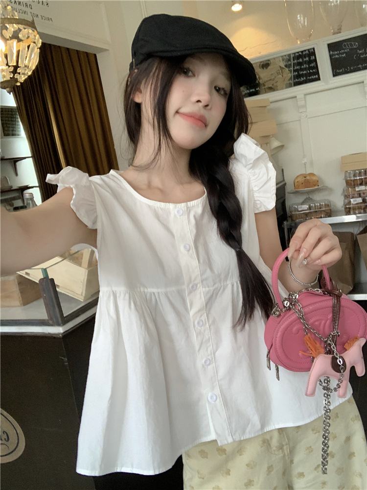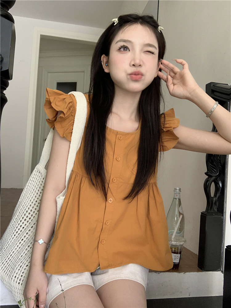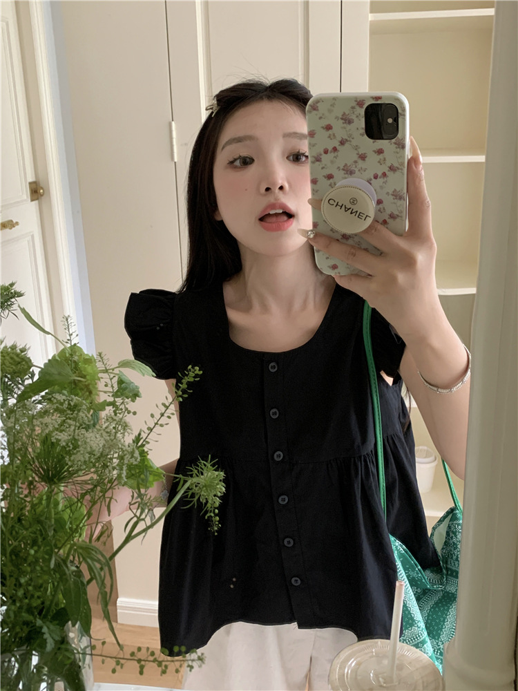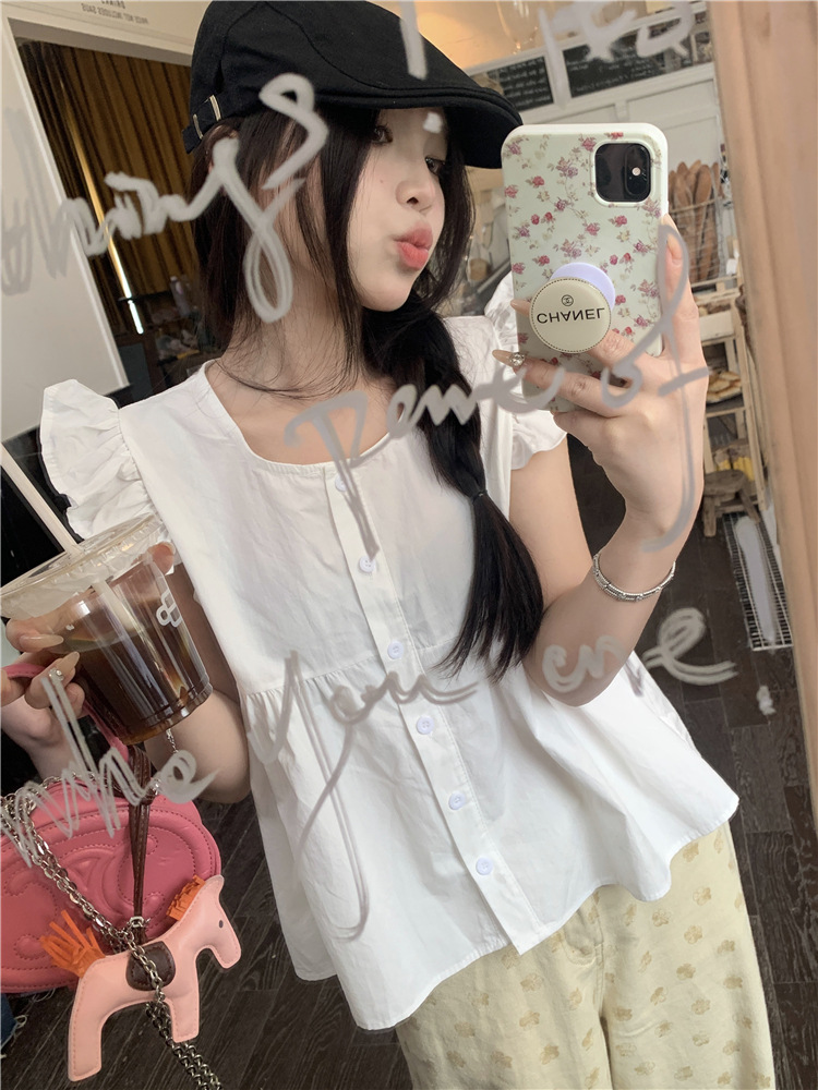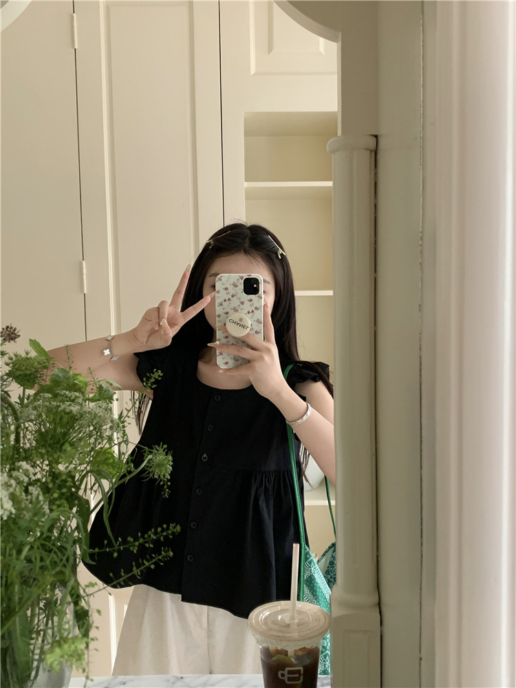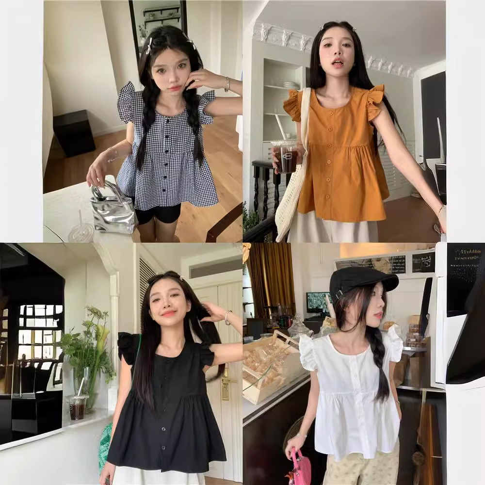 시폰 2025 새 스타일 배꼽 노출 핫 소녀 짧은 단색 반팔 여름 드레스 플라잉 슬리브 스퀘어 넥 격자 무늬 프렌치 스타일스토어 가기