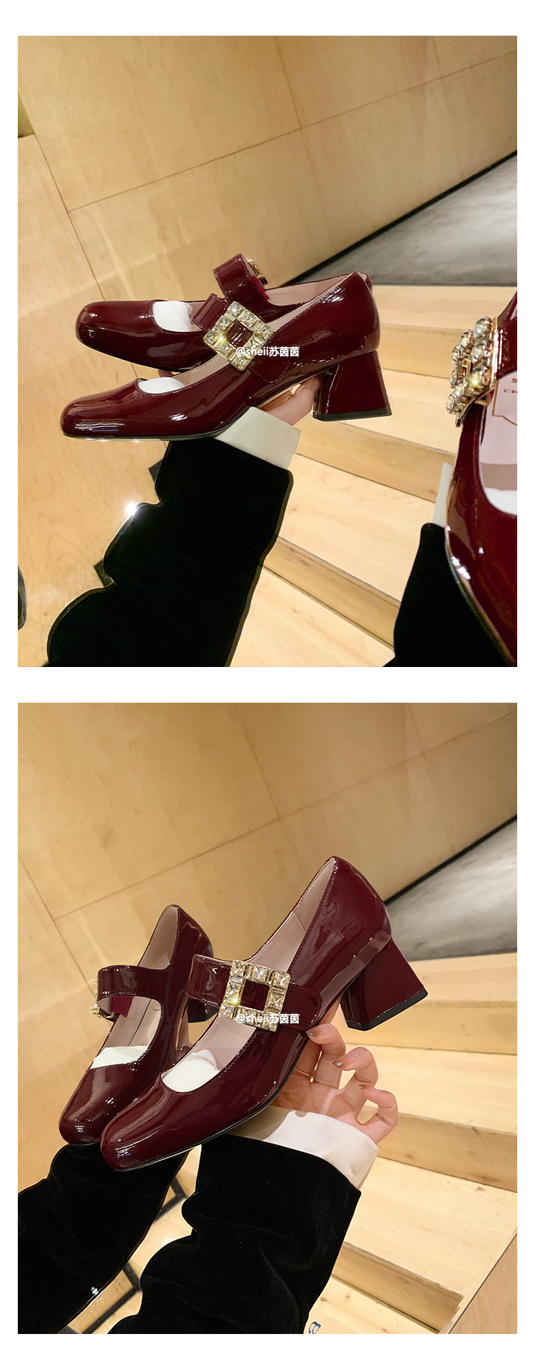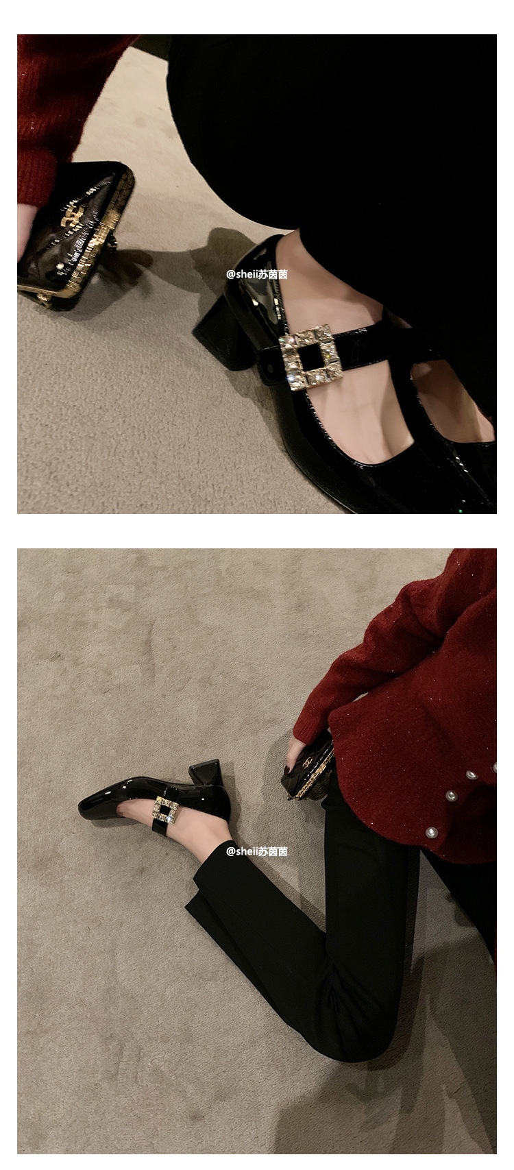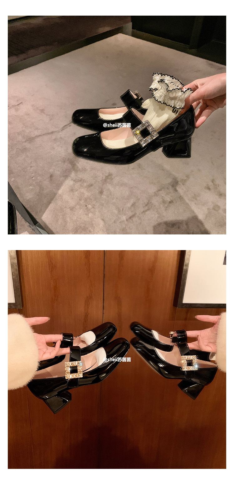 정품 가죽 sheii Su Yinyin 주인공 스퀘어 토 라인스톤 스퀘어 버클 스트랩 두꺼운 굽 메리 제인 여성 싱글 슈즈 웨딩 슈즈 프렌치 스타일