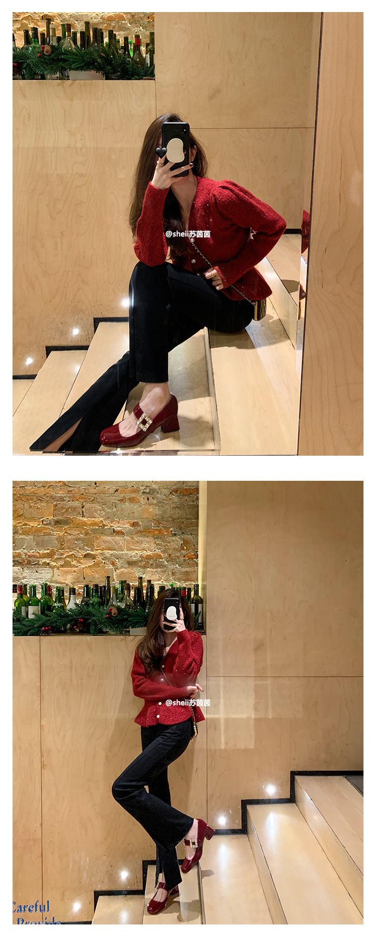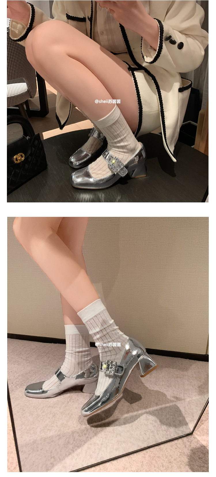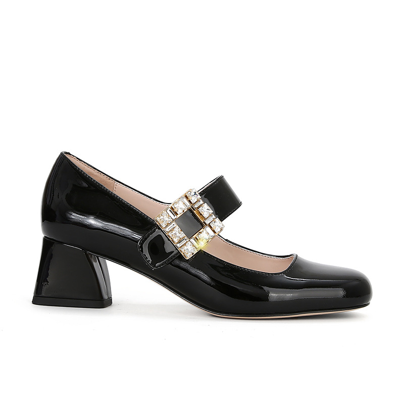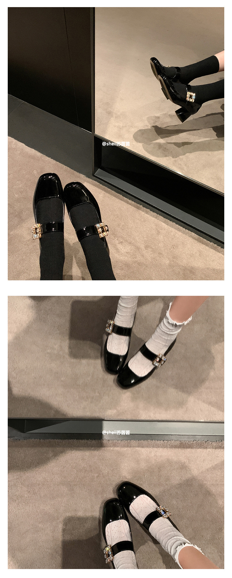 정품 가죽 sheii Su Yinyin 주인공 스퀘어 토 라인스톤 스퀘어 버클 스트랩 두꺼운 굽 메리 제인 여성 싱글 슈즈 웨딩 슈즈 프렌치 스타일