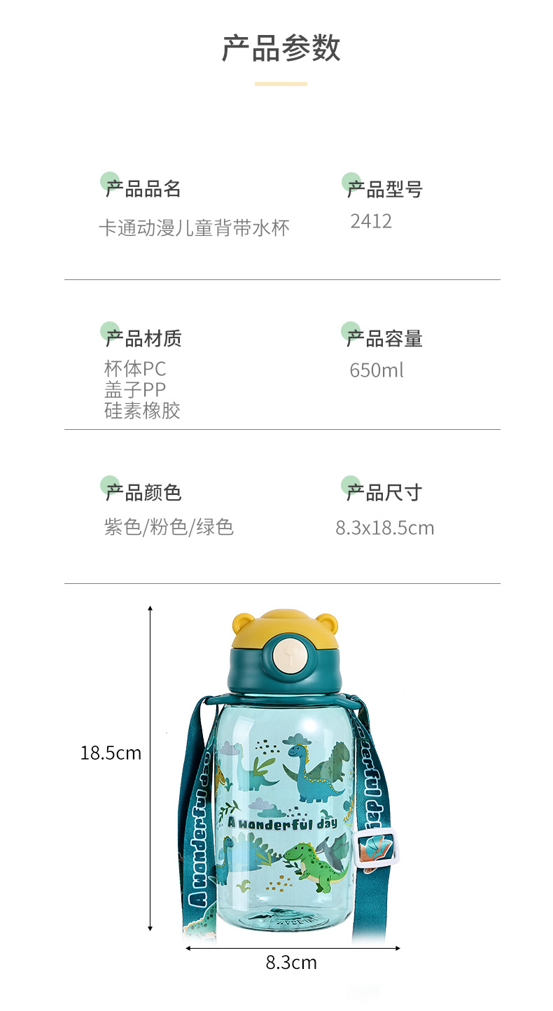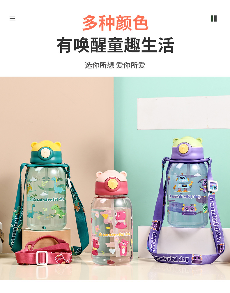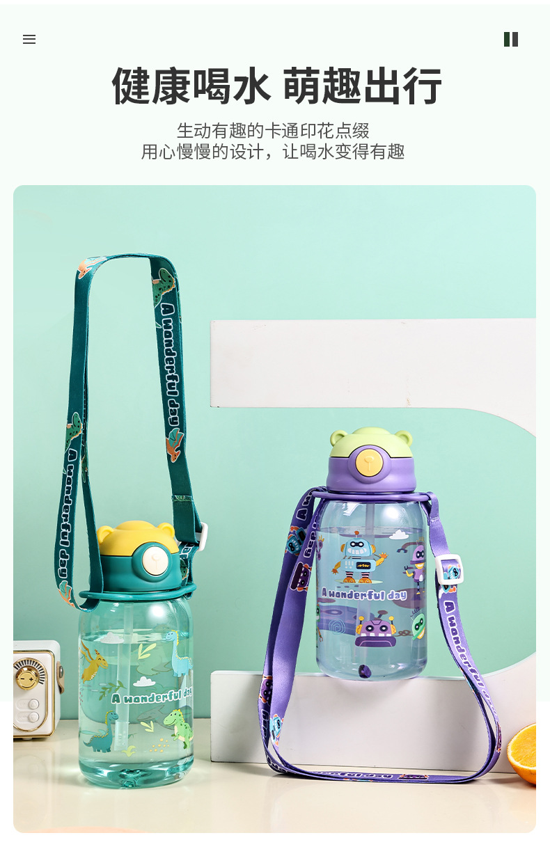 대용량 어린이 밀짚 컵 만화 스트랩 물 컵 유치원 학생 마시는 물 플라스틱 컵 고온 저항