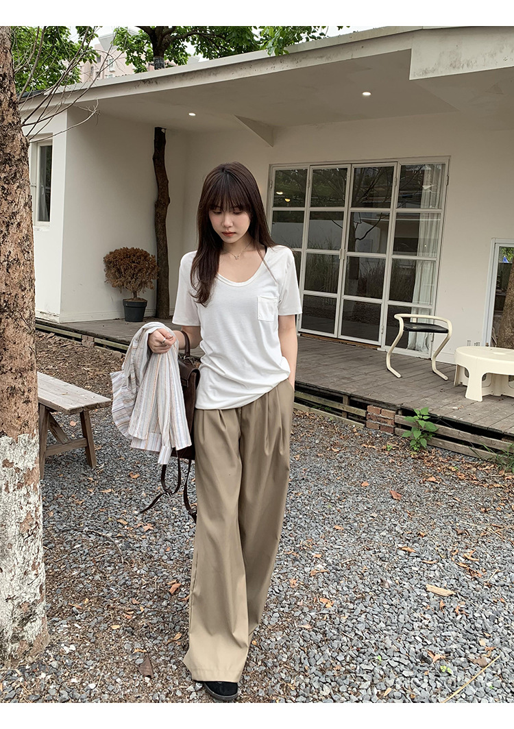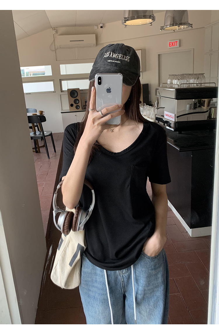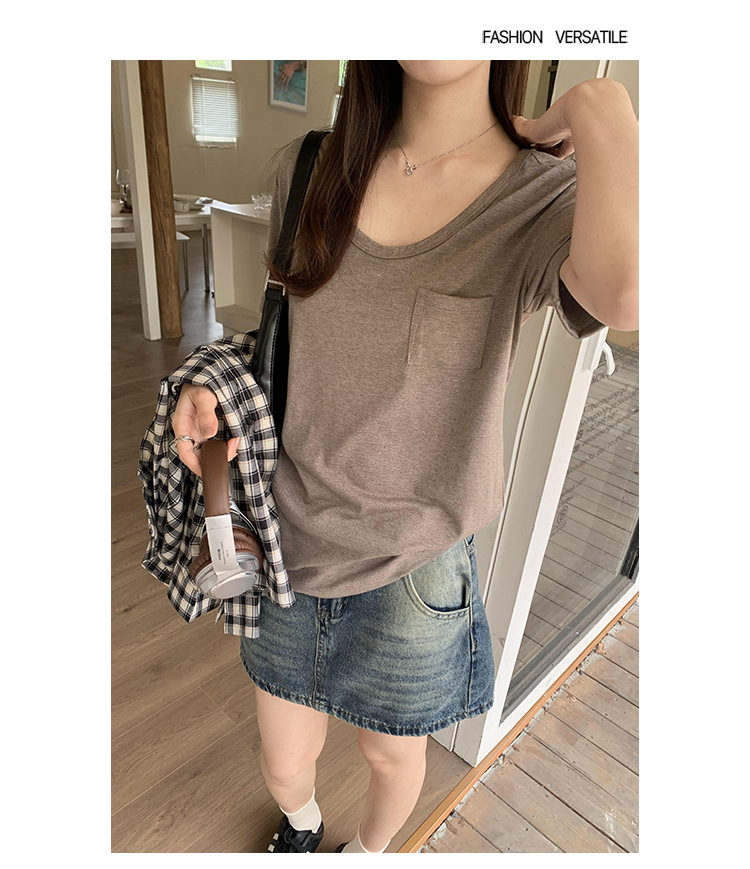 여성을위한 간단한 타원형 칼라 어깨 반팔 티셔츠 2024 여름 새로운 스타일의 포켓 디자인 캐주얼 중간 길이 탑스토어 가기