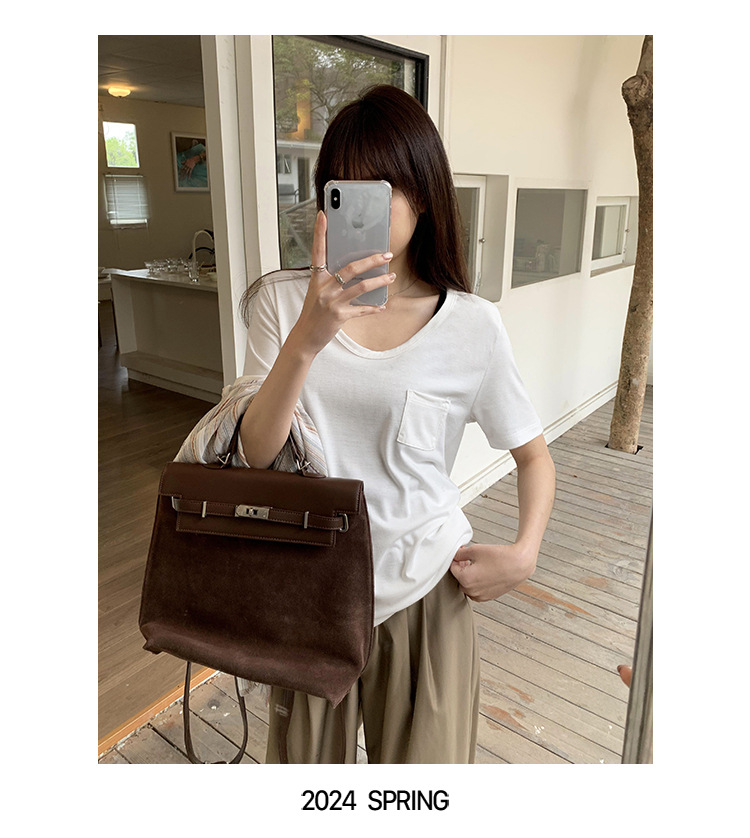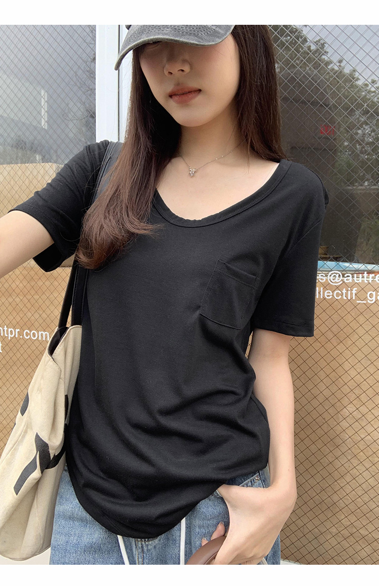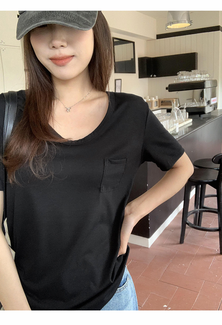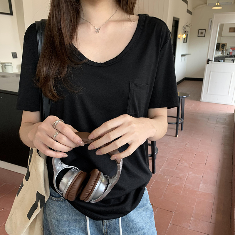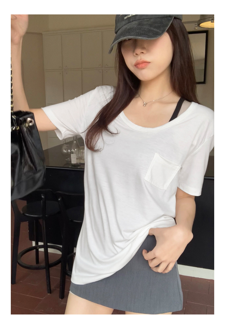 여성을위한 간단한 타원형 칼라 어깨 반팔 티셔츠 2024 여름 새로운 스타일의 포켓 디자인 캐주얼 중간 길이 탑