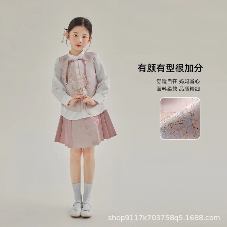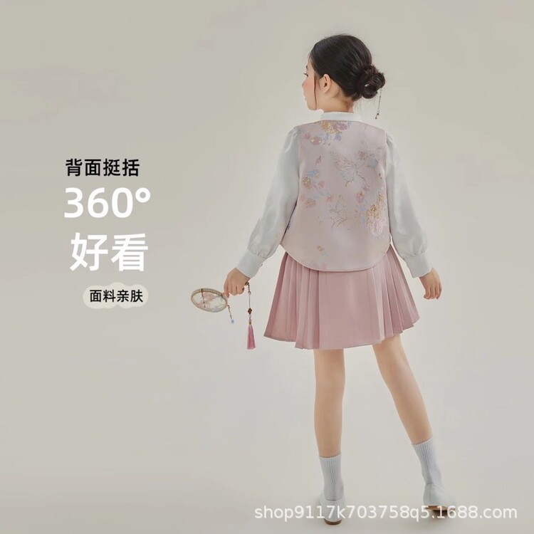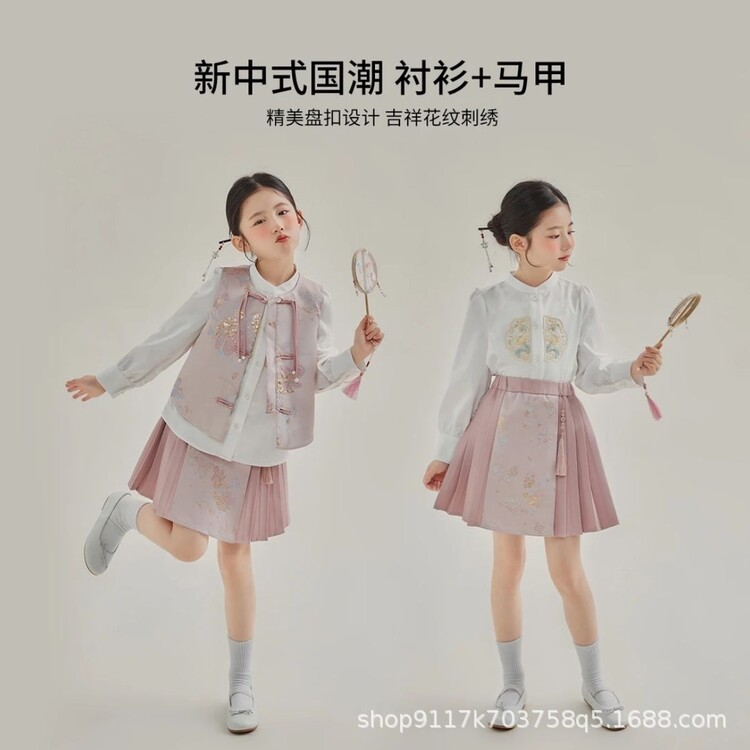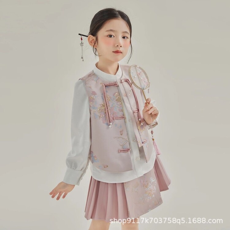 소녀 세트 2024 봄과 가을 의류 새로운 중국 국가 패션 긴팔 셔츠 조끼 버클 자수 투피스 세트 어린 소녀스토어 가기