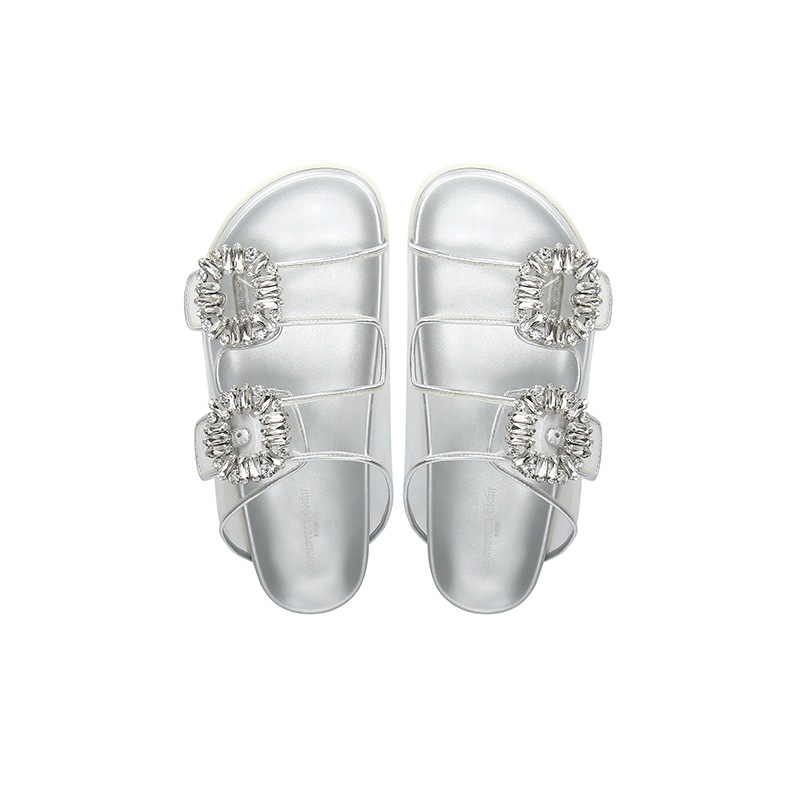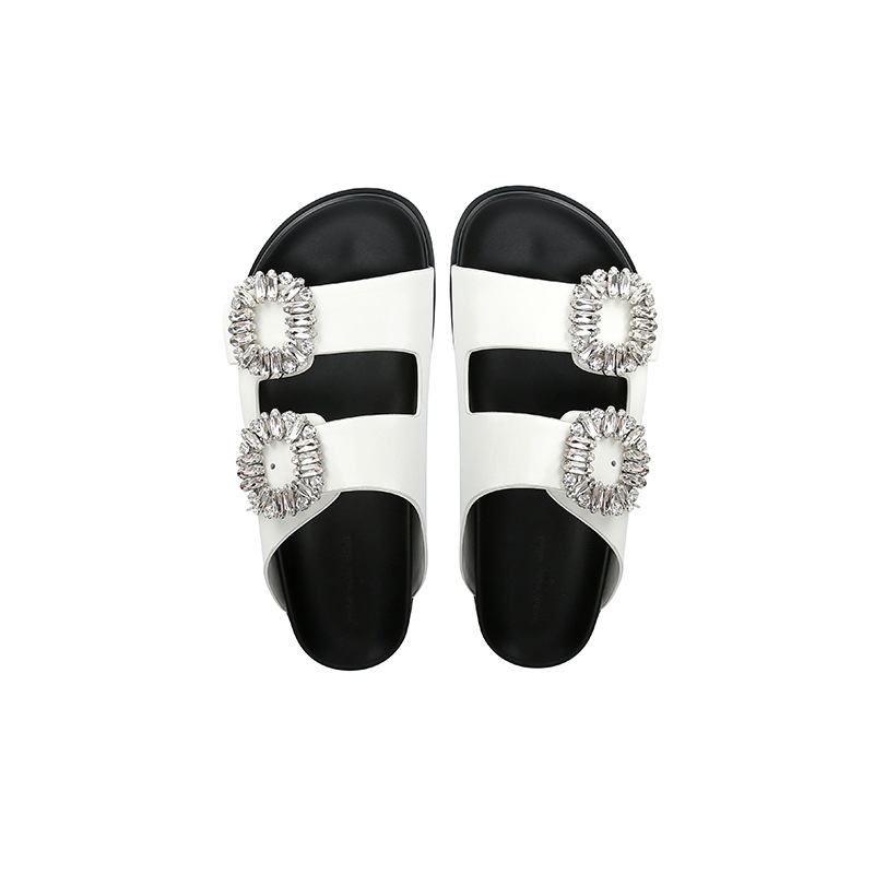 즉시 배송! 패셔너블하고 다재다능한 신상 사각 버클 큐빅 가죽 이중 스트랩 캐주얼 두꺼운 밑창 슬리퍼 여성용 샌들 외출용