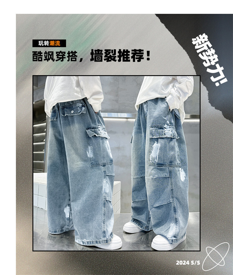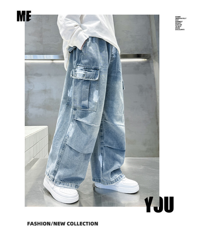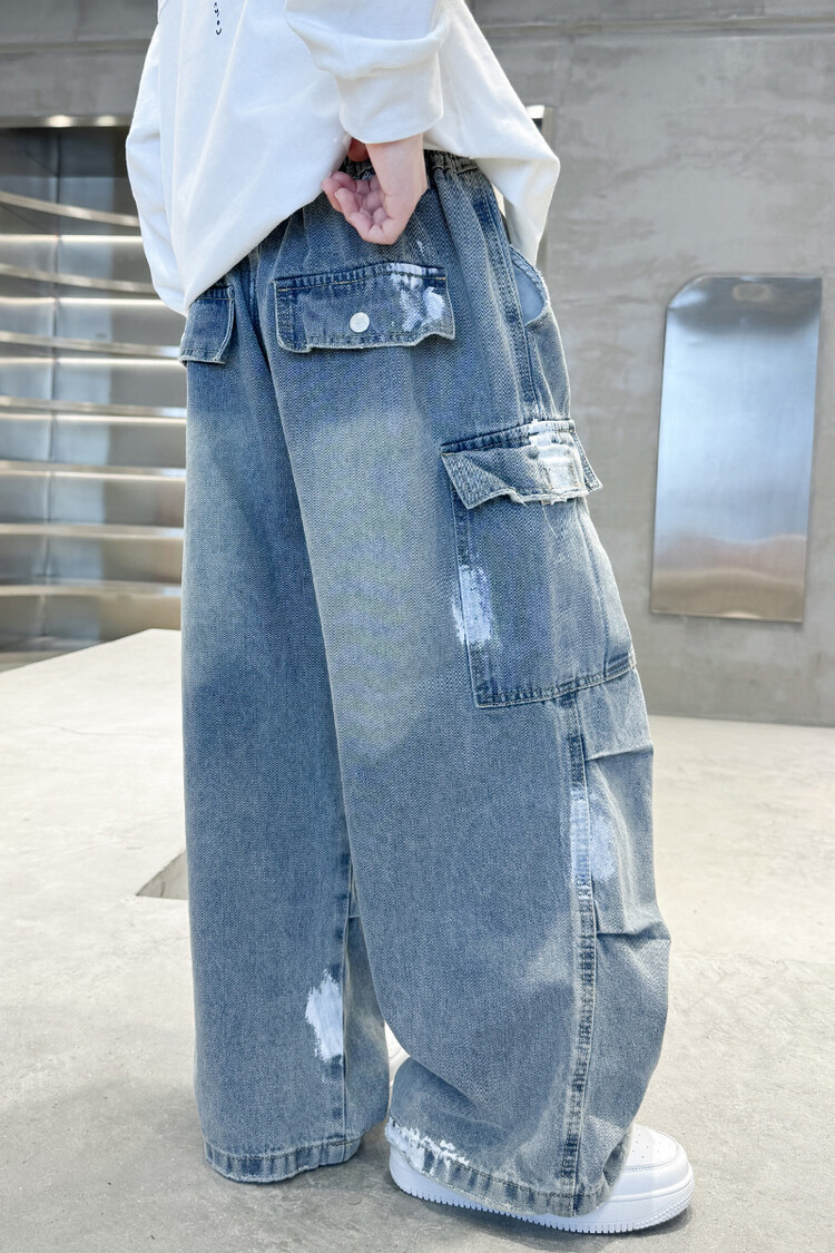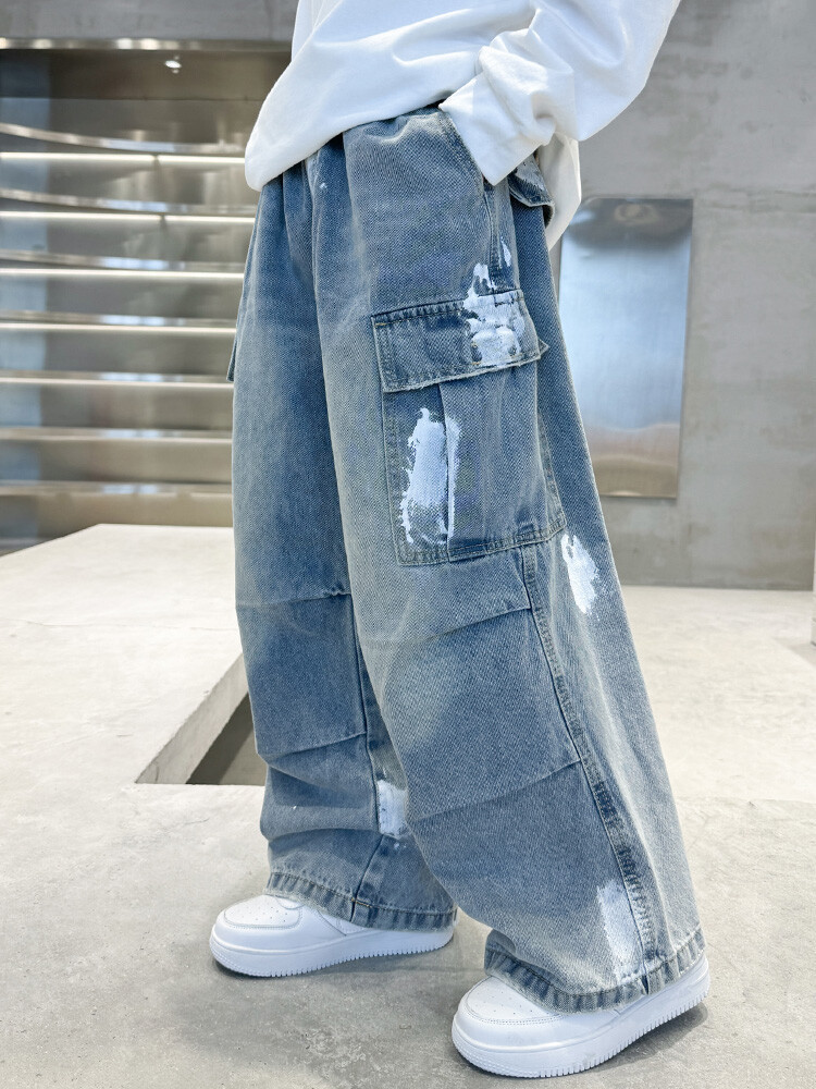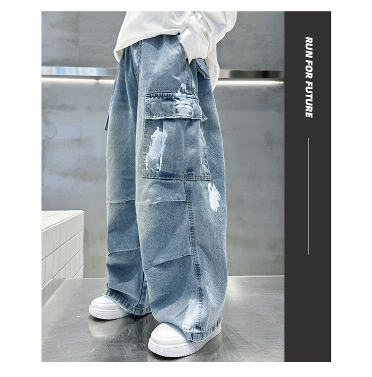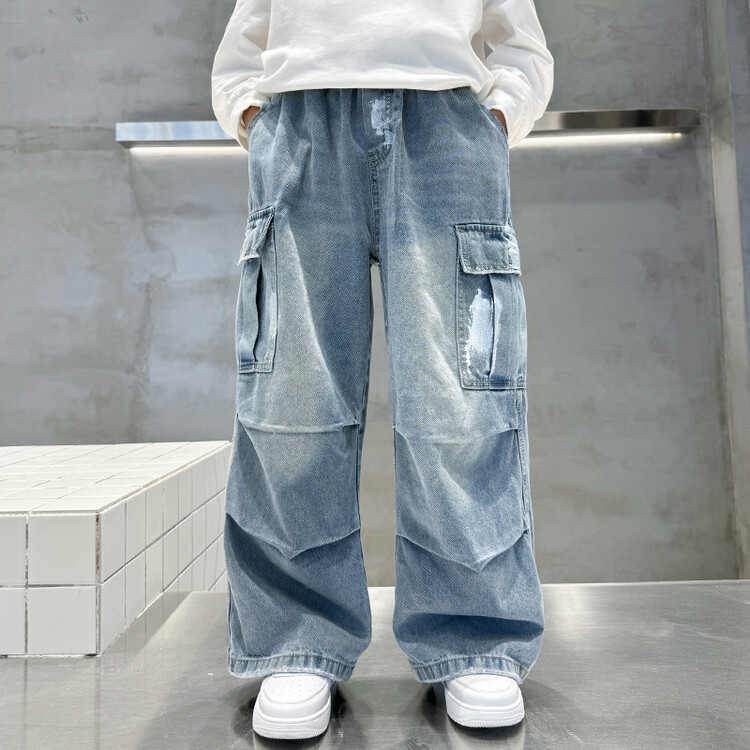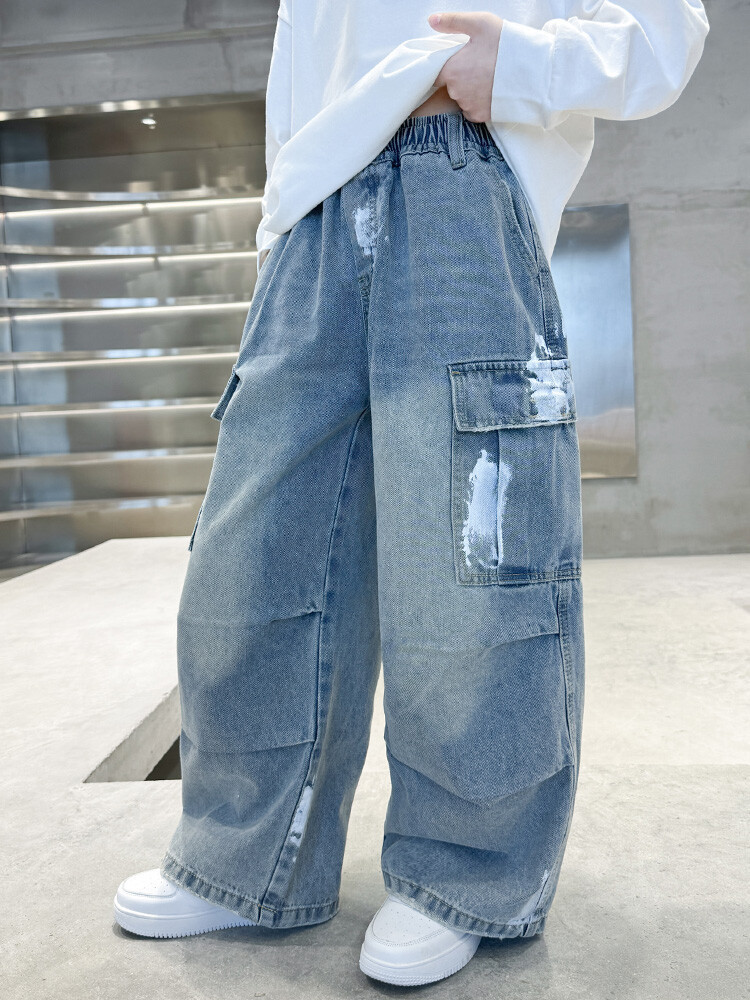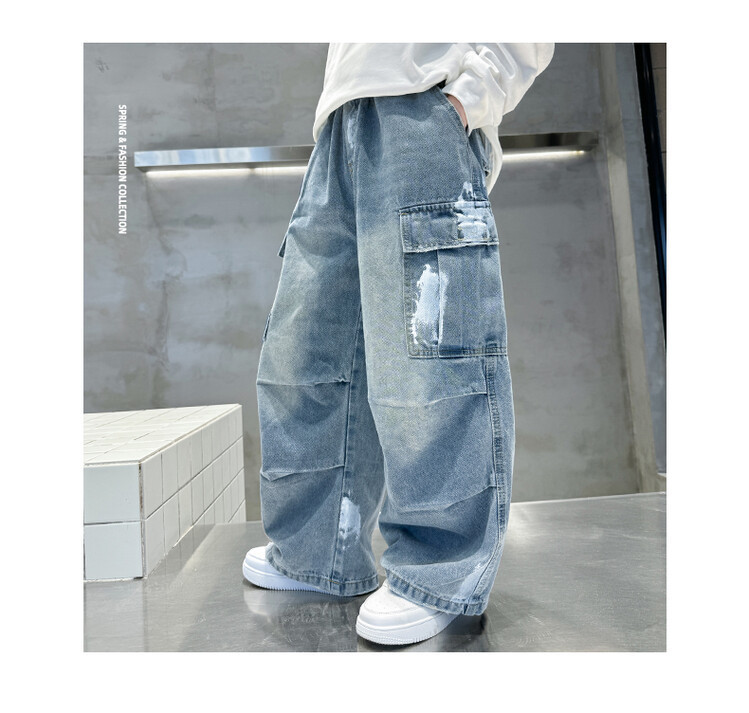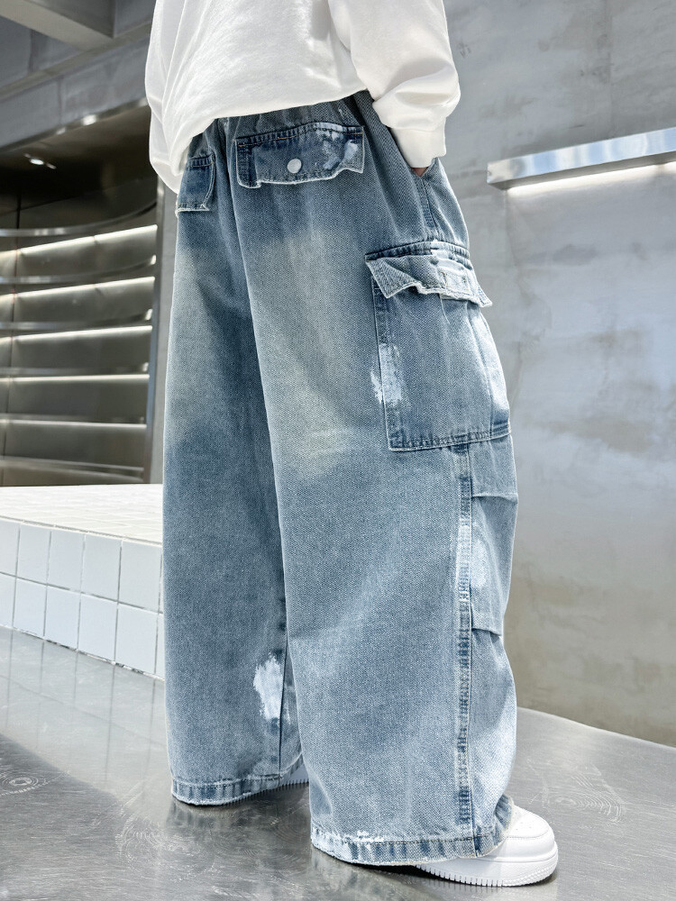 한국 스타일의 세련된 어린이 바지 도매 소년 청바지 느슨한 유행 넓은 다리 바지 중 큰 어린이 힙합 바지 국경스토어 가기