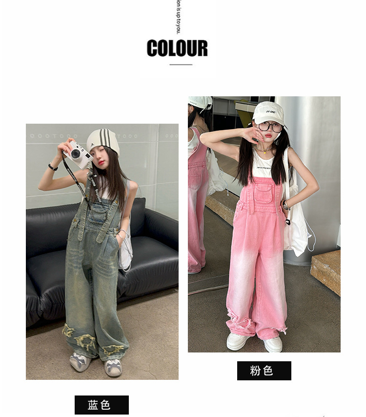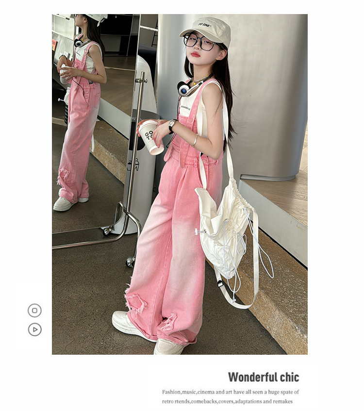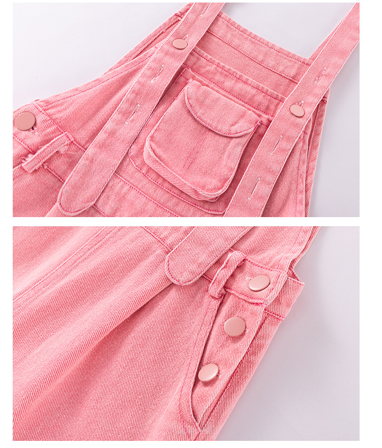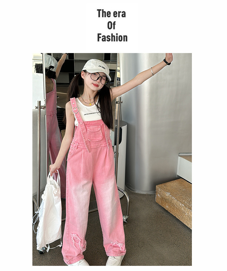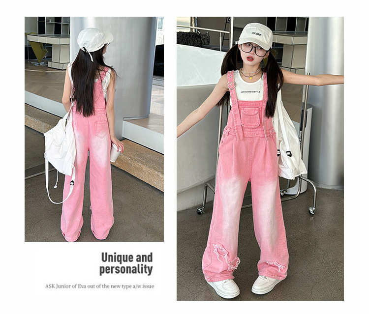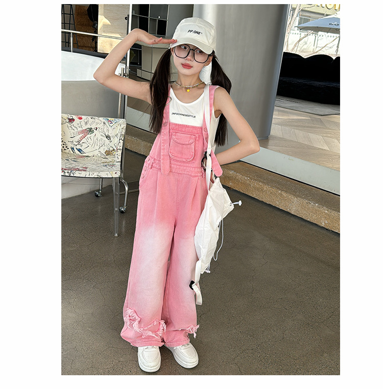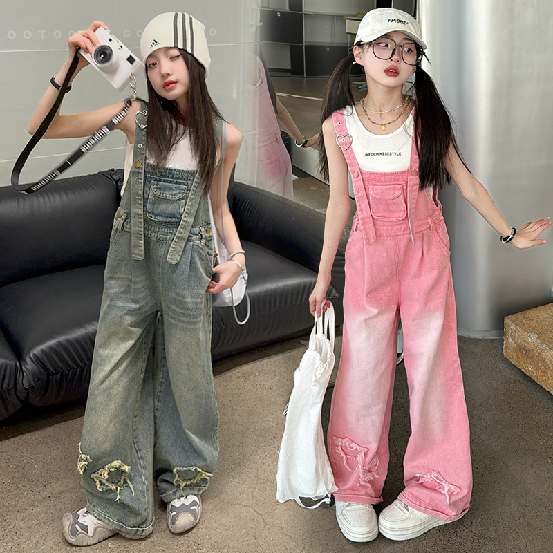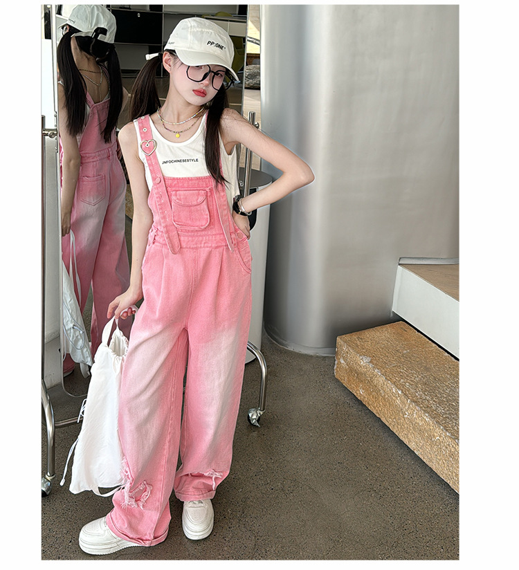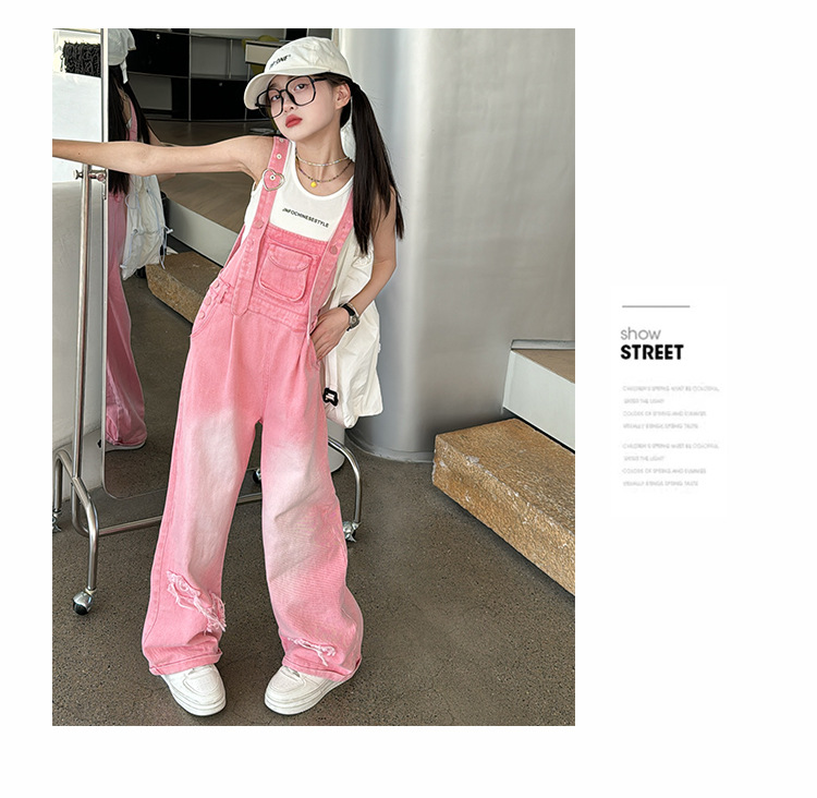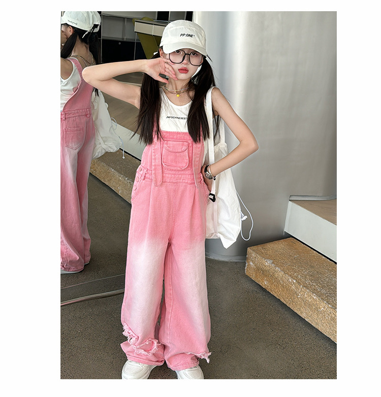 새 봄과 가을 의류 중형 및 대형 어린이 핑크 바지 패션 2024 소녀 한국식 데님 서스펜더 바지 도파민 세트스토어 가기