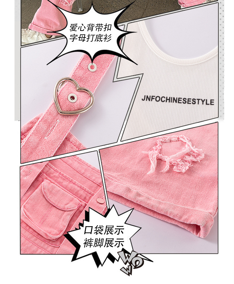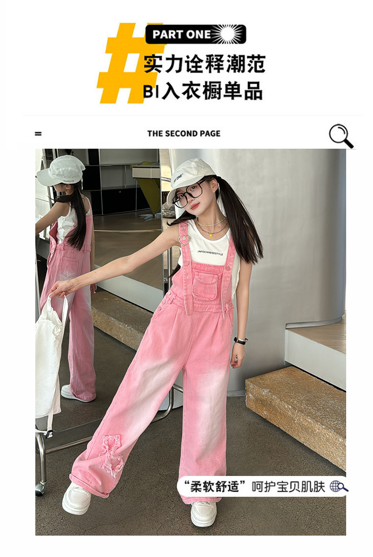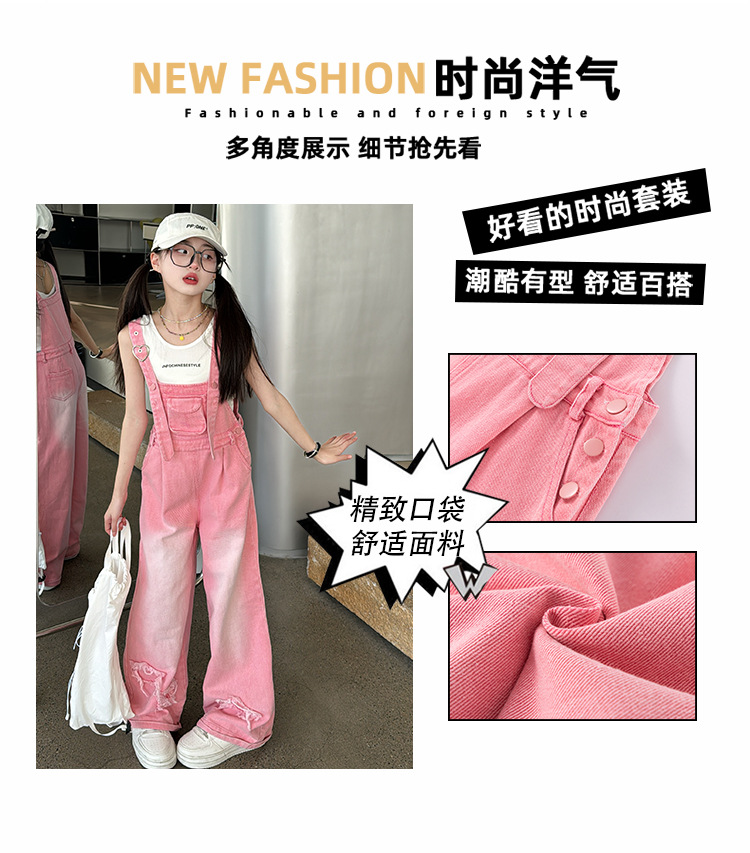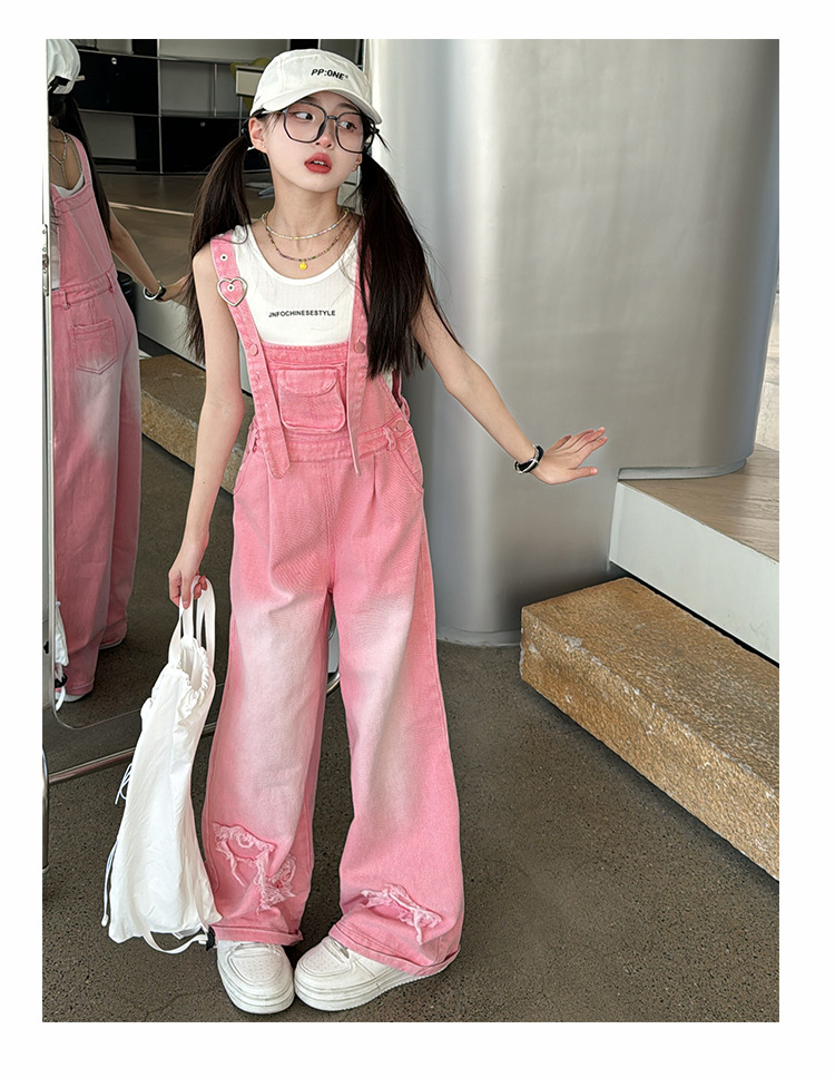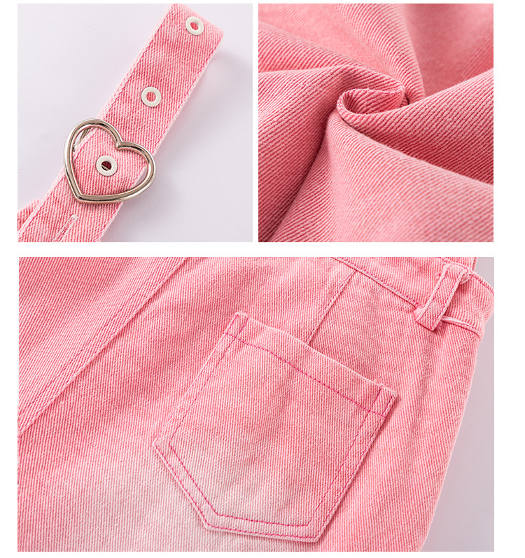 새 봄과 가을 의류 중형 및 대형 어린이 핑크 바지 패션 2024 소녀 한국식 데님 서스펜더 바지 도파민 세트