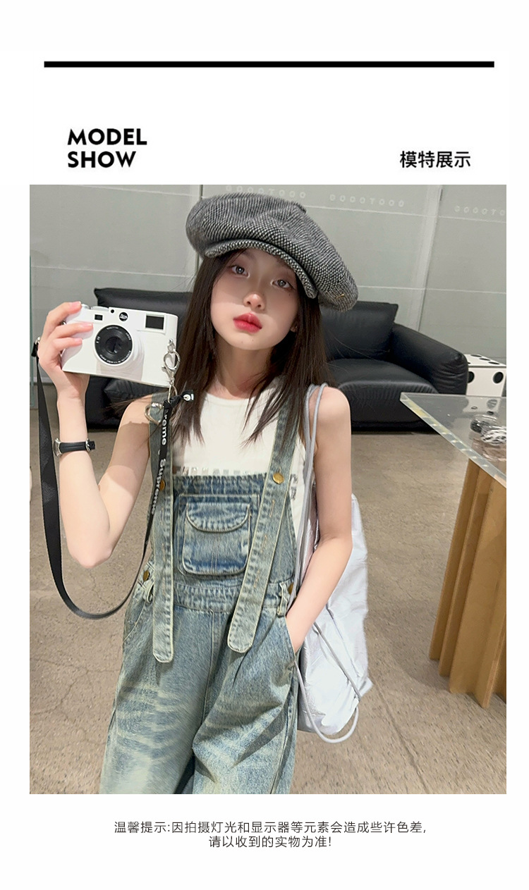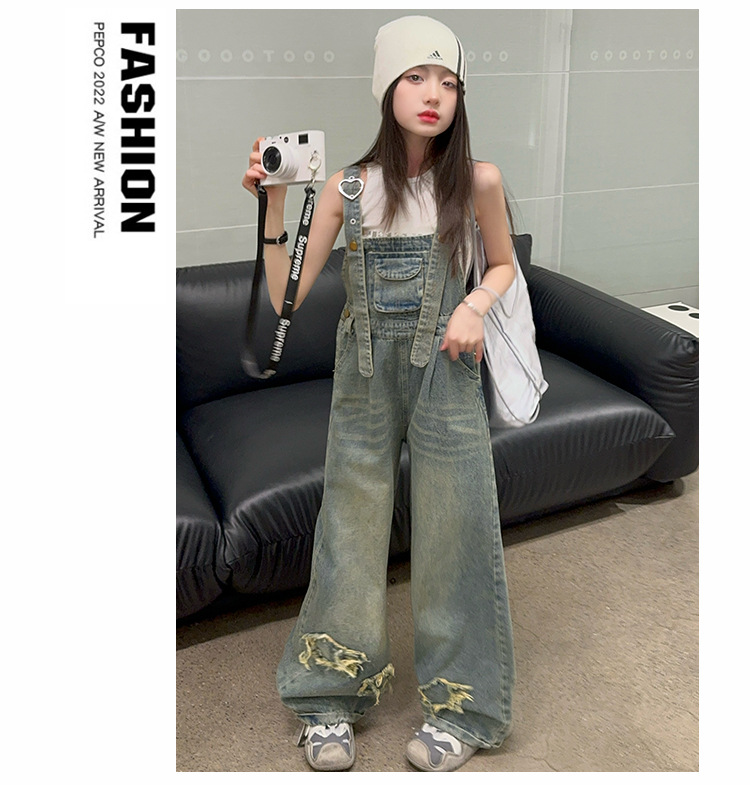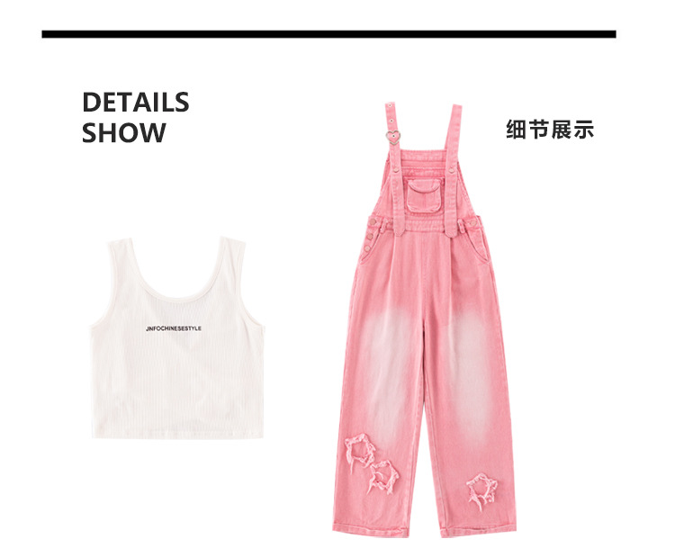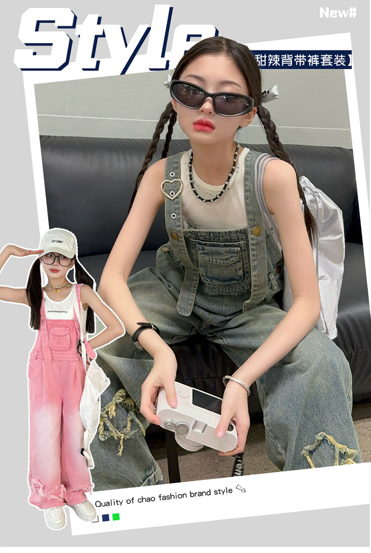 새 봄과 가을 의류 중형 및 대형 어린이 핑크 바지 패션 2024 소녀 한국식 데님 서스펜더 바지 도파민 세트