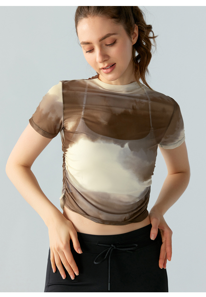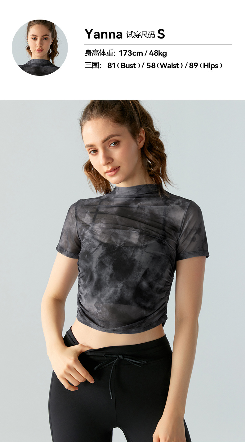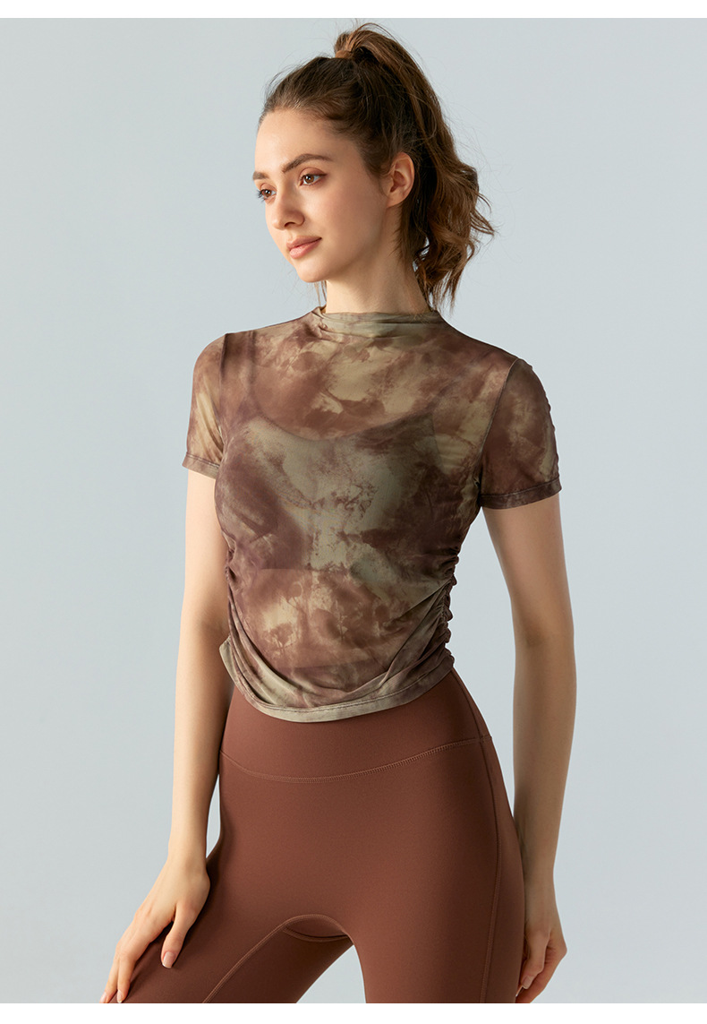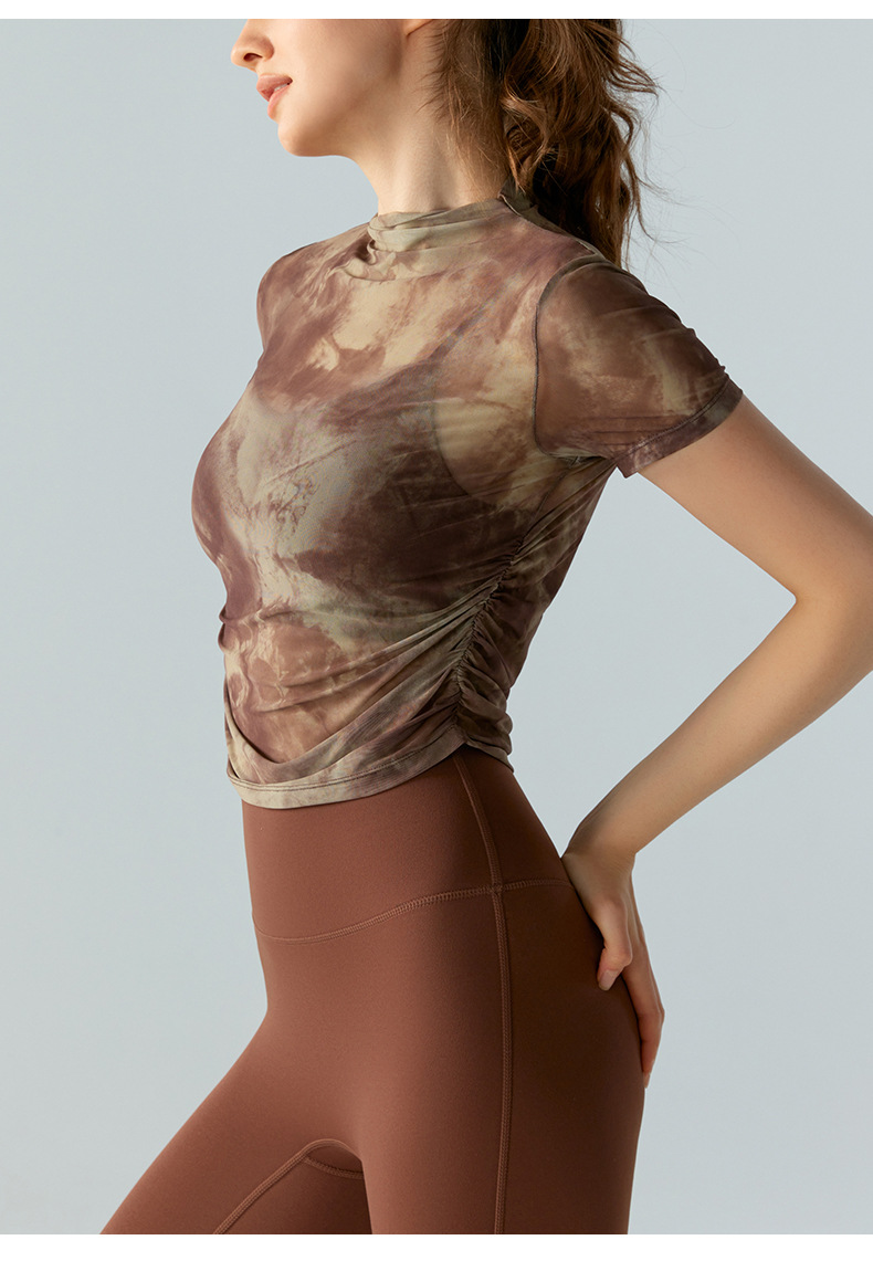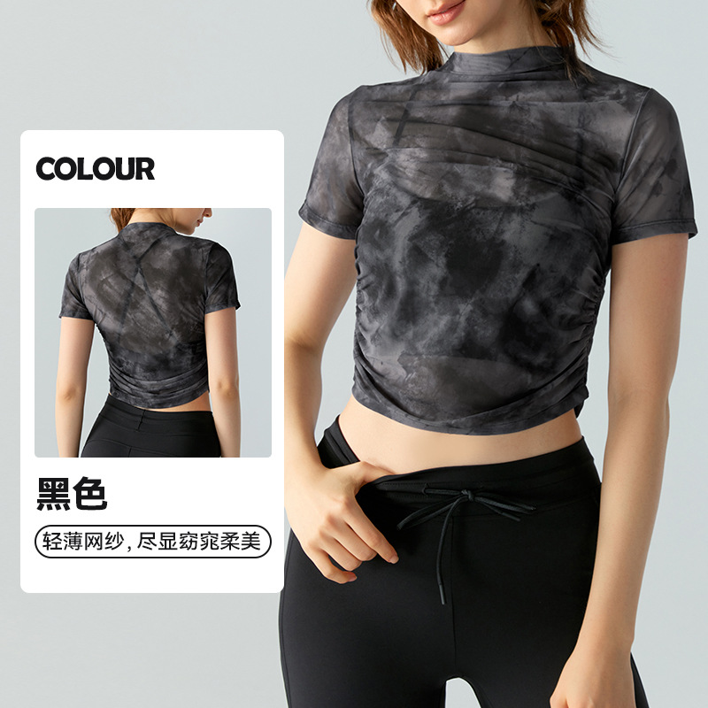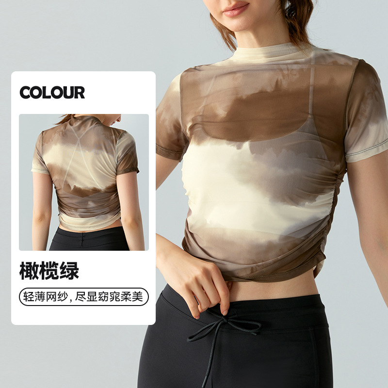 인쇄 된 메쉬 스포츠 최고 여성의 새로운 섹시한 통기성 요가 옷 블라우스 주름 슬림 핏 피트니스 반팔 티셔츠스토어 가기