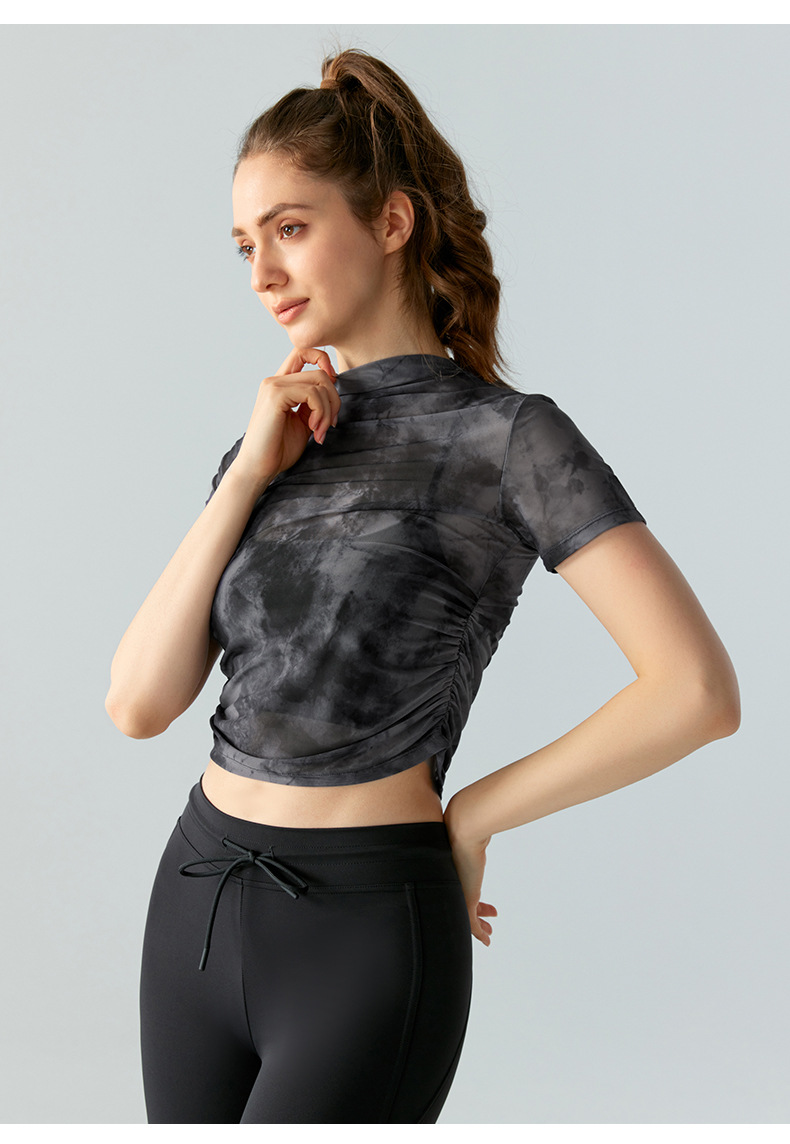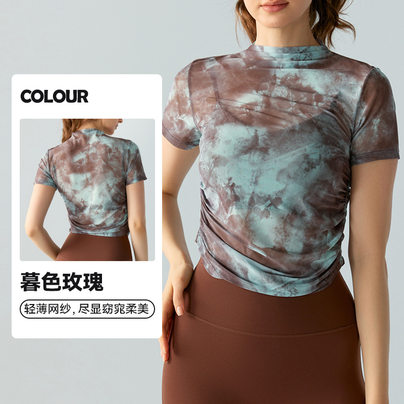 인쇄 된 메쉬 스포츠 최고 여성의 새로운 섹시한 통기성 요가 옷 블라우스 주름 슬림 핏 피트니스 반팔 티셔츠