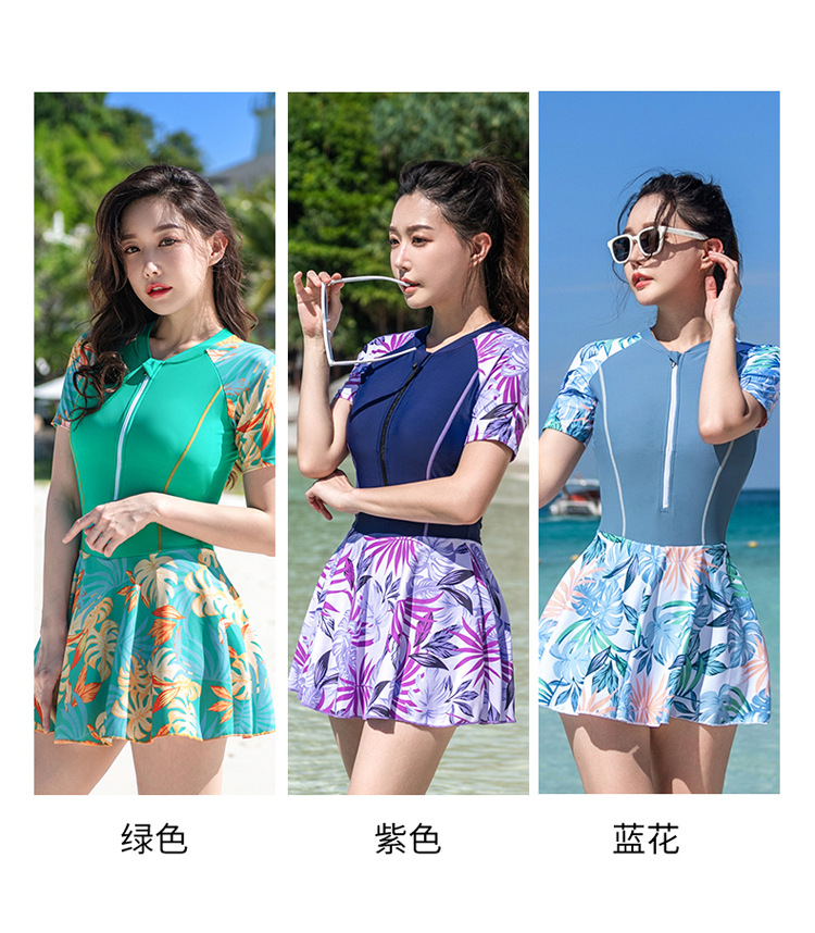 2024 새로운 원피스 수영복 여성 패션 슬림 핏 반팔 수영복 프린트 스티칭 여성용 스커트 선 스크린 수영복