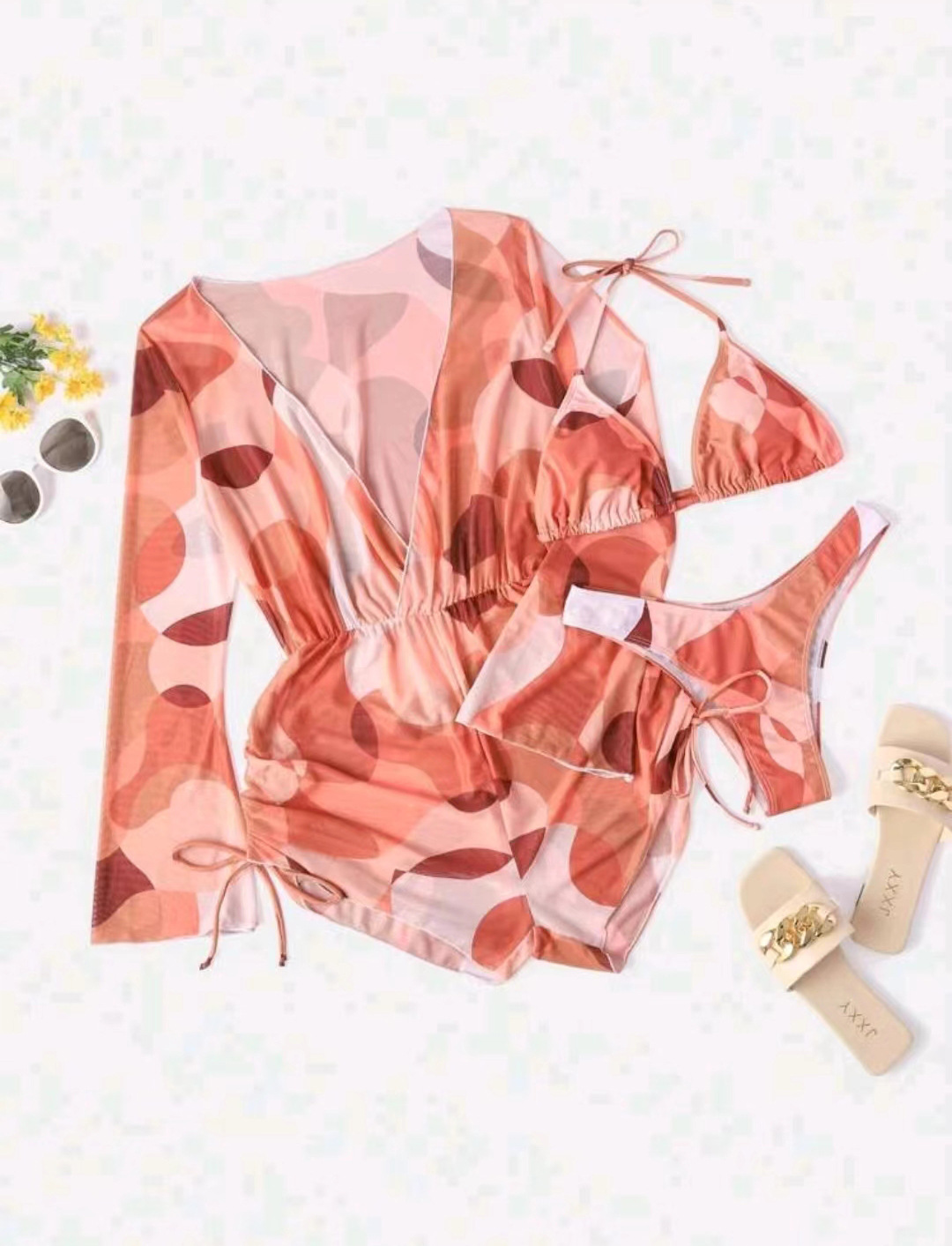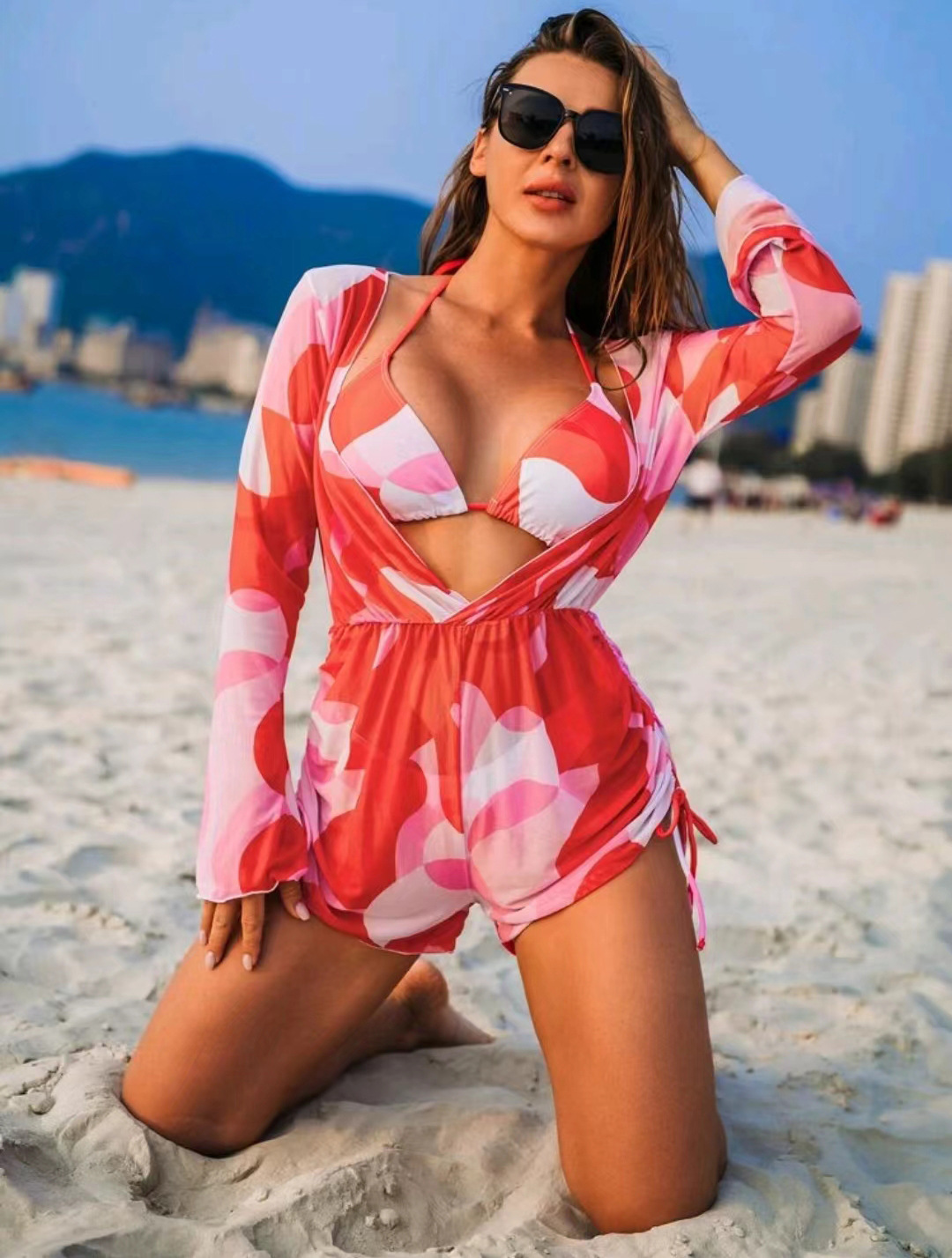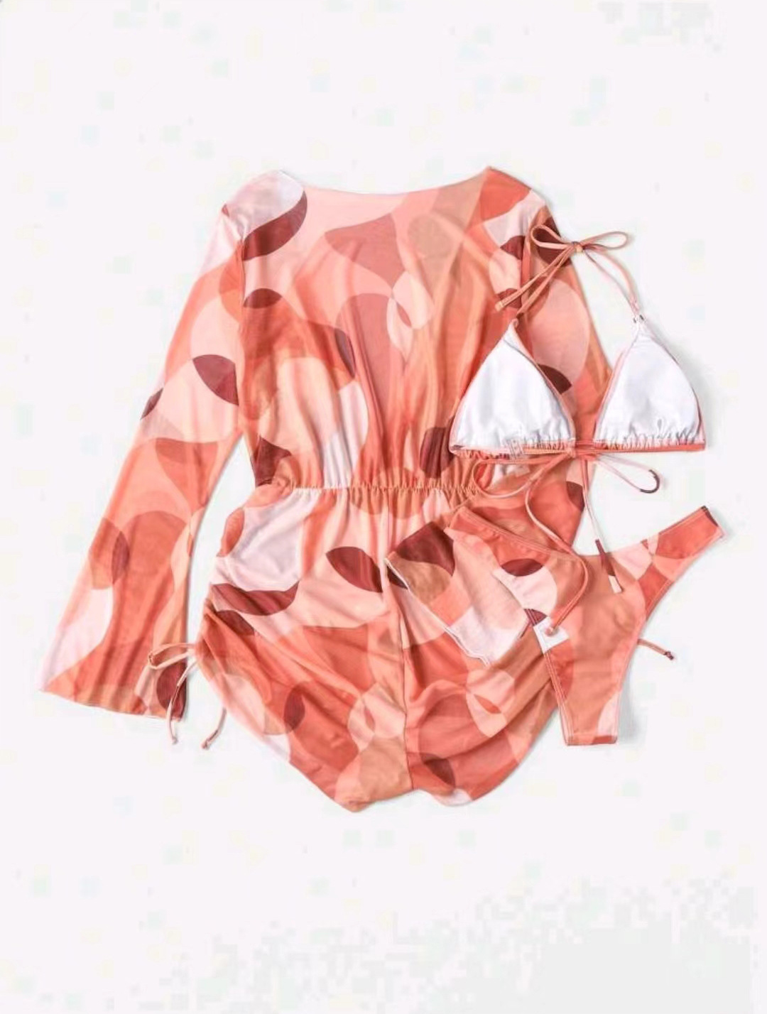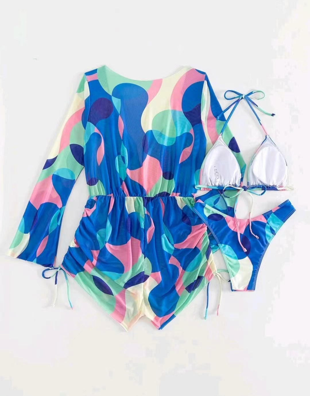 국경 간 대외 무역 2024 새로운 수영복 원피스 긴 소매 메쉬 블라우스 비키니 3 피스 수영복 비키니