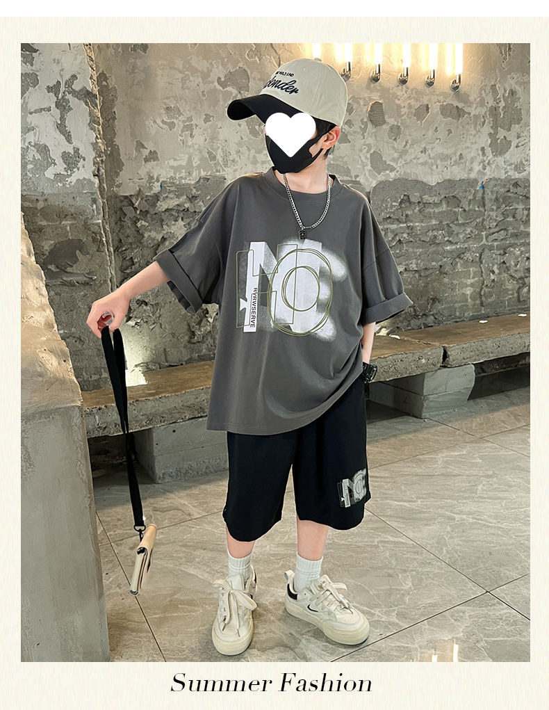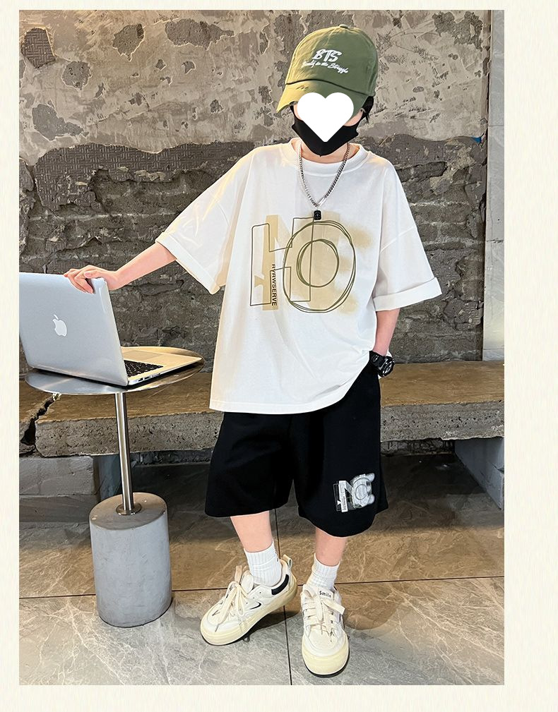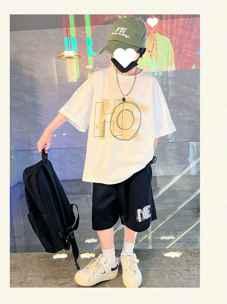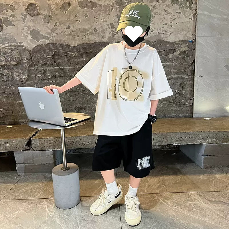 소년 여름 스포츠 세트 2024 새로운 미디어와 큰 어린이 낙서 프린트 티셔츠 다섯 번째 바지 한국식 투피스 세트 패션스토어 가기