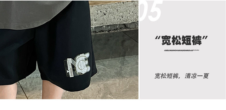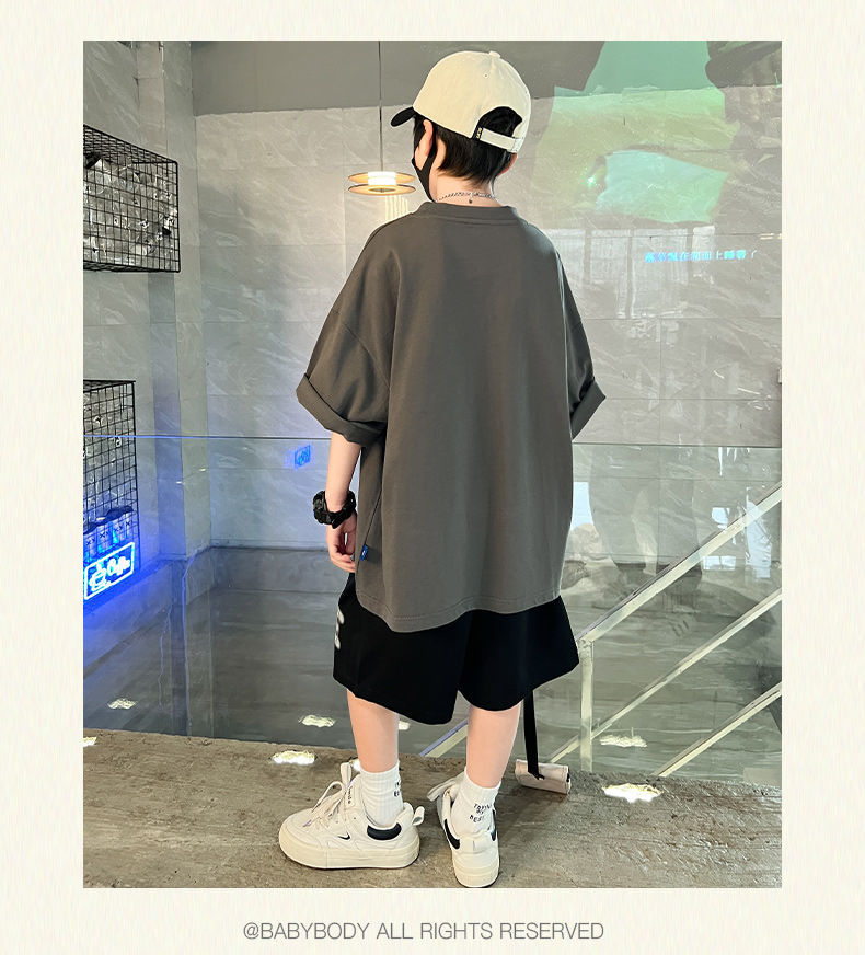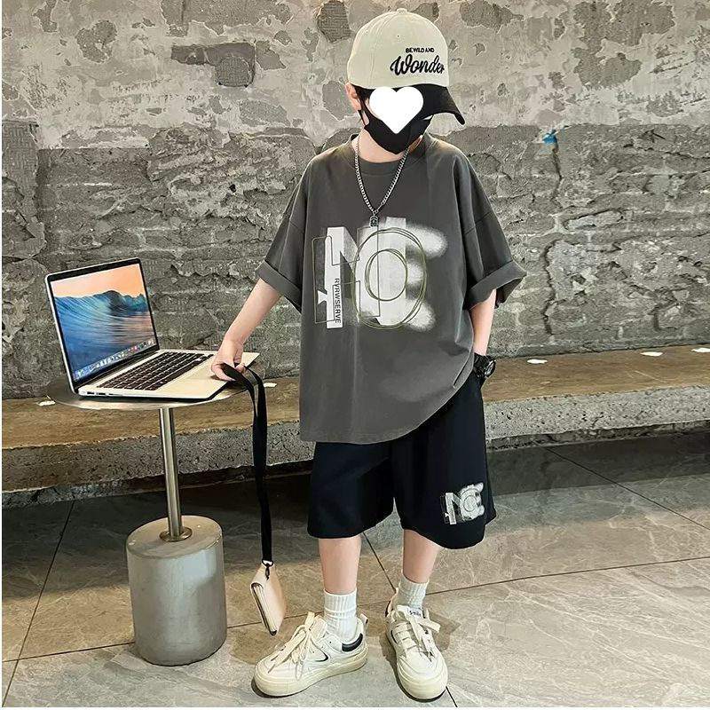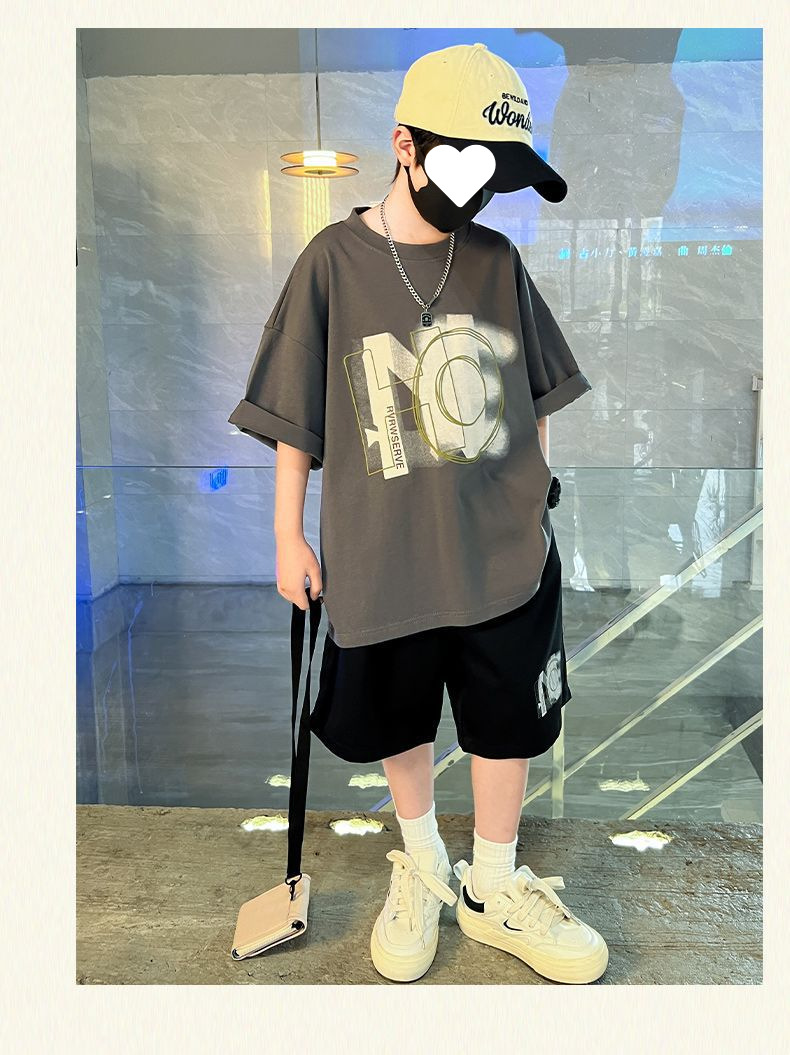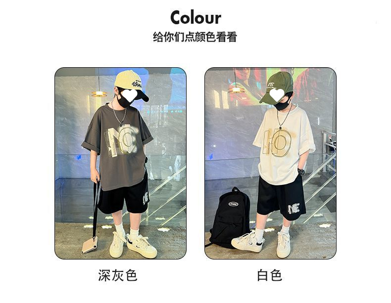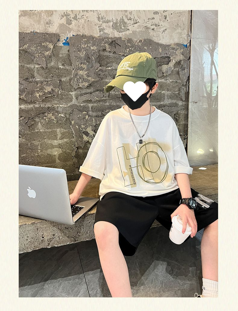 소년 여름 스포츠 세트 2024 새로운 미디어와 큰 어린이 낙서 프린트 티셔츠 다섯 번째 바지 한국식 투피스 세트 패션스토어 가기
