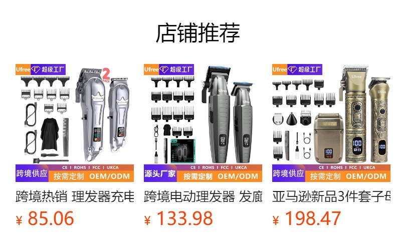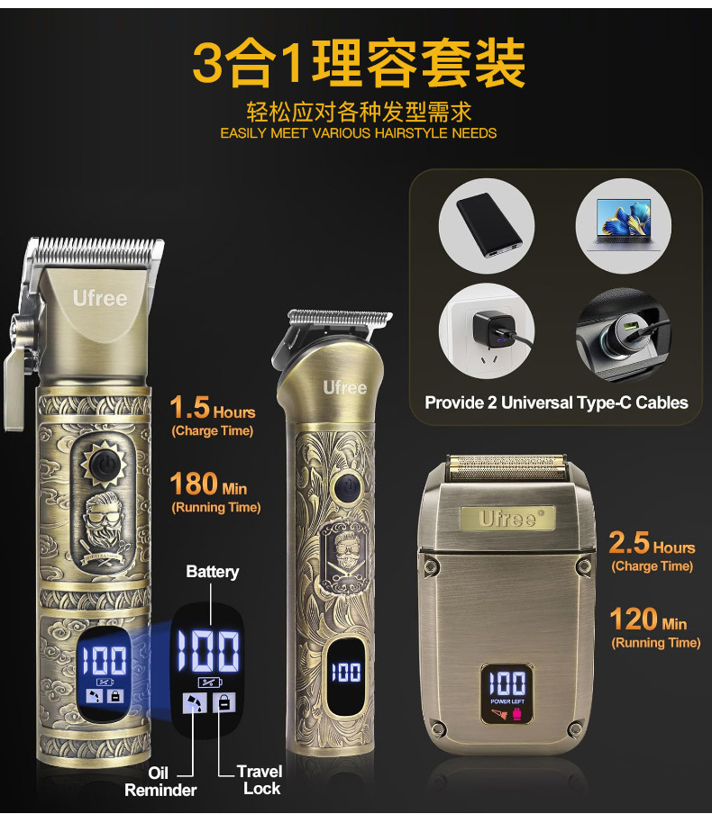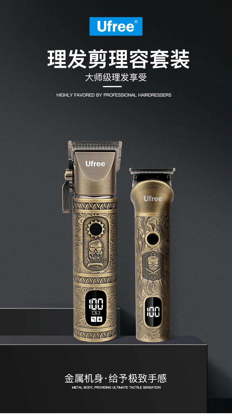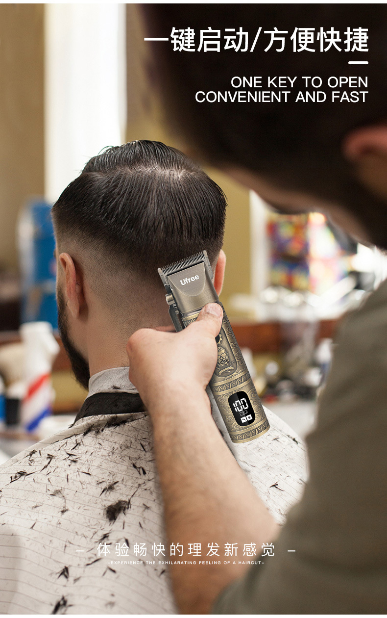 理发剪套装,高档数显电量显示直观,大锂电池续航持久;子母机套装搭配使用,大理发剪用于修剪头发, 小理发剪用于修剪油头/刻字/造型等。