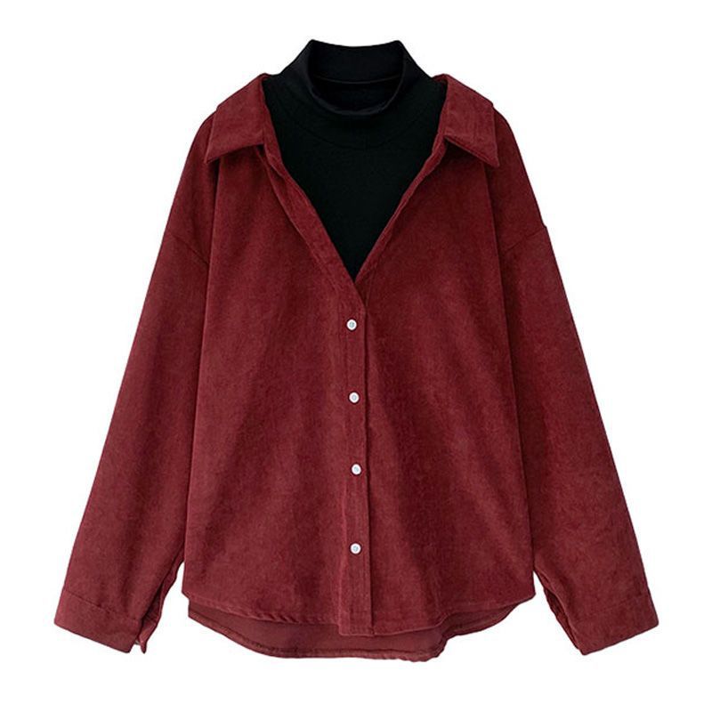 여성을위한 가짜 투피스 셔츠 봄과 가을 새로운 홍콩 스타일 복고풍 디자인 감각 틈새 탑 스택 코듀로이 바닥 셔츠