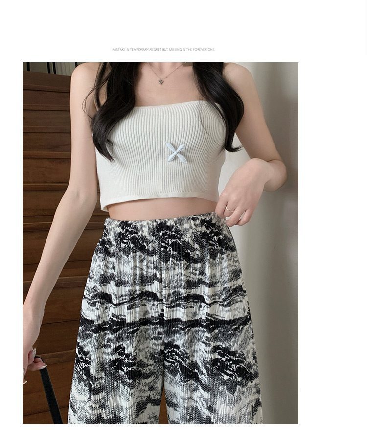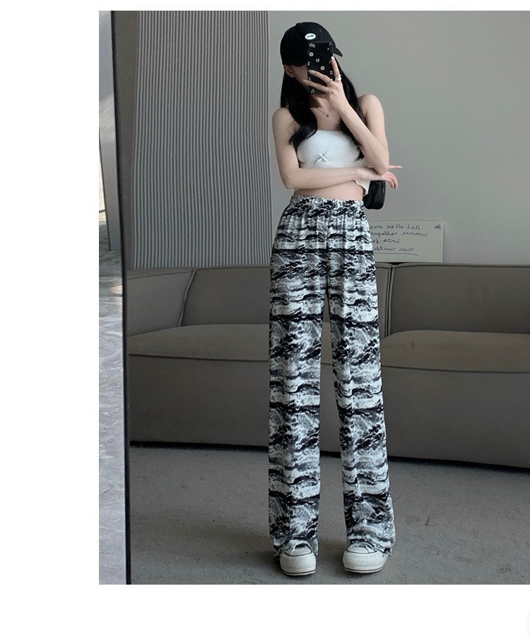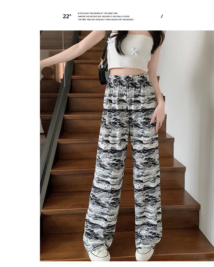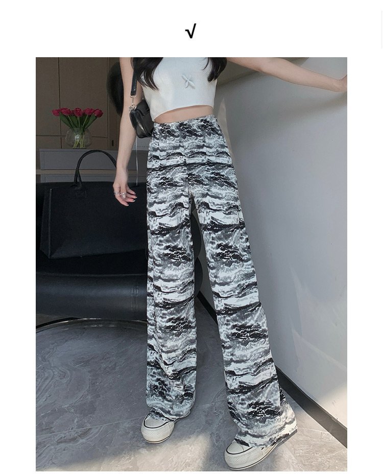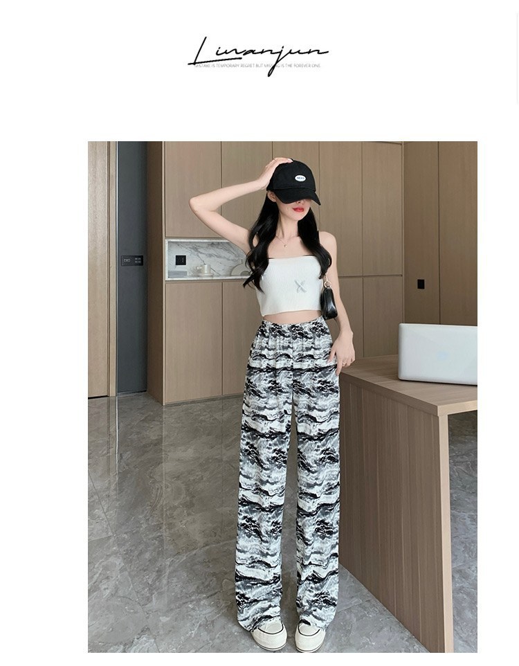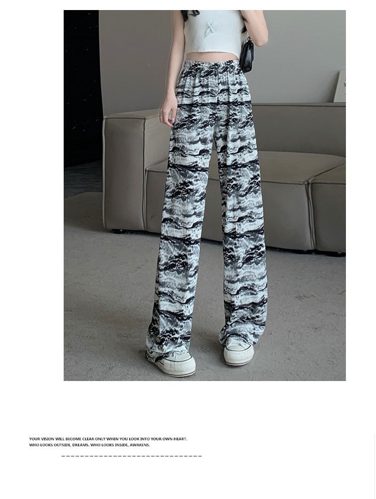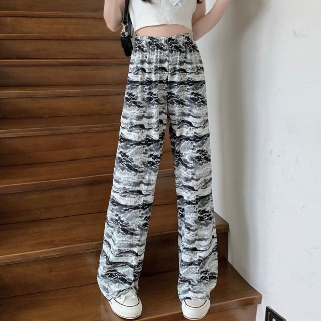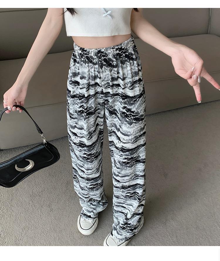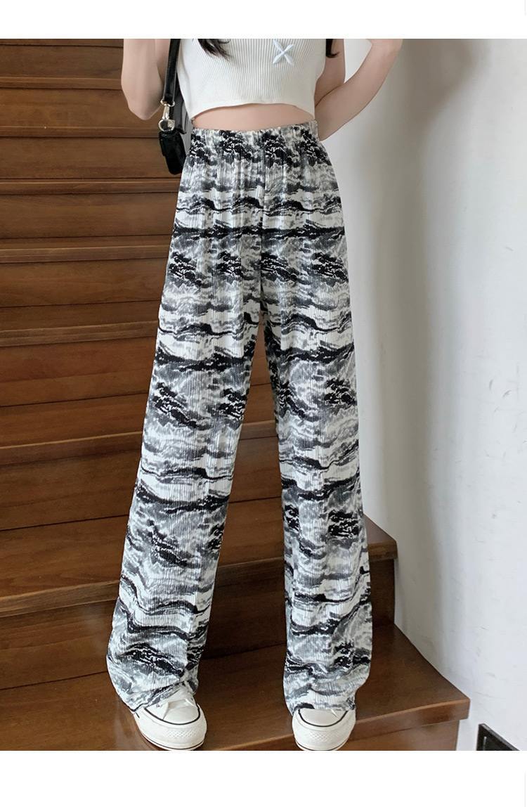 아마존 한국식 플러스 사이즈 여성용 잉크 염색 골판지 프린트 와이드 레그 팬츠 여성의 새로운 느슨한 올 매치 스트레이트 팬츠