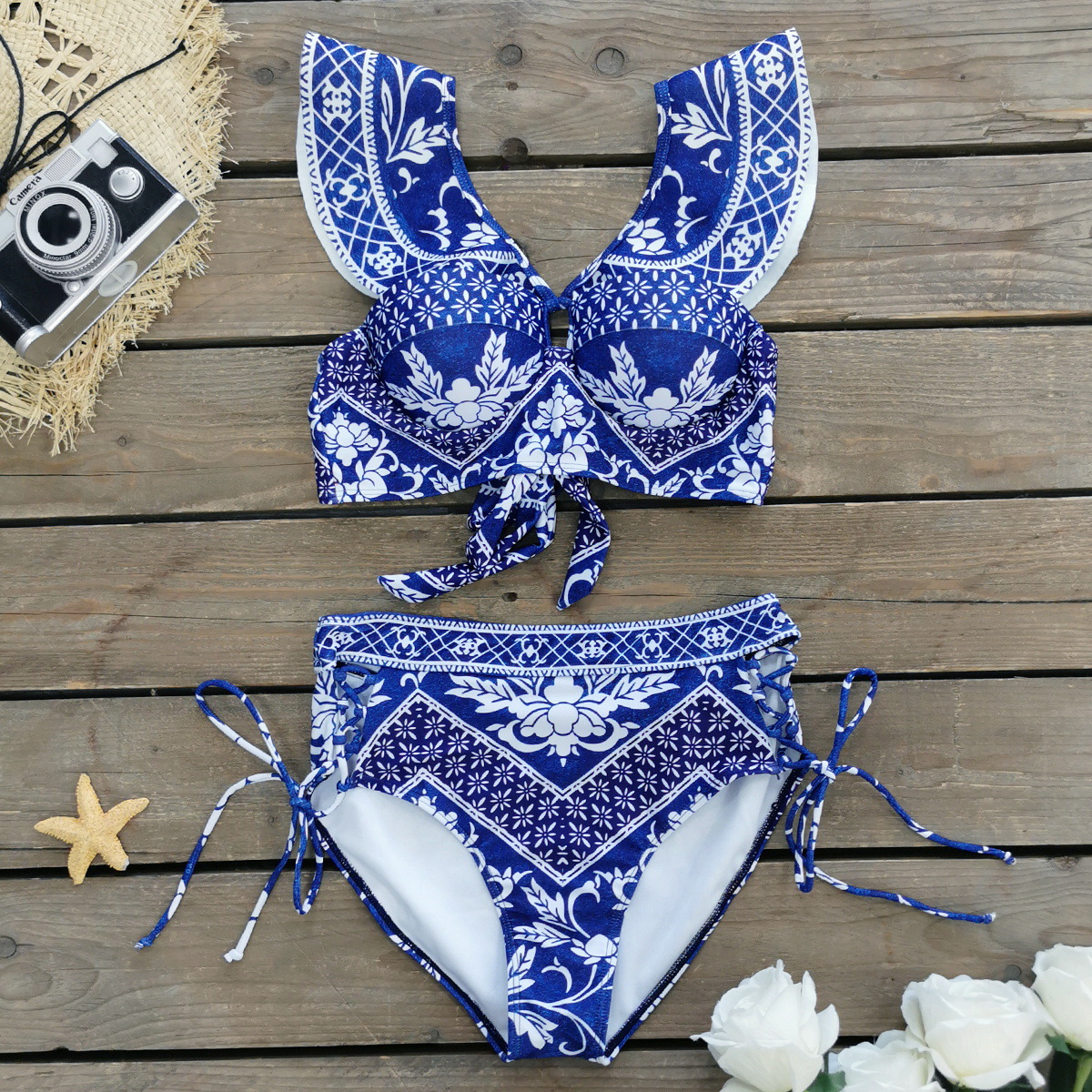 높은 허리 레이스 업 유럽과 미국의 프린트 스플릿 수영복 여성 2024 새로운 비키니 스커트 3 피스 러플 대외 무역스토어 가기