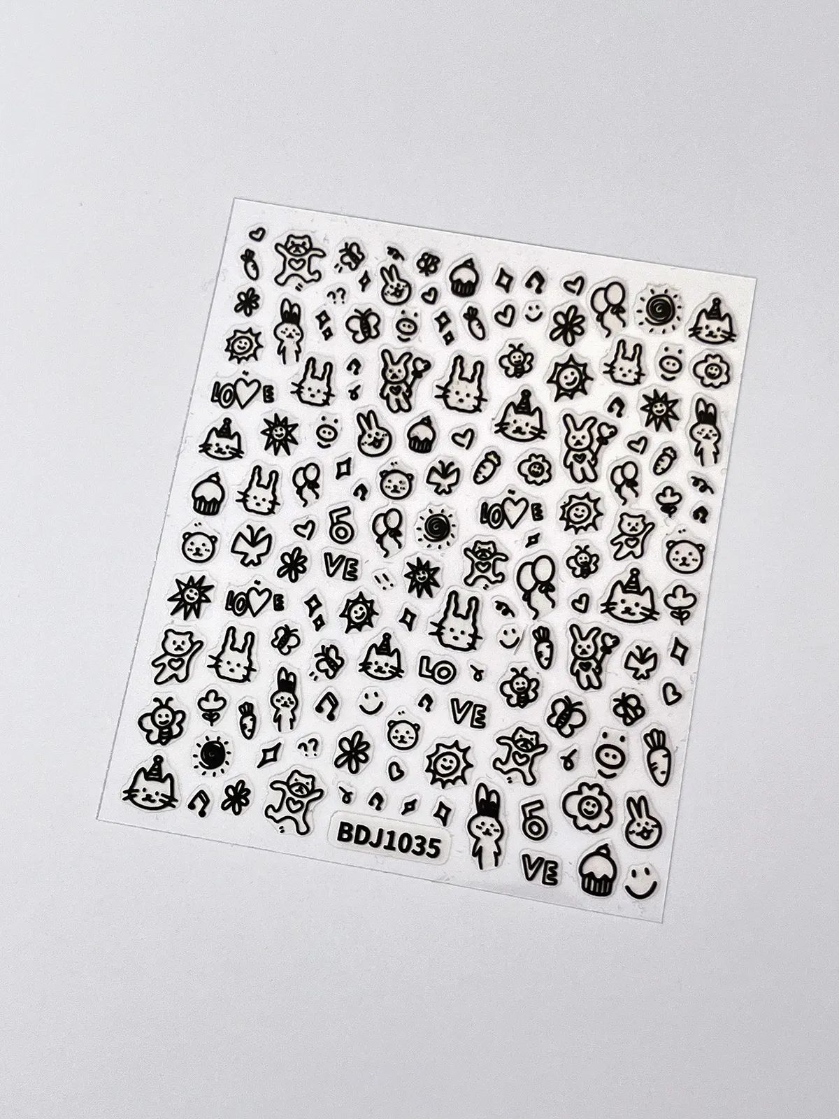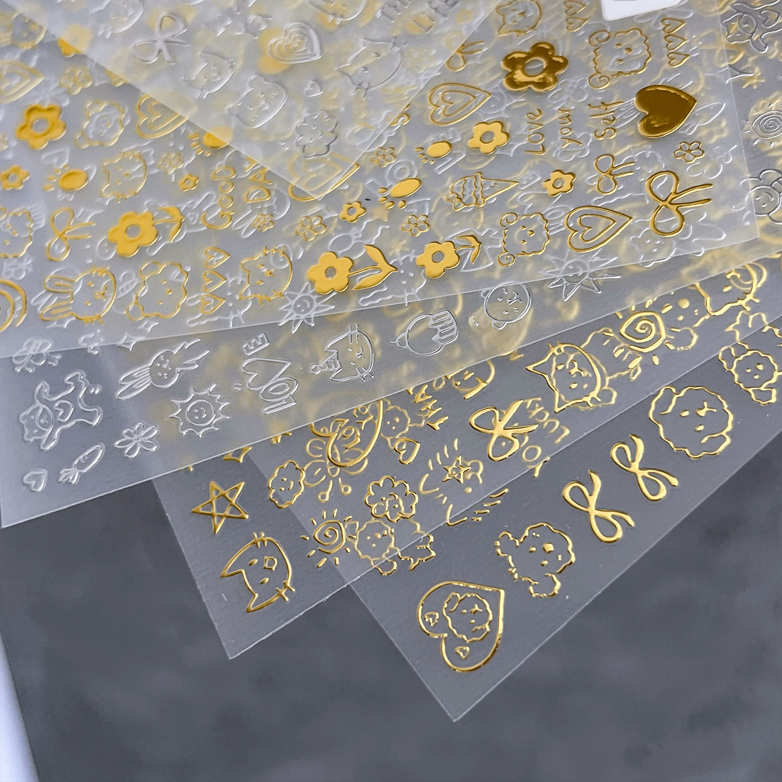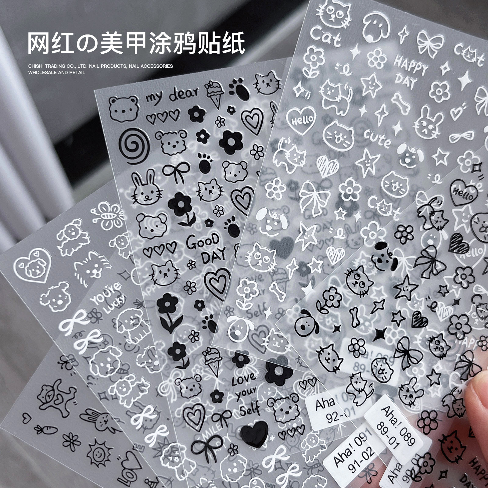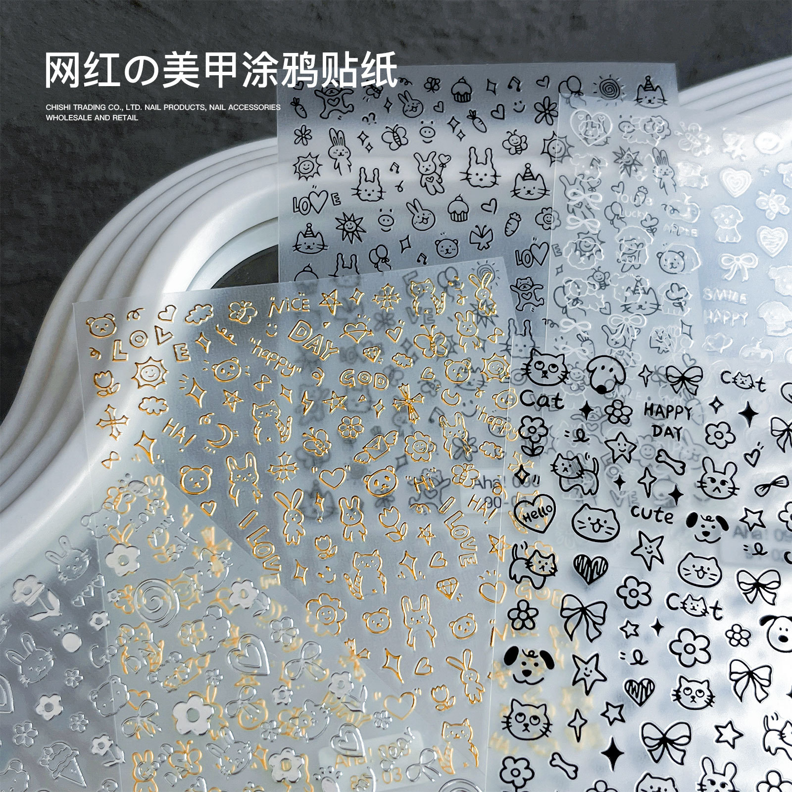 인기있는 온라인 인기있는 귀여운 네일 스티커 낙서 작은 동물 꽃 나비 패턴 얇은 거친 3 차원 네일 스티커 도매