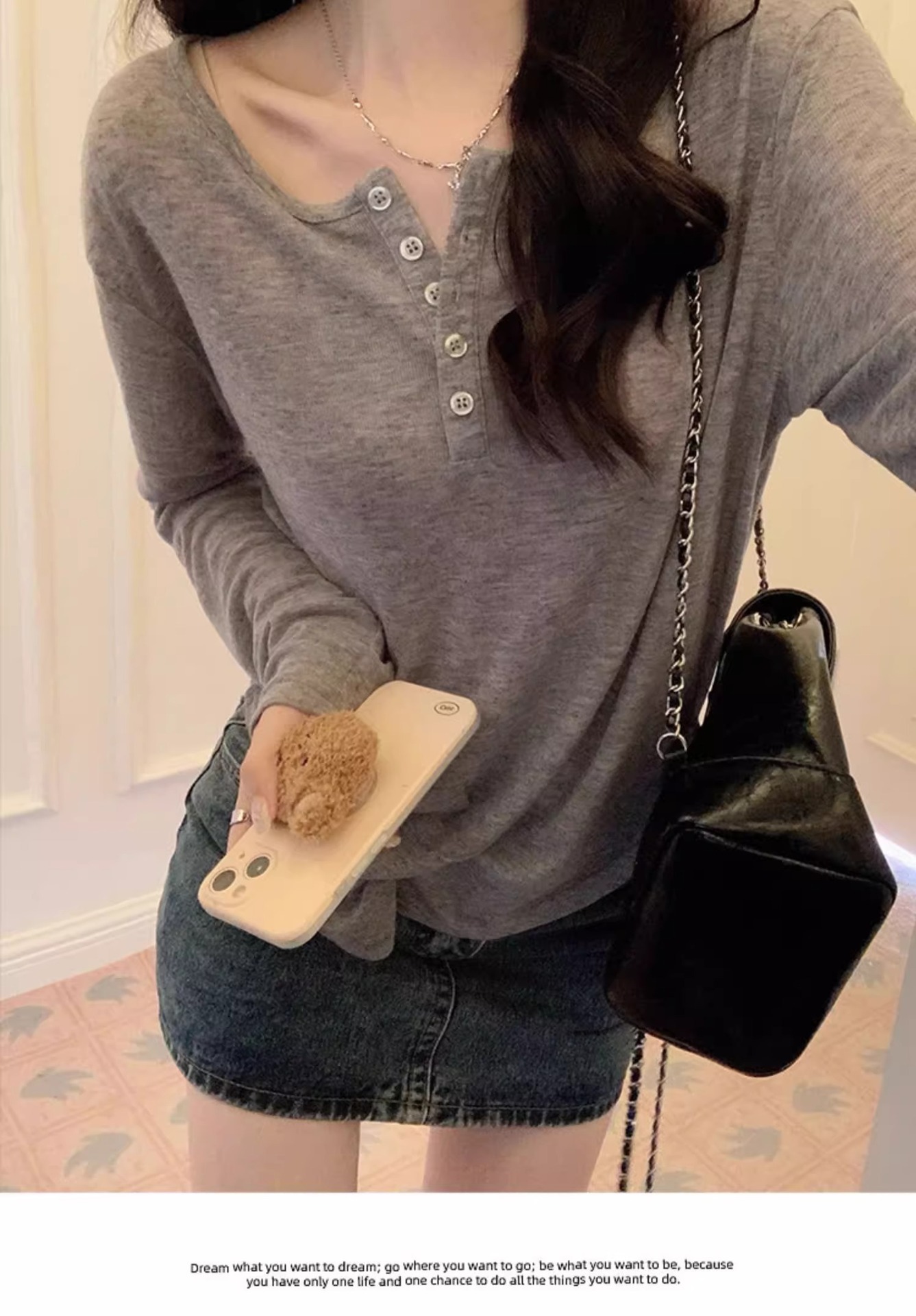 한국식 느슨한 게으른 스타일 긴팔 티셔츠 여성 봄과 여름 새로운 디자인 감각 반 오픈 칼라 섹시한 순수한 겉옷을 입고 싶어