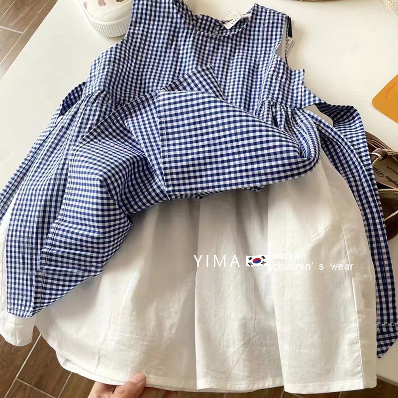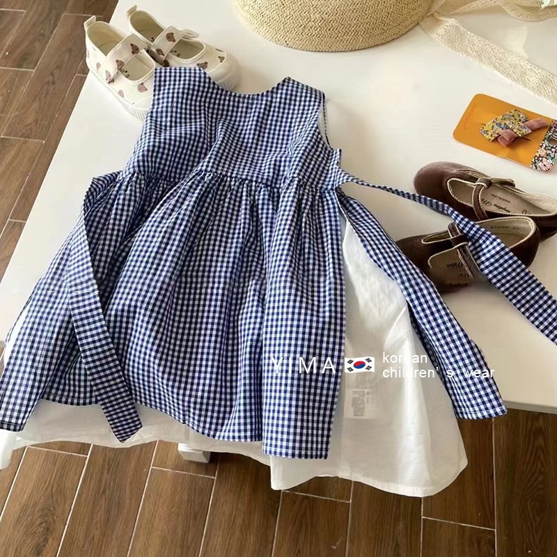 핑크 하우스 한국 아동복 2024 여름 소녀 서양식 체크 무늬 원피스 조끼 치마 어린이 귀여운 치마