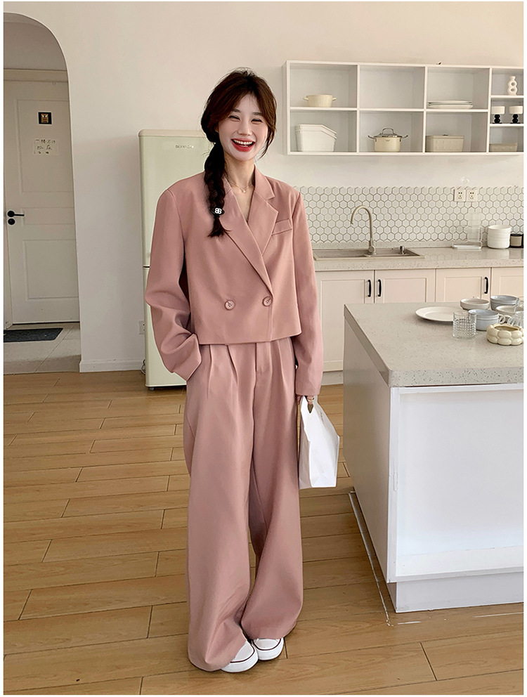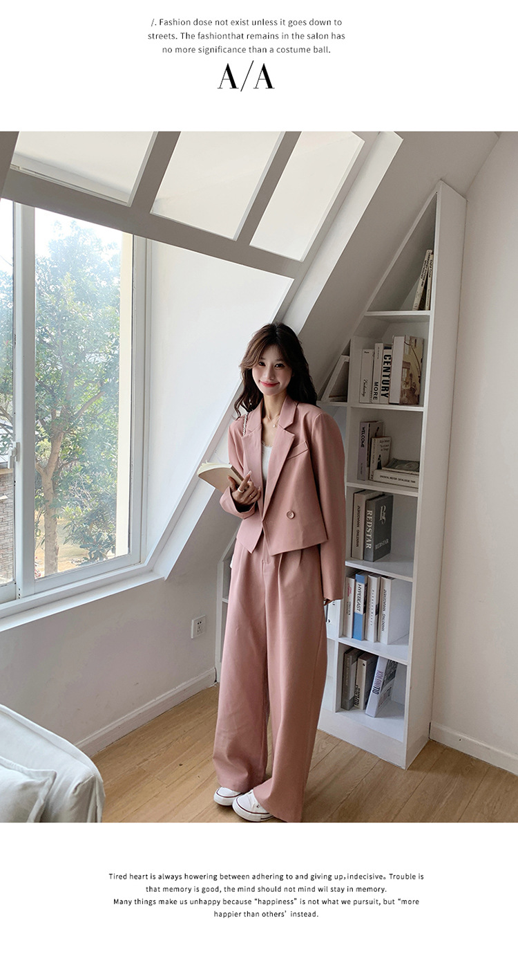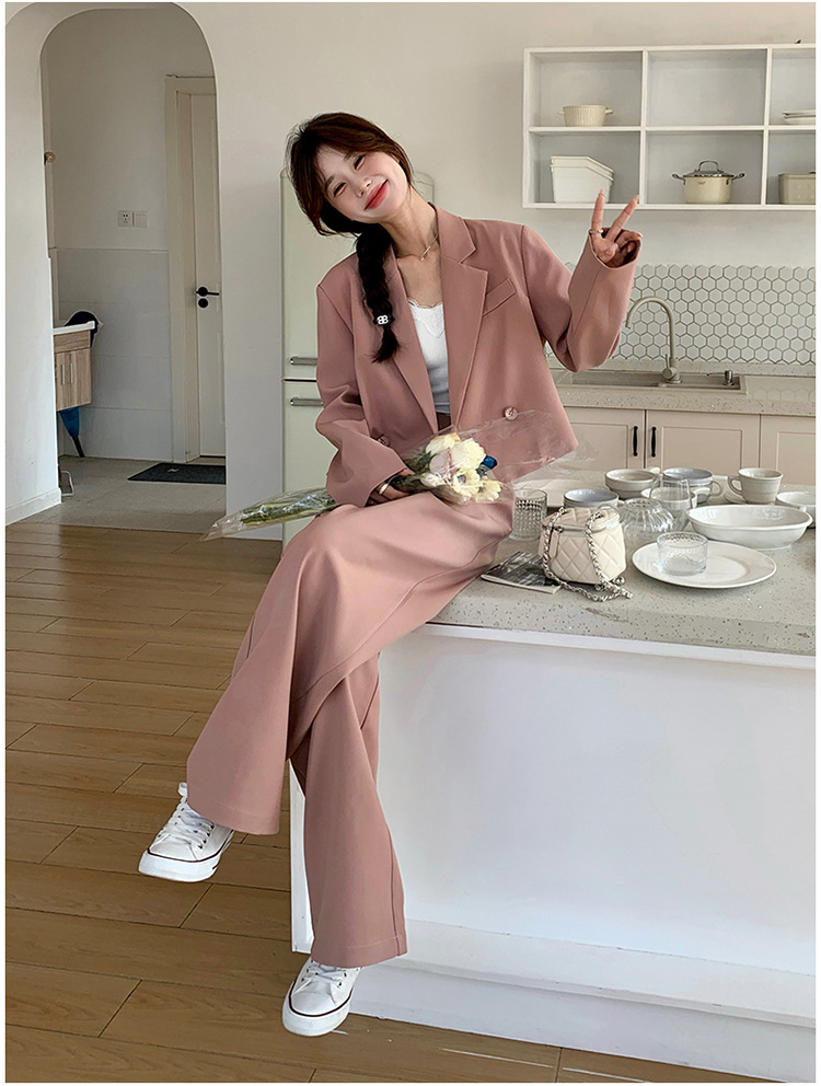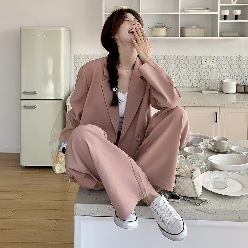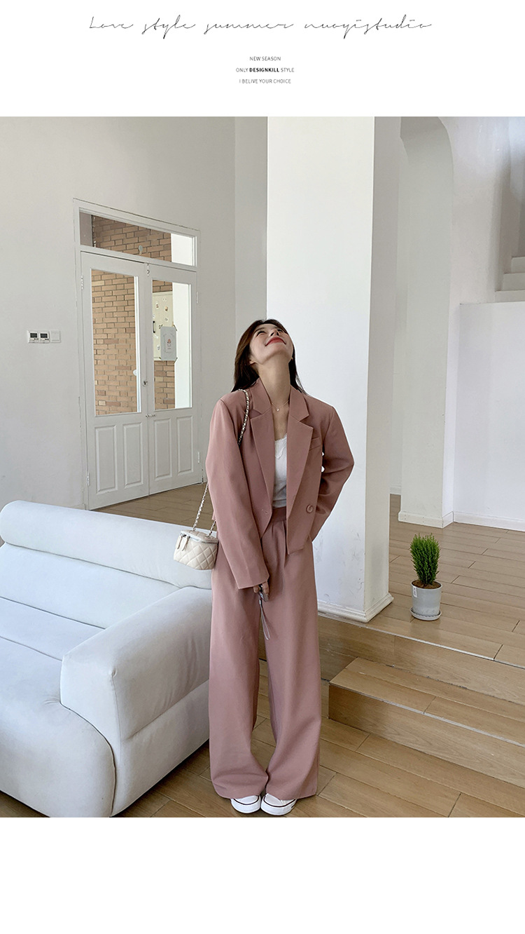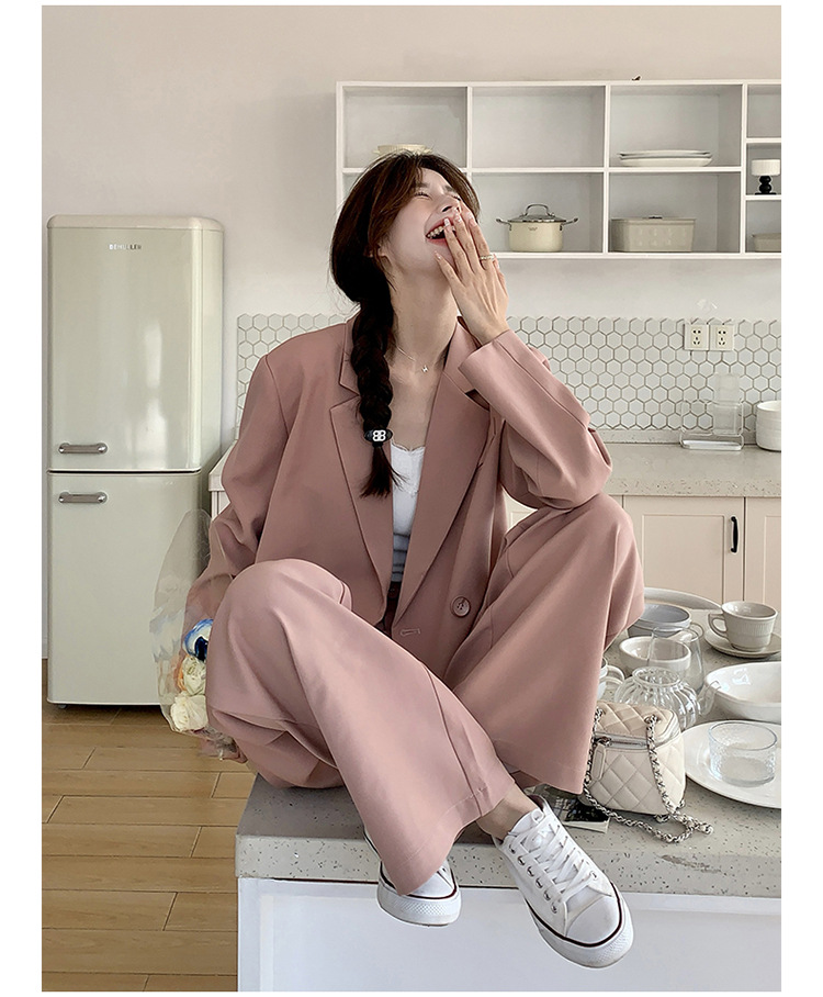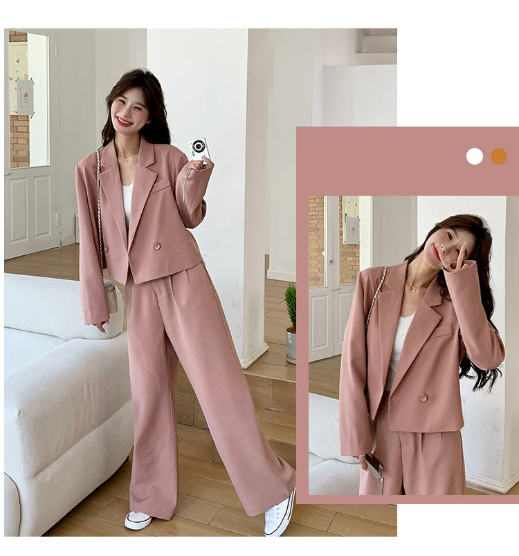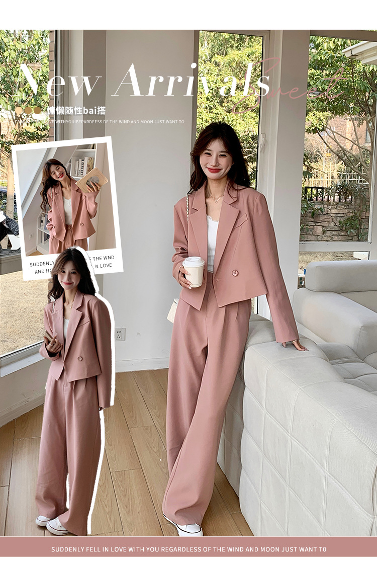 2025 봄 가을 신상 핑크색 작은 정장 재킷과 와이드 팬츠 세트 여성용 심플하고 루즈한 스타일의 통근용 투피스 세트스토어 가기