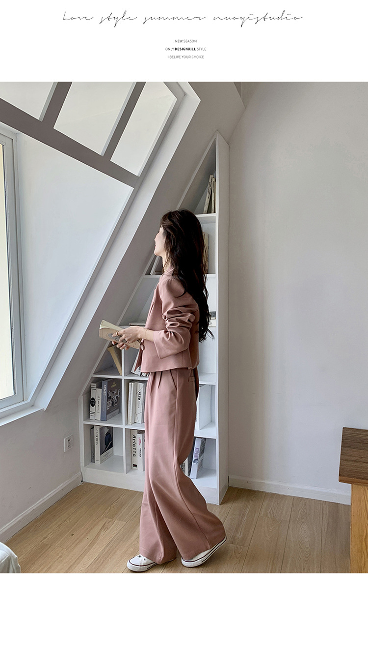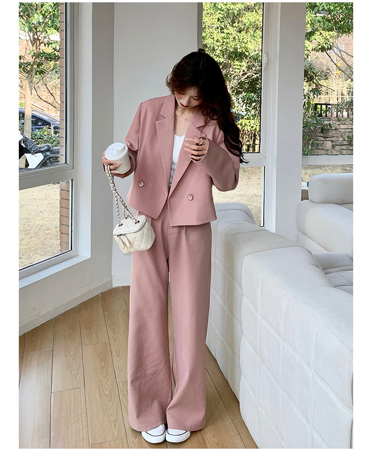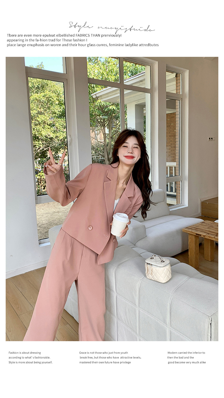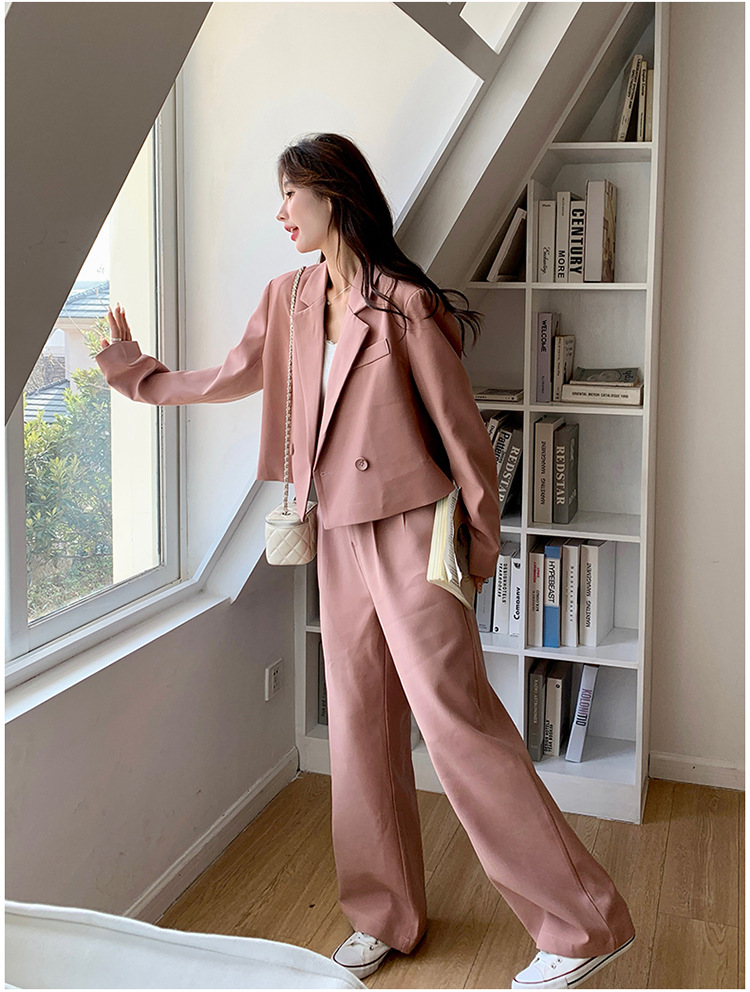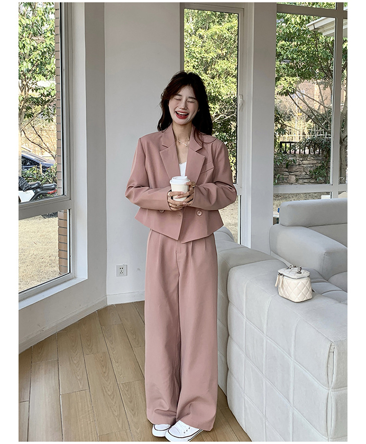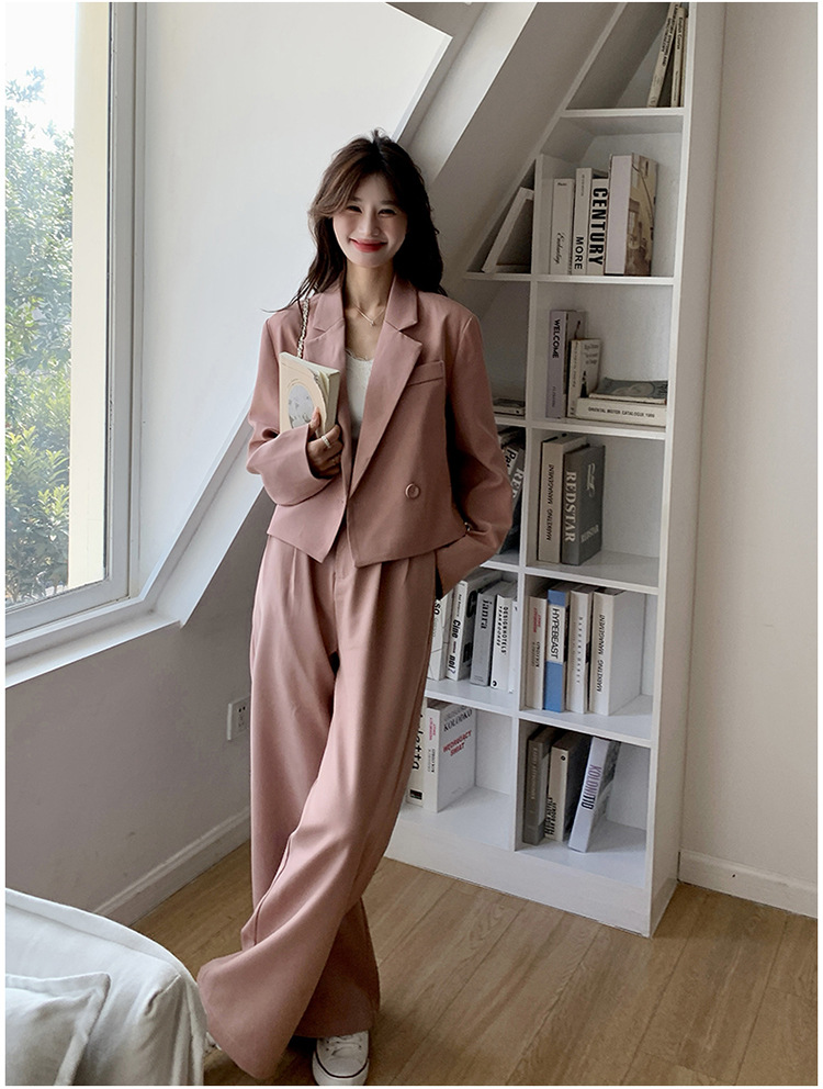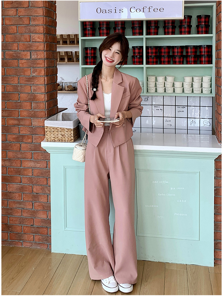 2025 봄 가을 신상 핑크색 작은 정장 재킷과 와이드 팬츠 세트 여성용 심플하고 루즈한 스타일의 통근용 투피스 세트스토어 가기