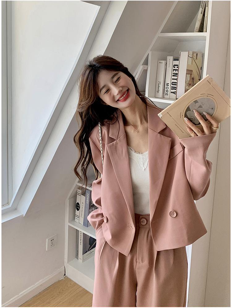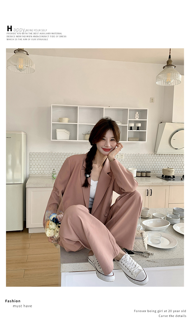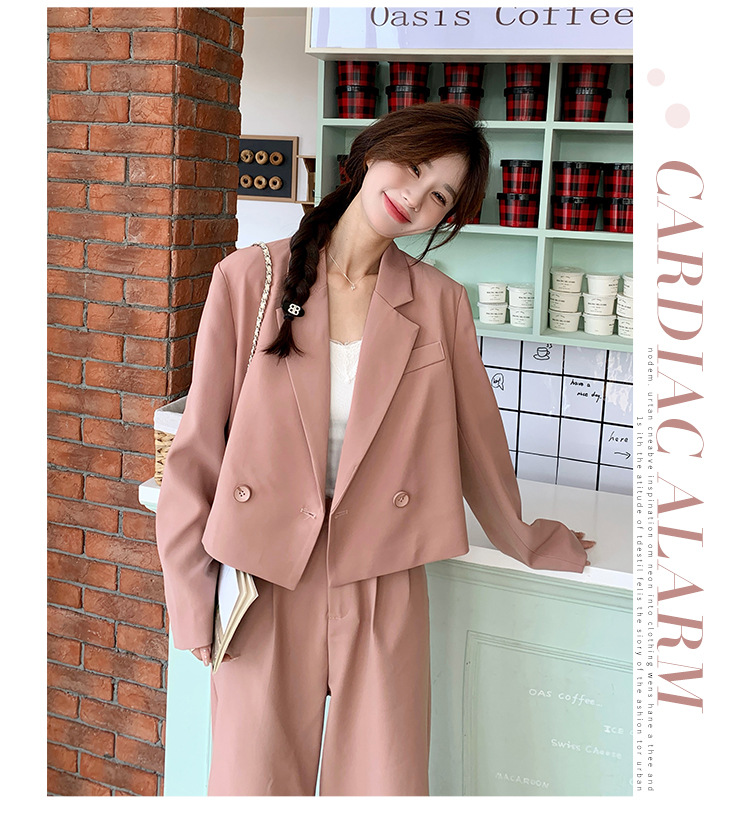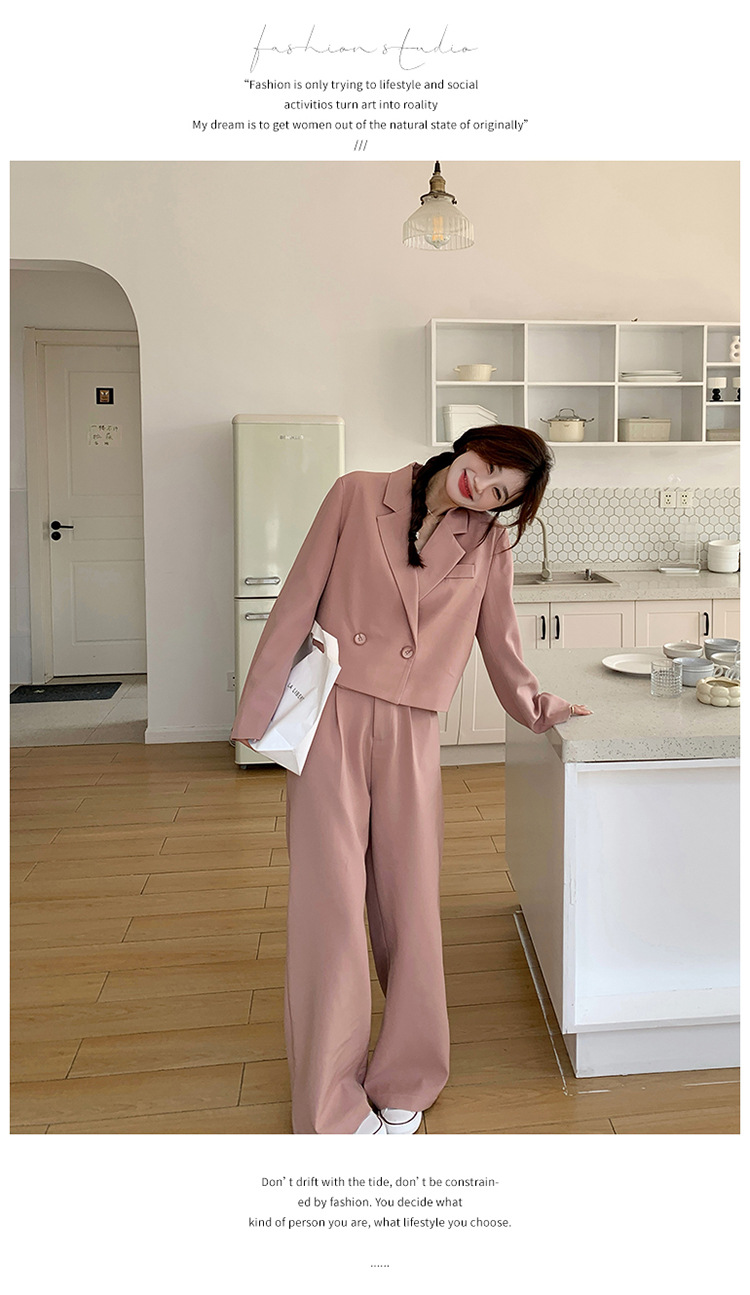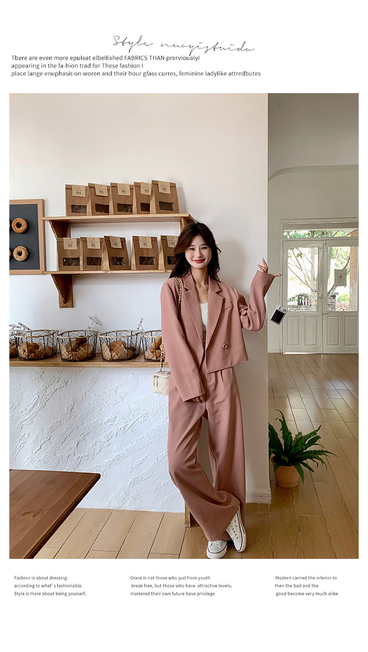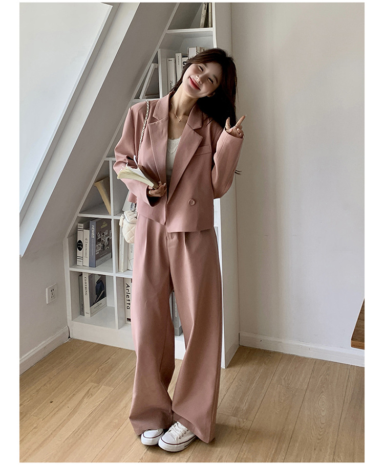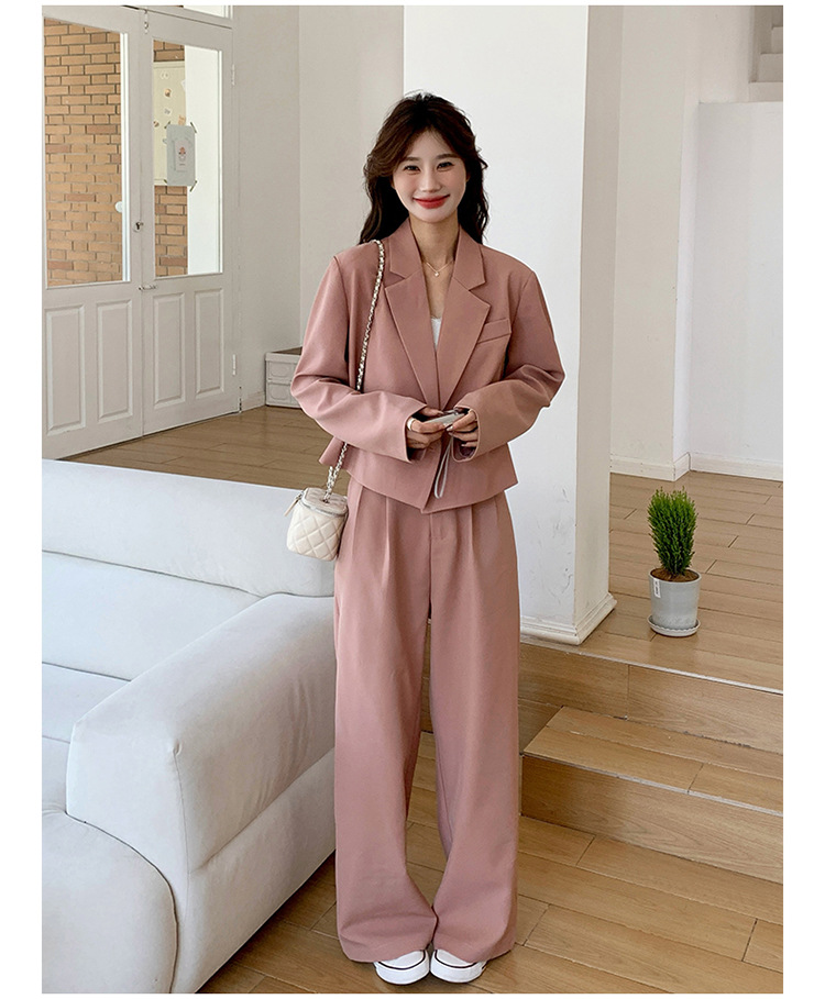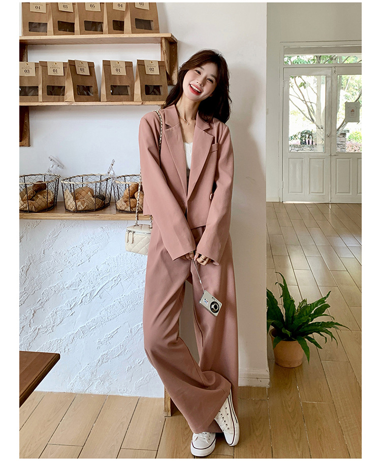 2025 봄 가을 신상 핑크색 작은 정장 재킷과 와이드 팬츠 세트 여성용 심플하고 루즈한 스타일의 통근용 투피스 세트스토어 가기