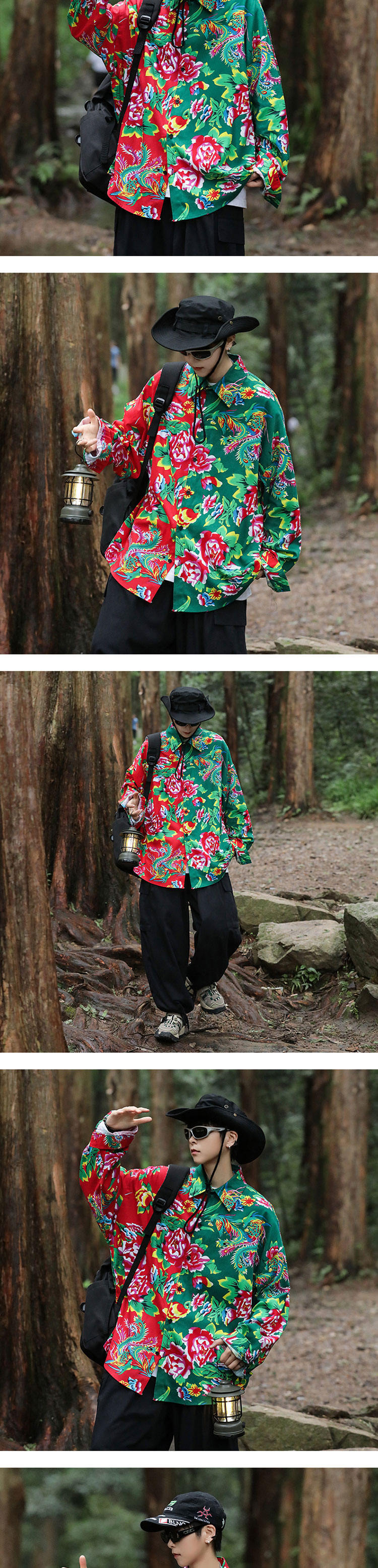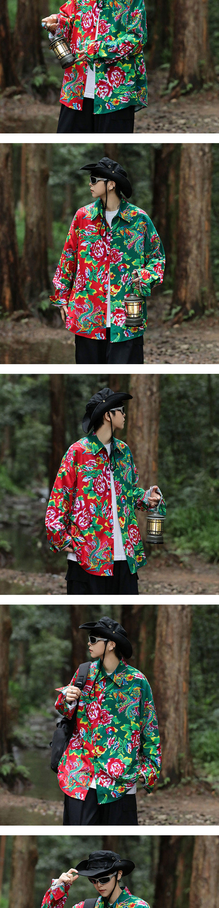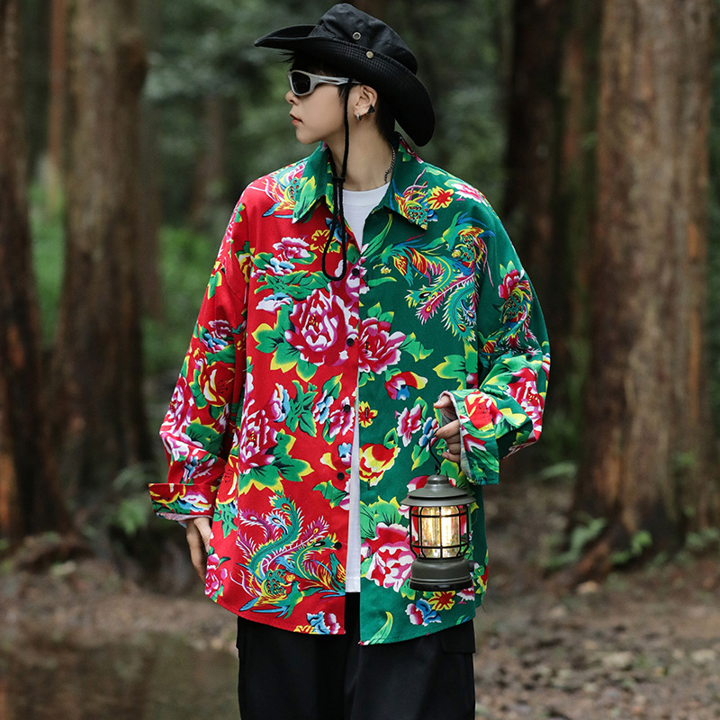 PC203 남성 캐주얼 북동부 대형 꽃 스플 라이스 긴팔 셔츠 재킷 남성과 여성의 느슨한 인치 옷 Hanfu 의상