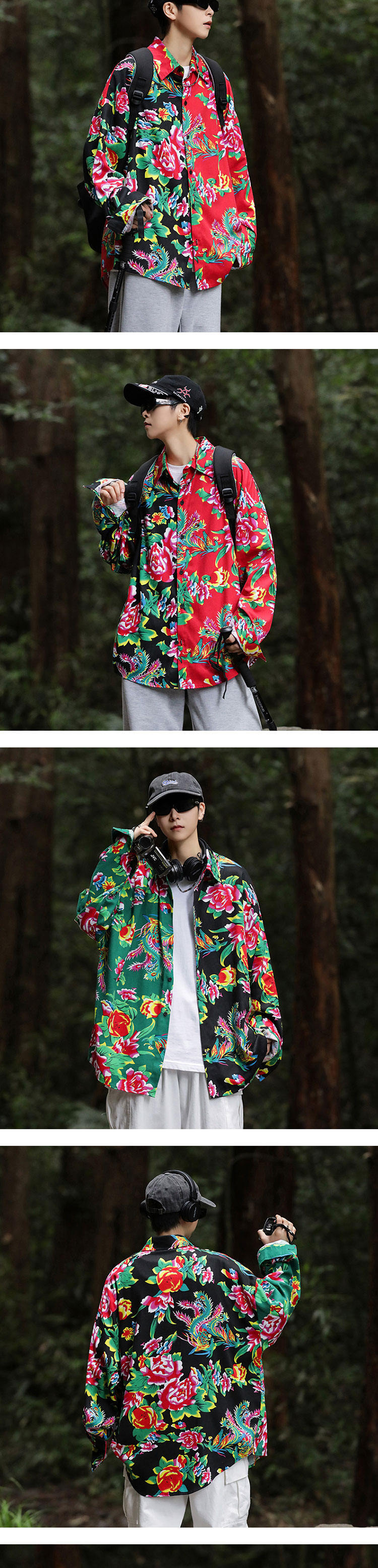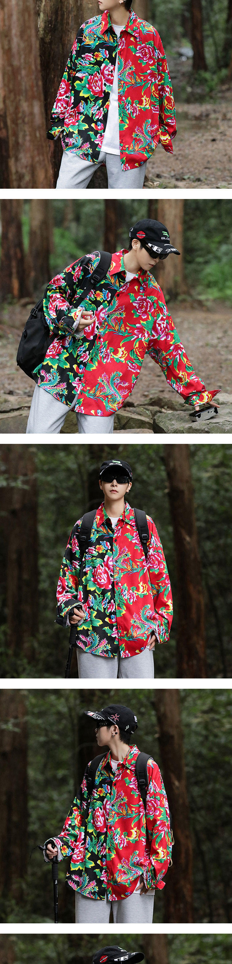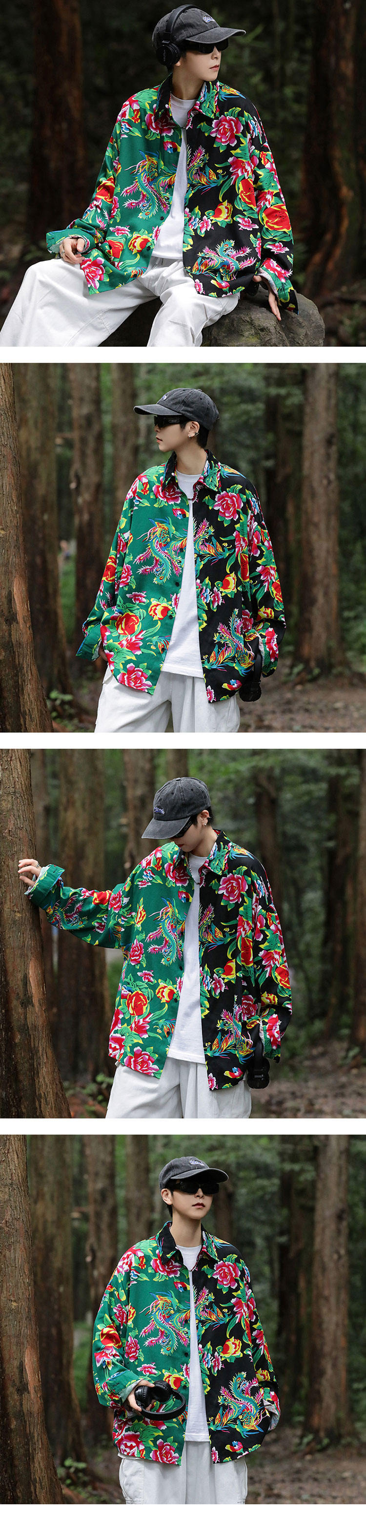 PC203 남성 캐주얼 북동부 대형 꽃 스플 라이스 긴팔 셔츠 재킷 남성과 여성의 느슨한 인치 옷 Hanfu 의상