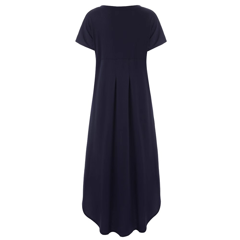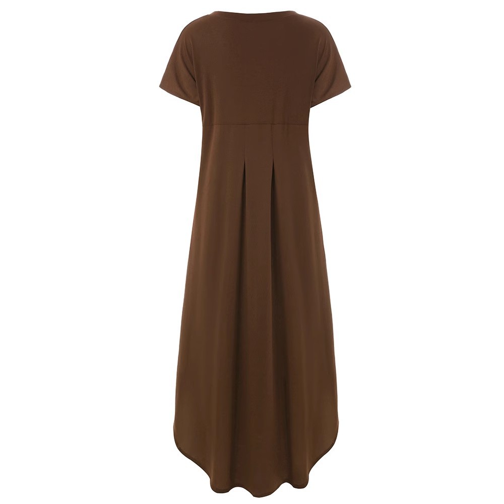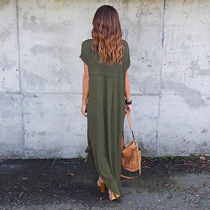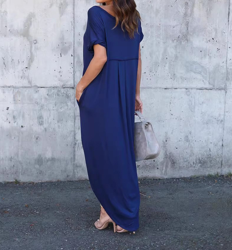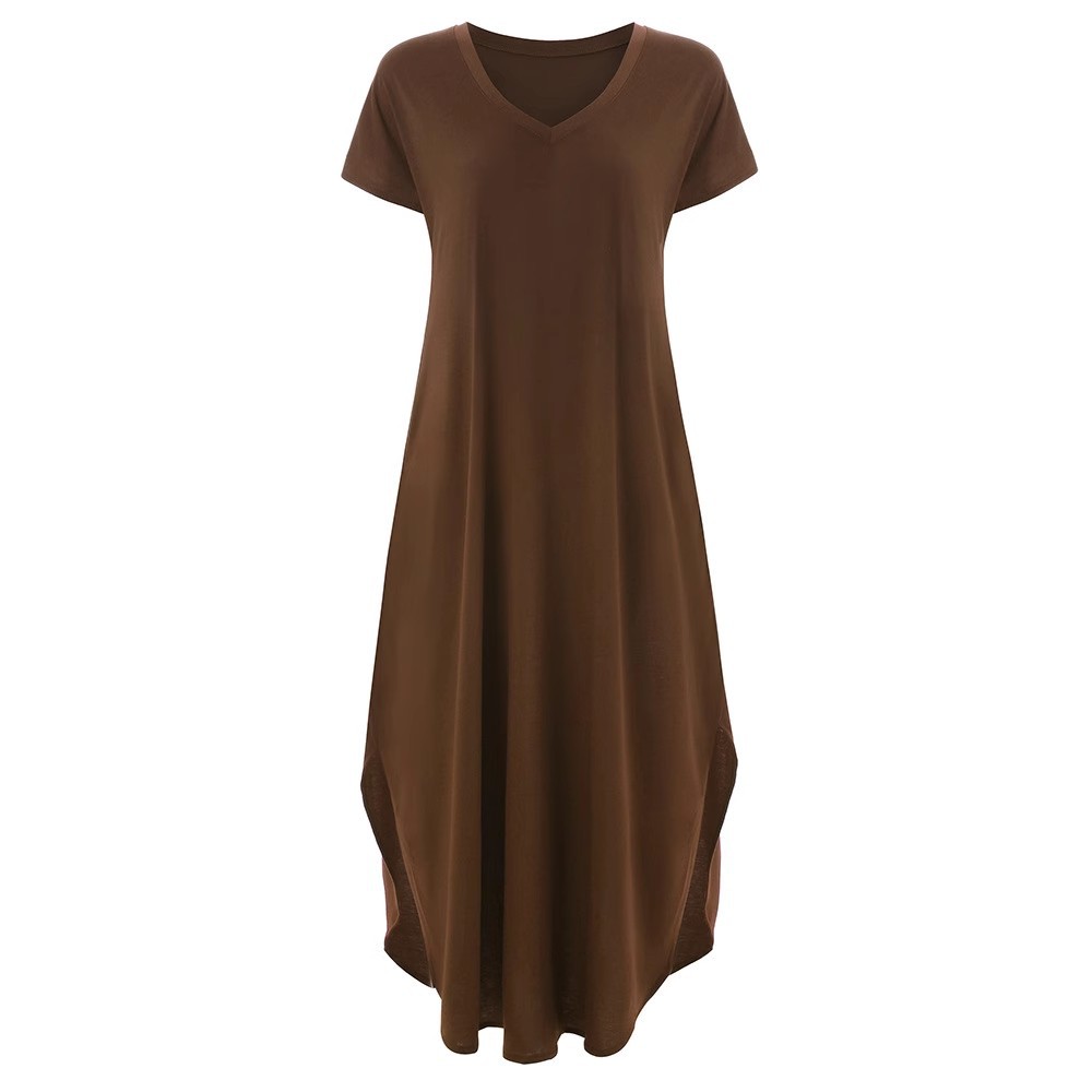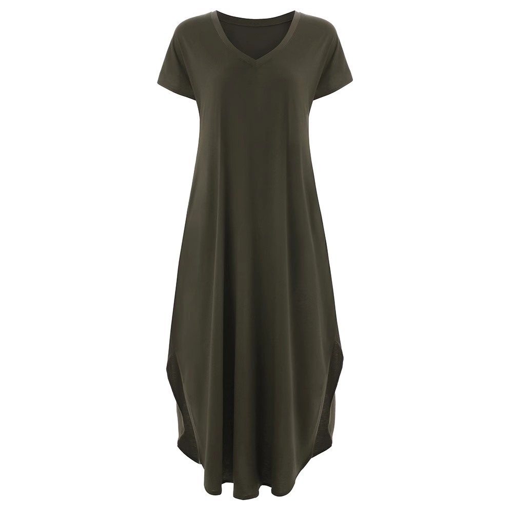2024 AliExpress 아마존 유럽과 미국의 단색 스티칭 짧은 소매 V-neck 스플릿 큰 스윙 원피스 원피스 재고스토어 가기