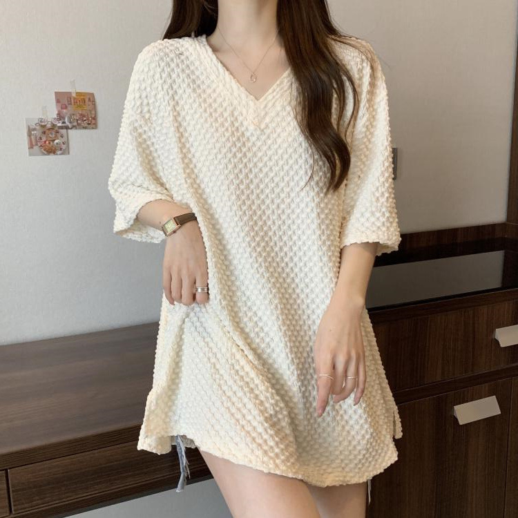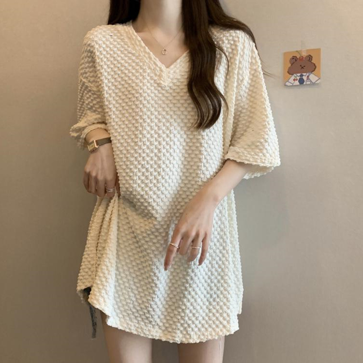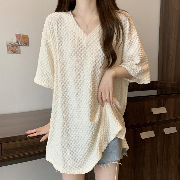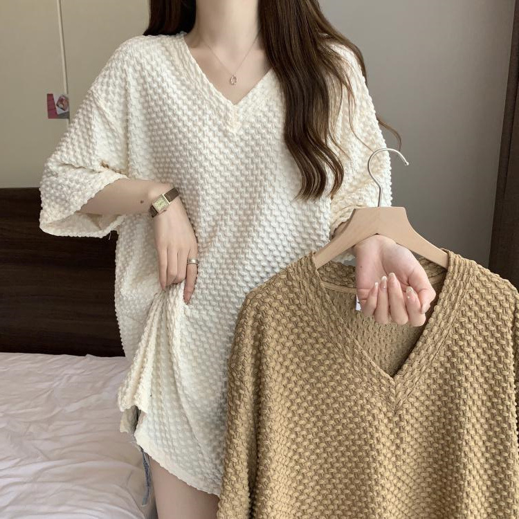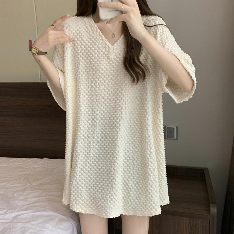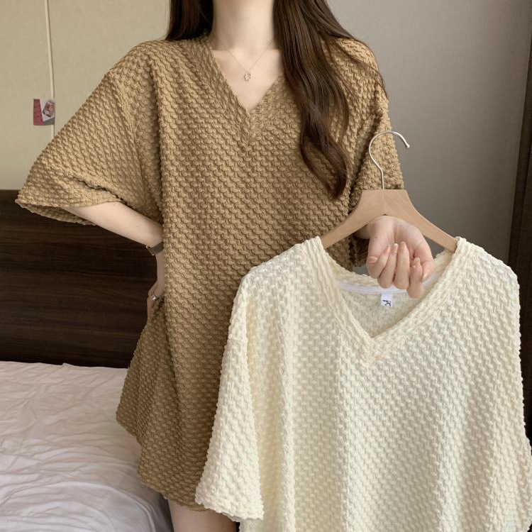 게으른 스타일 플러스 사이즈 단색 V 넥 짧은 소매 티셔츠 여성용 지방 MM300 kg 여름 조커 느슨한 긴 코트스토어 가기