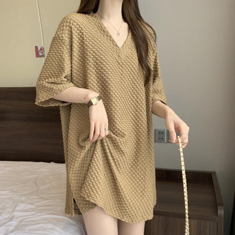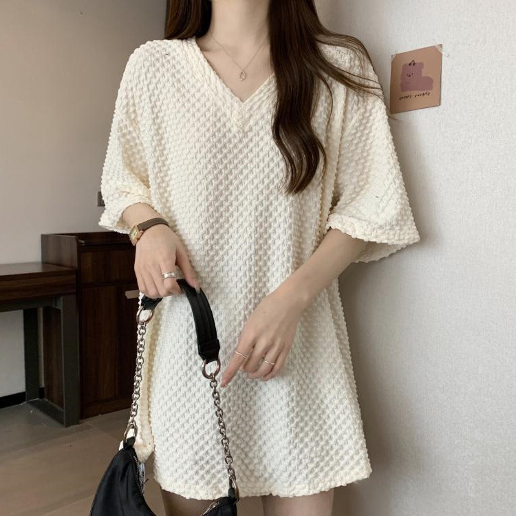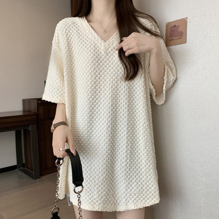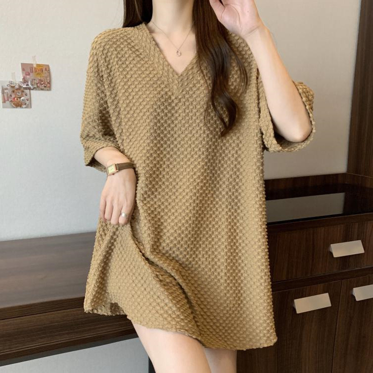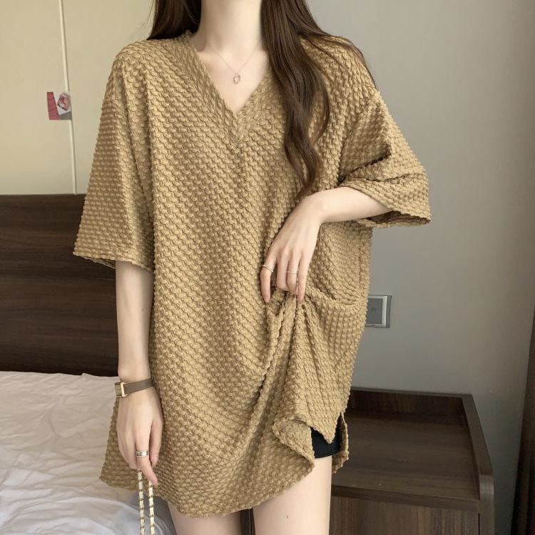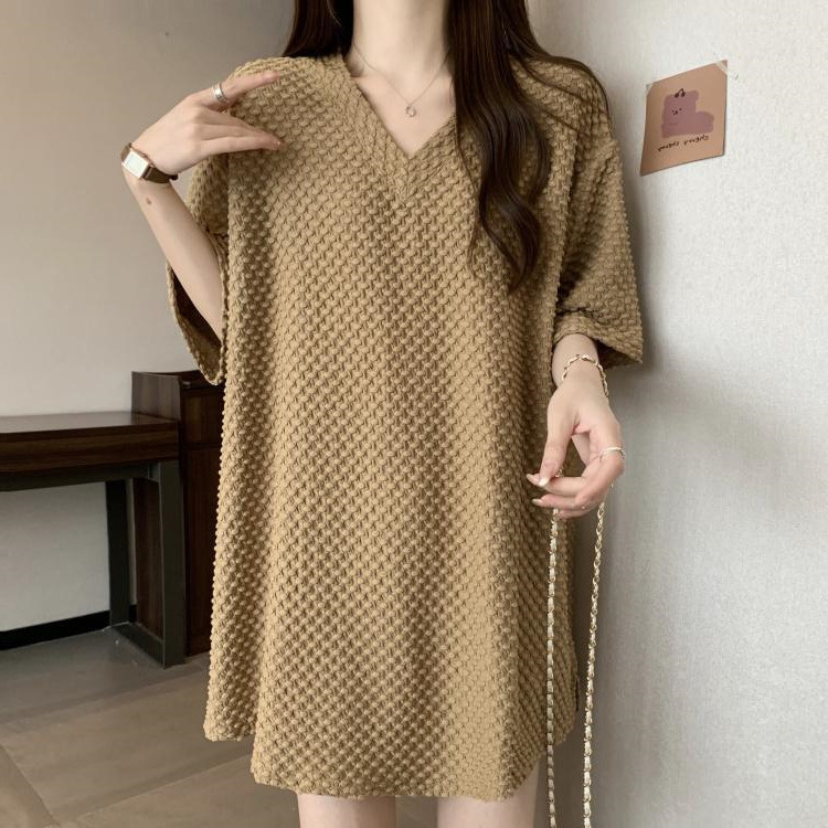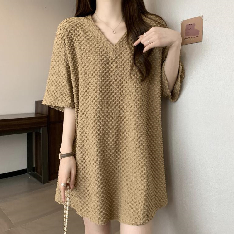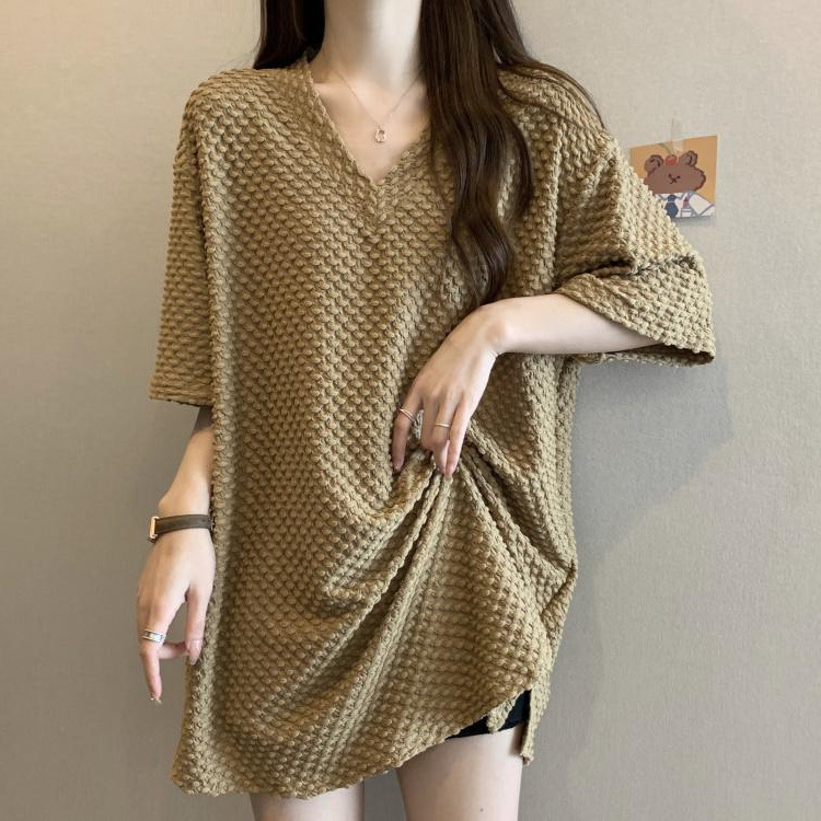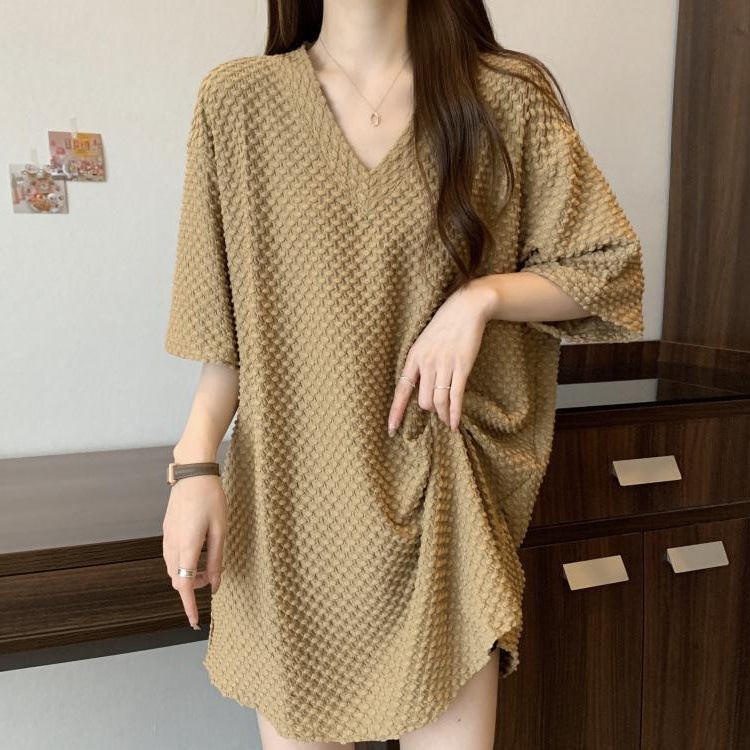 게으른 스타일 플러스 사이즈 단색 V 넥 짧은 소매 티셔츠 여성용 지방 MM300 kg 여름 조커 느슨한 긴 코트