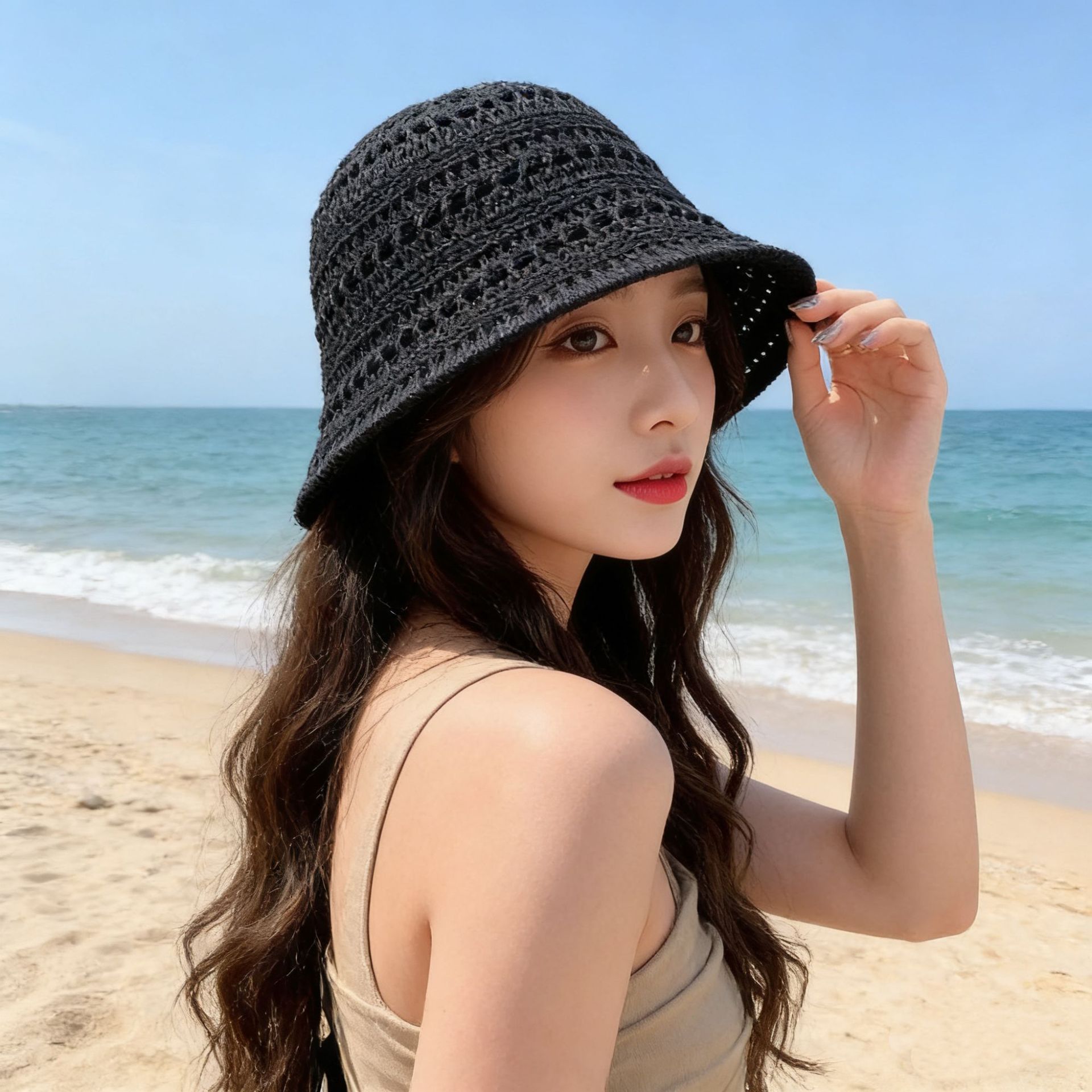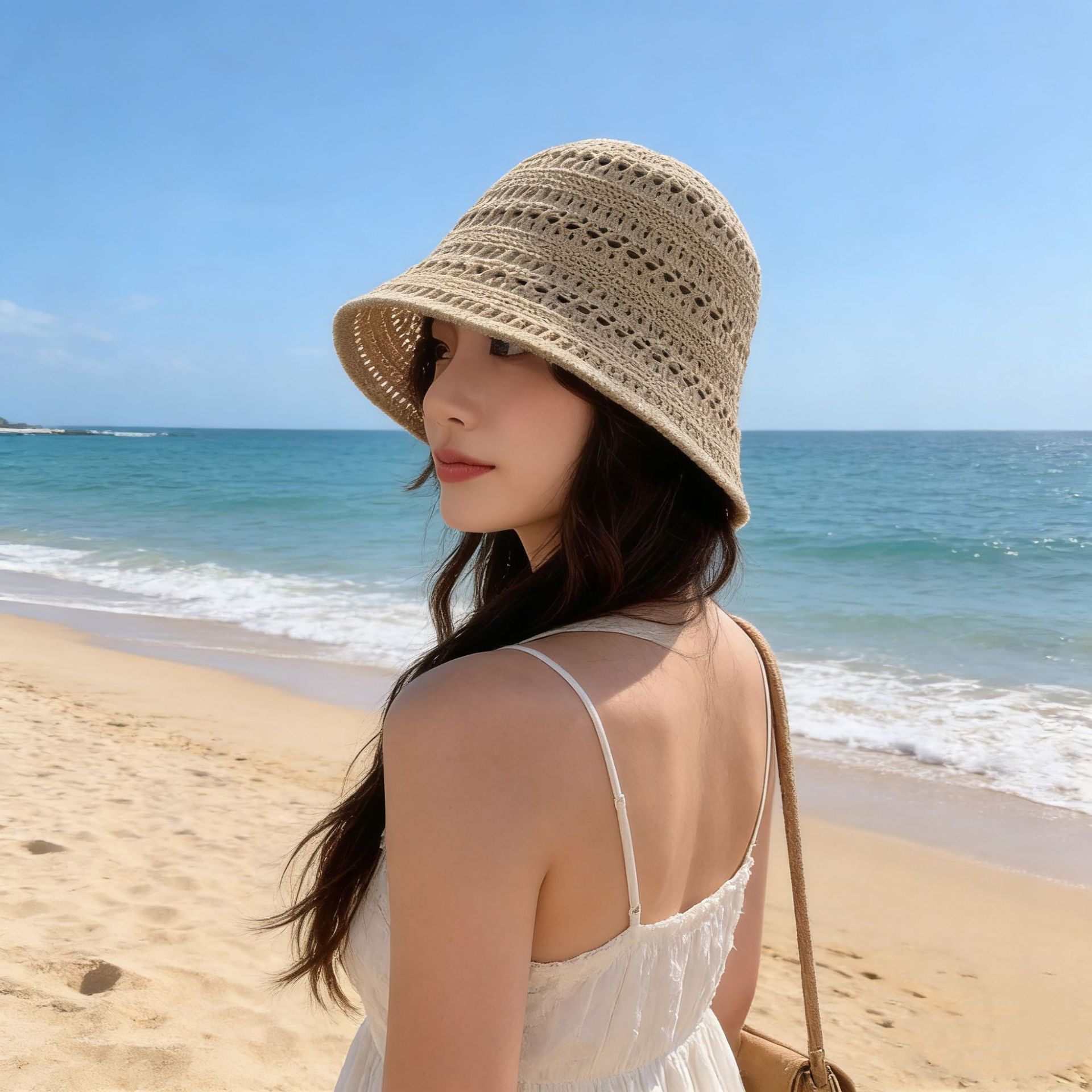 여름 한국식 여성용 자외선 차단 모자, 접이식 속이 빈 밀짚 어부 모자, 야외 해변용 태양 모자