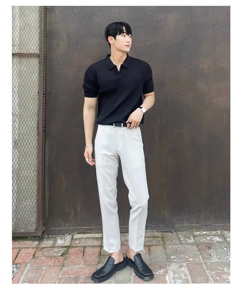 여름 아이스 실크 스웨터 반소매 줄무늬 옷깃 남성 캐주얼 POLO 라이트 익숙한 영국 스타일 반팔스토어 가기