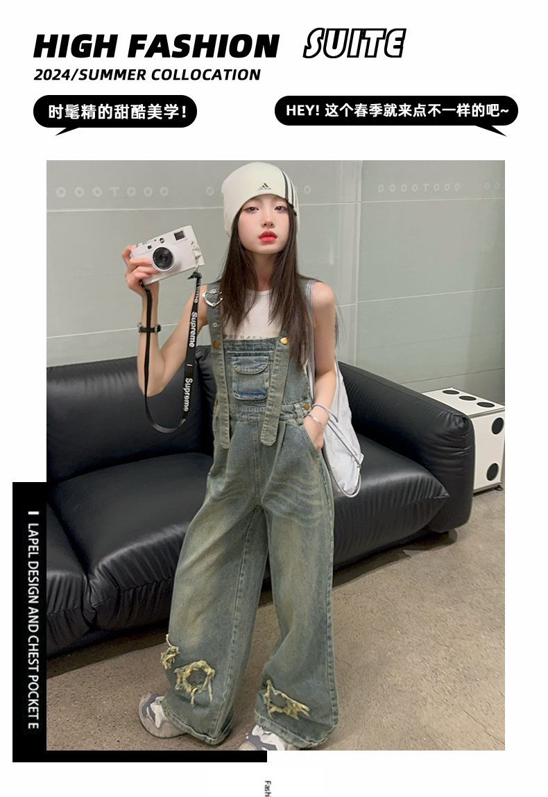 소녀의 2024 미국식 복고풍 데님 서스펜더 바지 유행 느슨한 슬리밍 스트레이트 캐주얼 와이드 레그 걸레 바지 유행스토어 가기