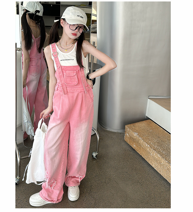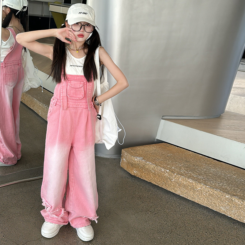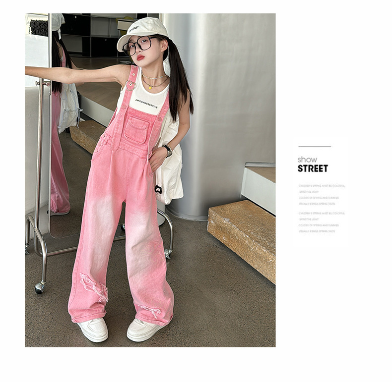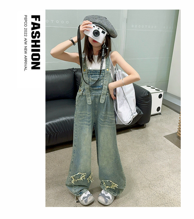 소녀의 2024 미국식 복고풍 데님 서스펜더 바지 유행 느슨한 슬리밍 스트레이트 캐주얼 와이드 레그 걸레 바지 유행