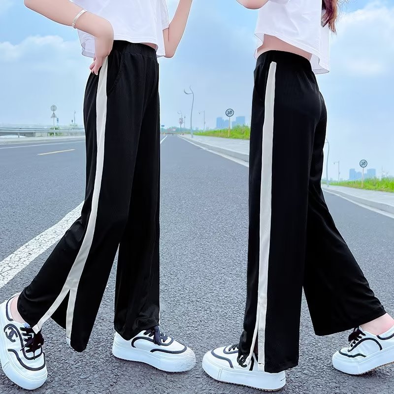소녀 아이스 실크 와이드 레그 팬츠 2024 아동복 여름 뉴 미디어와 대형 아동복 홍콩 스타일 트렌디 스플릿 캐주얼 롱 팬츠