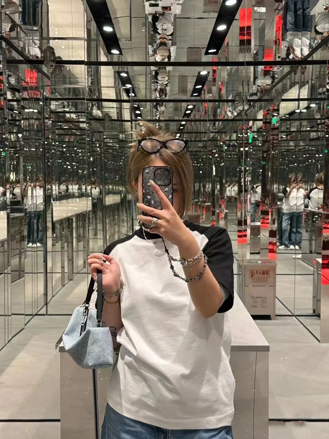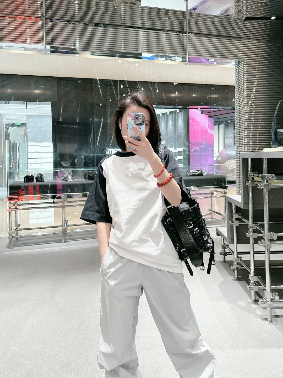 Xiaozhong 2024 봄과 여름 새로운 흑백 라운드 넥 반팔 느슨한 패션 여성용 반팔 티셔츠스토어 가기