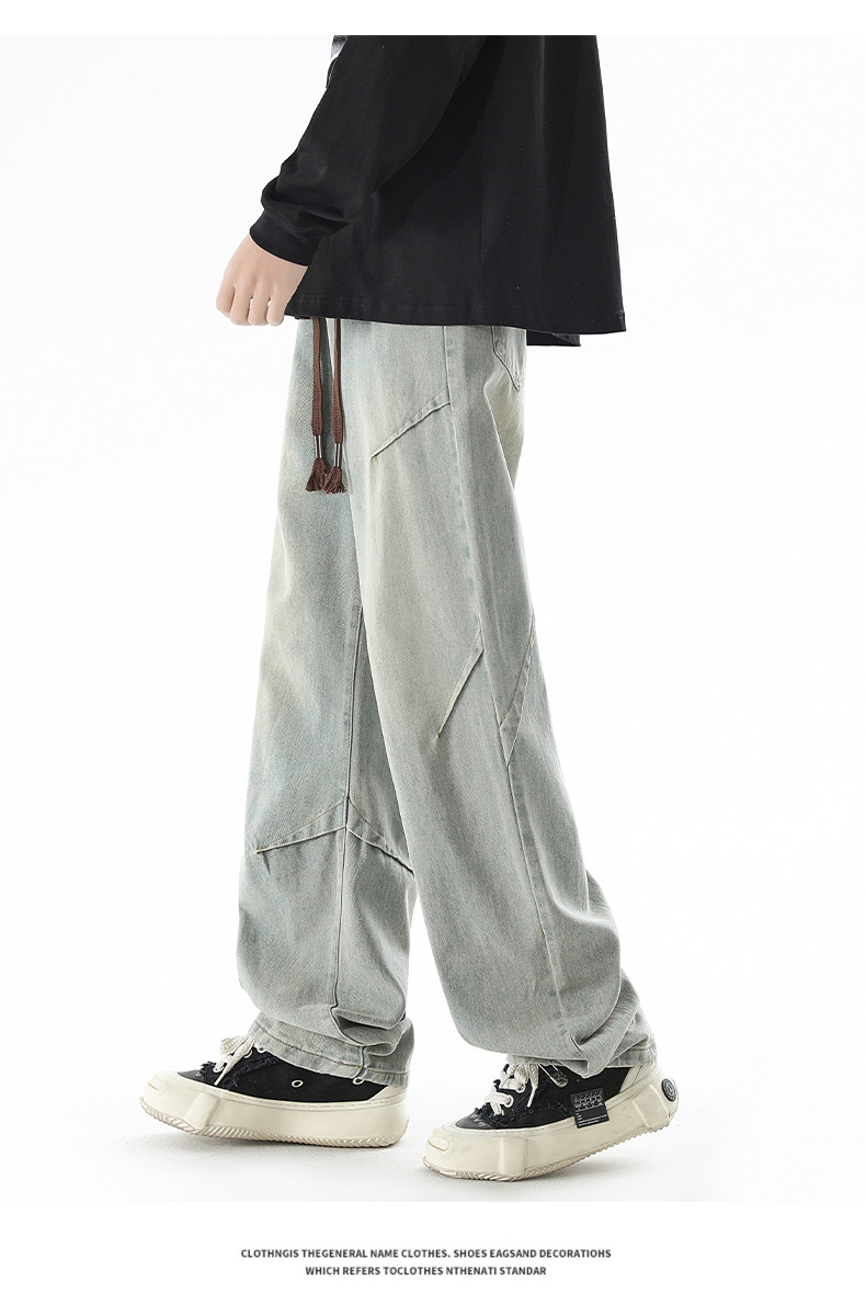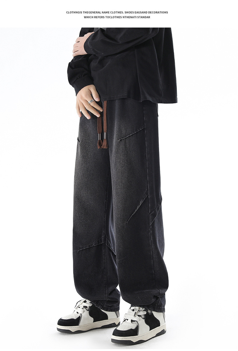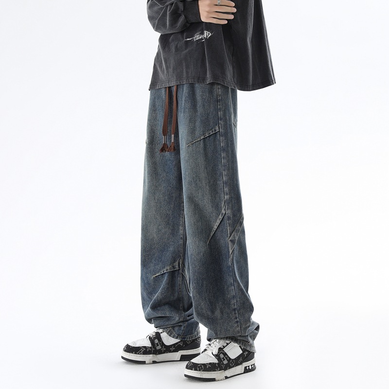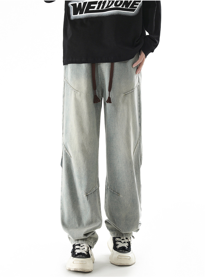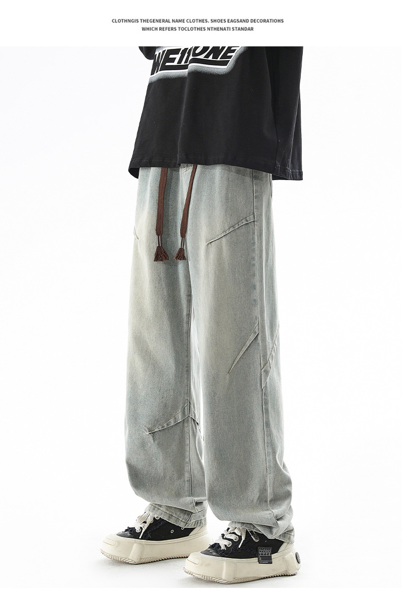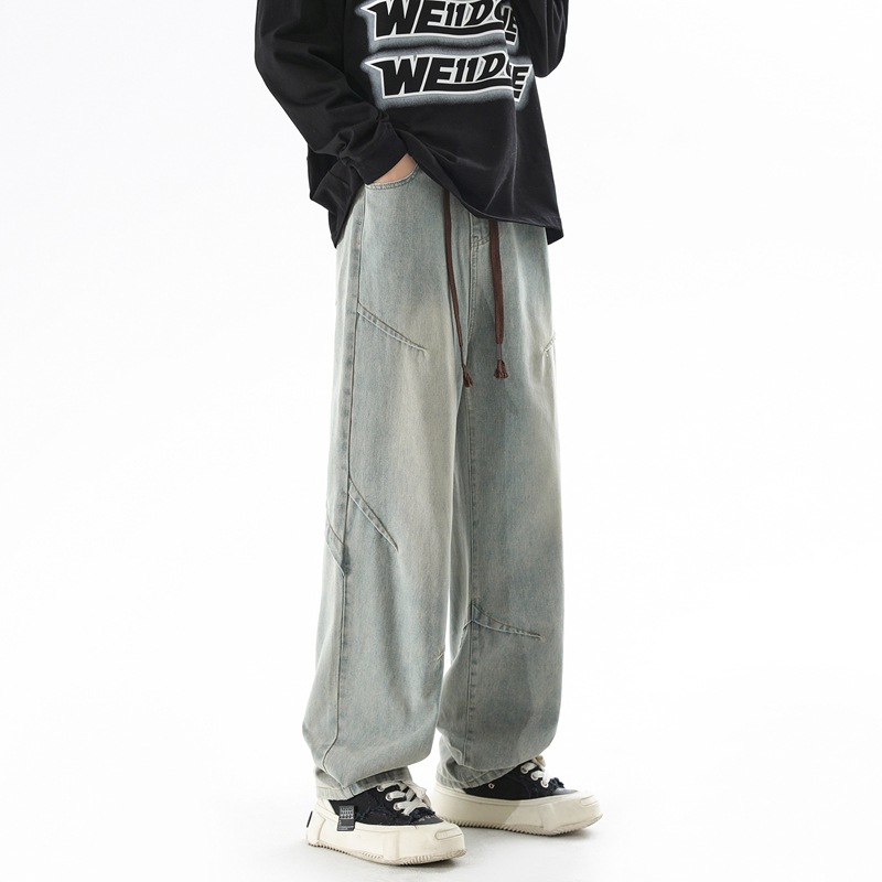 청바지 남성 봄과 여름 새로운 미국 남성 하이 스트리트 디자인이 느슨한 스트레이트 드로 스트링 남성용 롱 팬츠를 주름스토어 가기