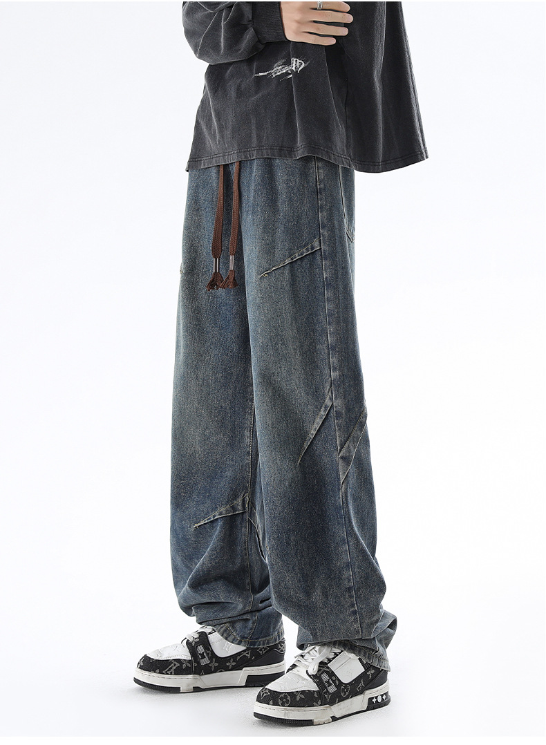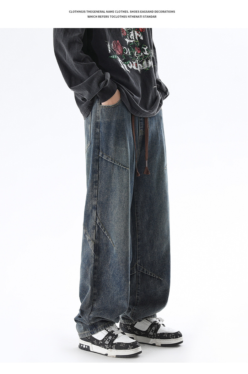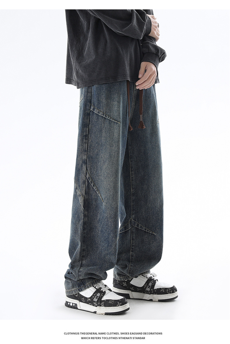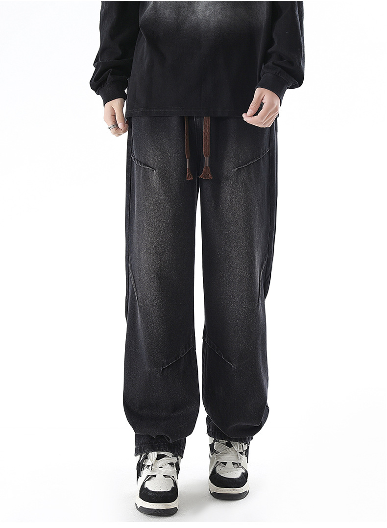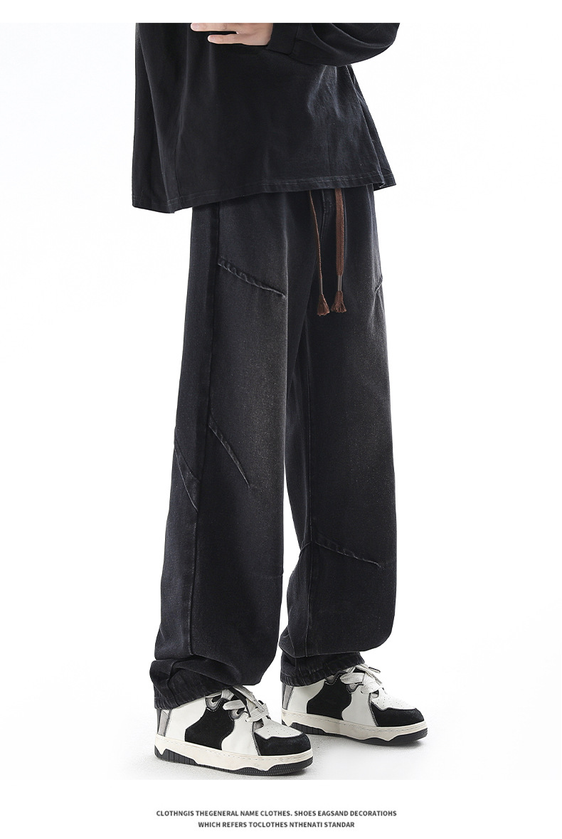 청바지 남성 봄과 여름 새로운 미국 남성 하이 스트리트 디자인이 느슨한 스트레이트 드로 스트링 남성용 롱 팬츠를 주름스토어 가기