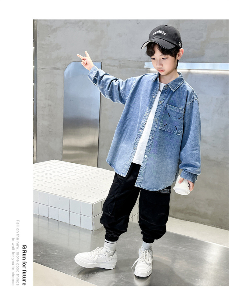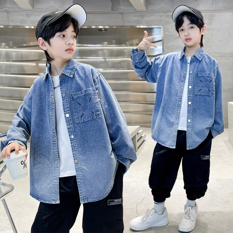 소년 데님 셔츠 코트 2023 가을 새로운 미디어와 큰 어린이 봄과 가을 셔츠 유행 튀긴 거리 잘 생긴 데님 옷스토어 가기
