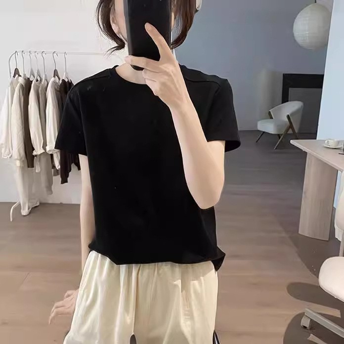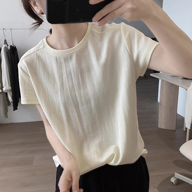 여성 반팔 티셔츠 여름 새로운 한국 스타일 슬리밍 라운드 넥 심플한 틈새 디자인 면화 셔츠 탑스토어 가기