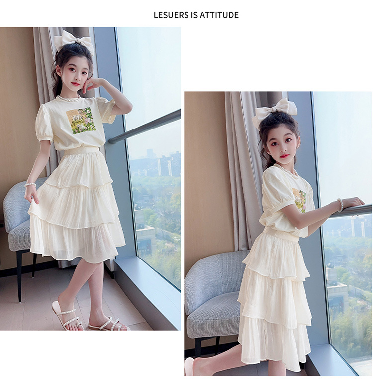 소녀 여름 의류 세트 2024 새로운 큰 어린이 패션 서양식 반팔 티셔츠 스커트 케이크 스커트 투피스 세트 패션
