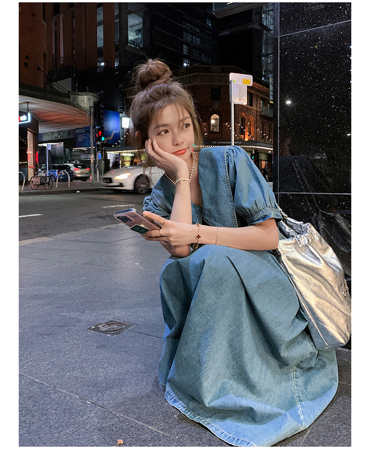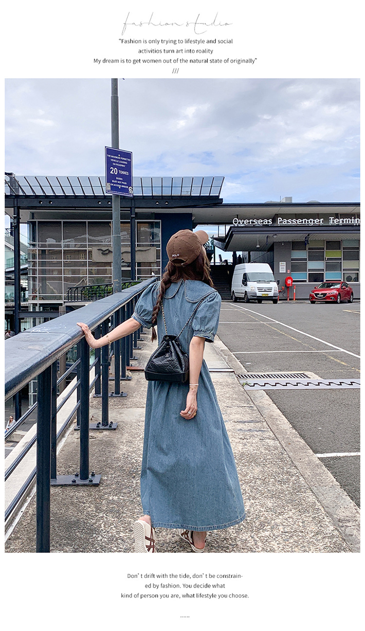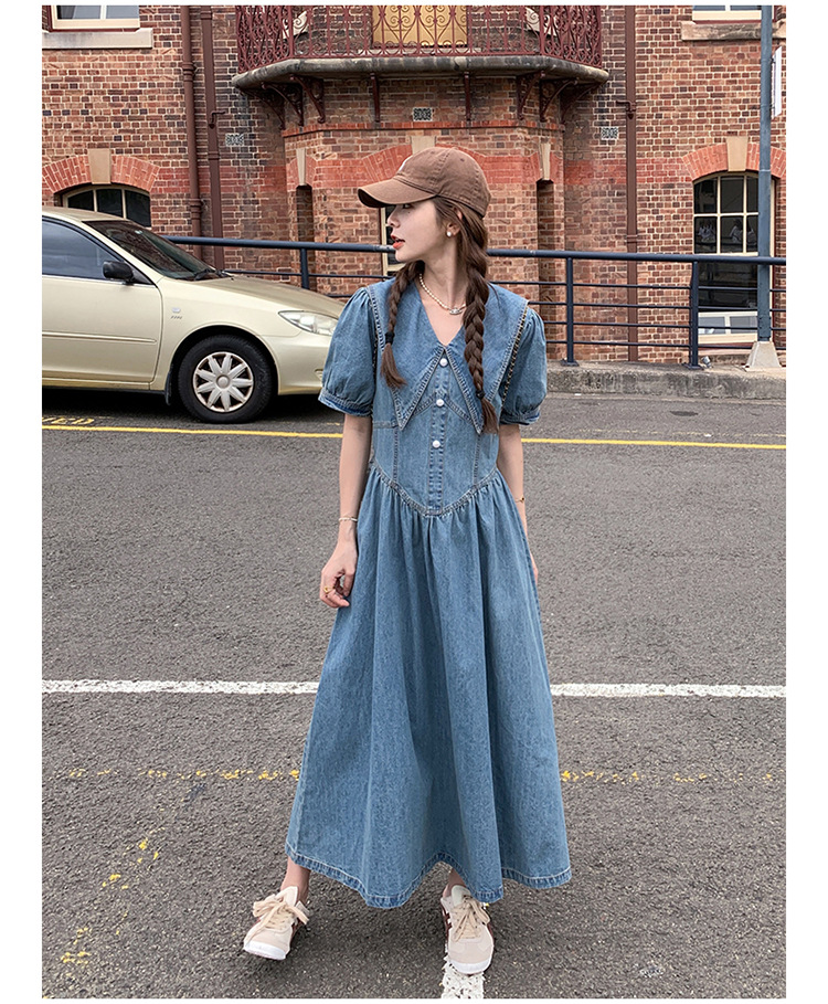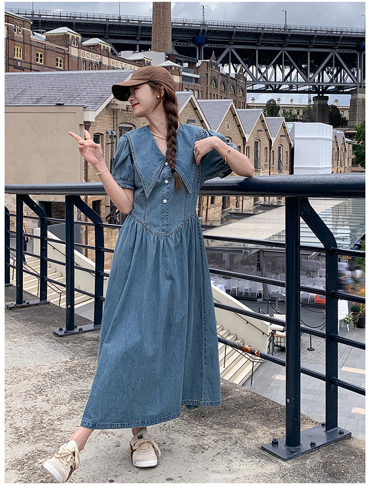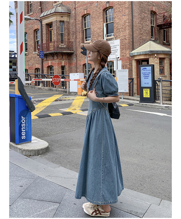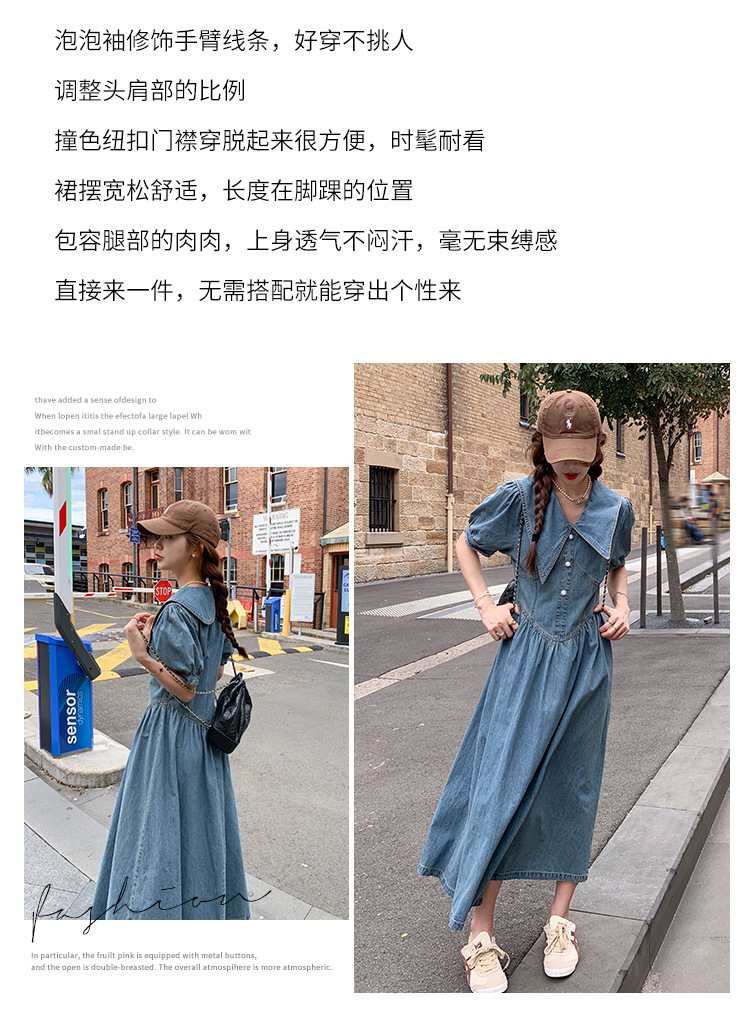 얇은 프랑스 복고풍 인형 칼라 데님 원피스 여성 여름 새로운 2024 허리 퍼프 소매 홍콩 스타일 스커트스토어 가기