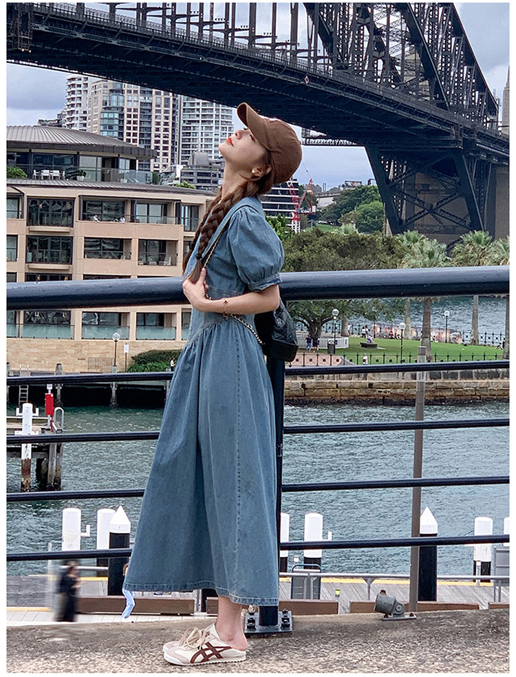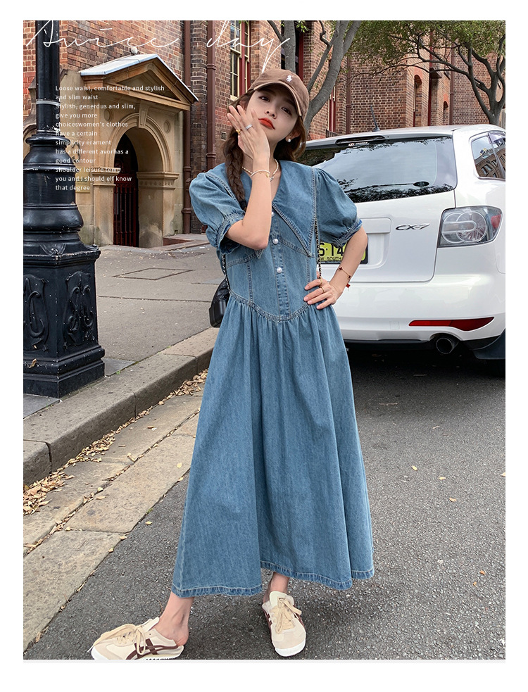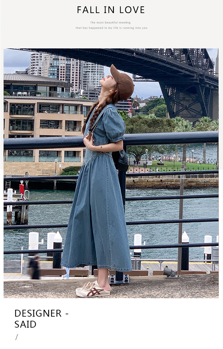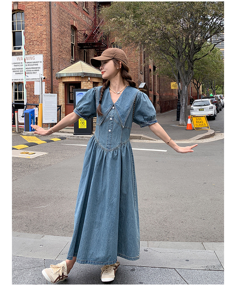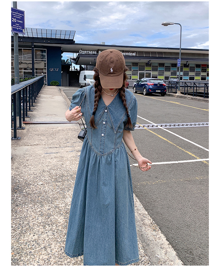 얇은 프랑스 복고풍 인형 칼라 데님 원피스 여성 여름 새로운 2024 허리 퍼프 소매 홍콩 스타일 스커트