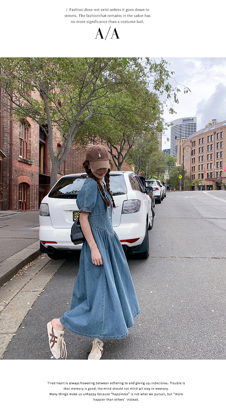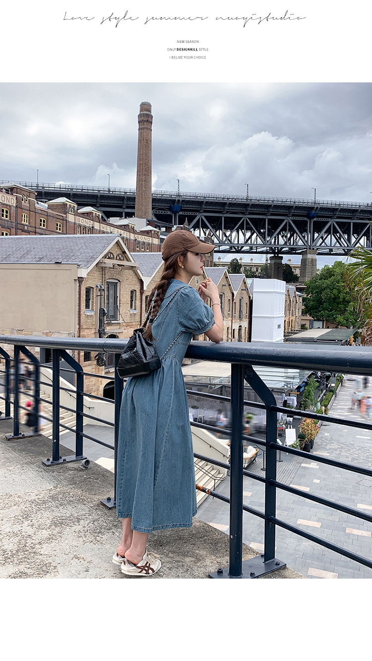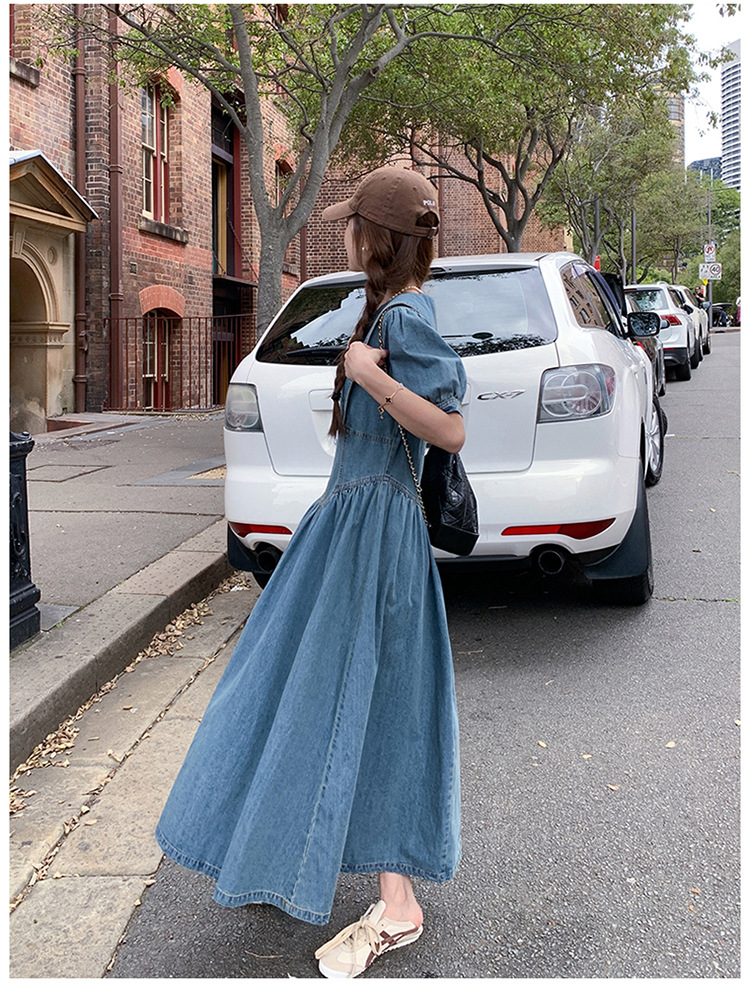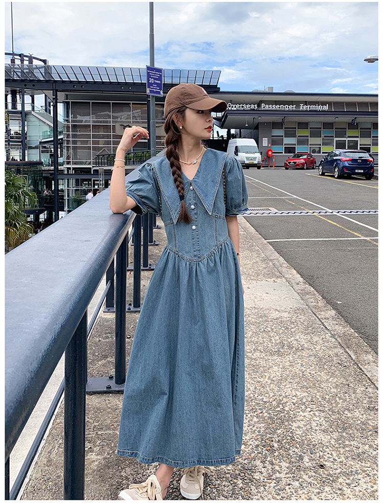얇은 프랑스 복고풍 인형 칼라 데님 원피스 여성 여름 새로운 2024 허리 퍼프 소매 홍콩 스타일 스커트