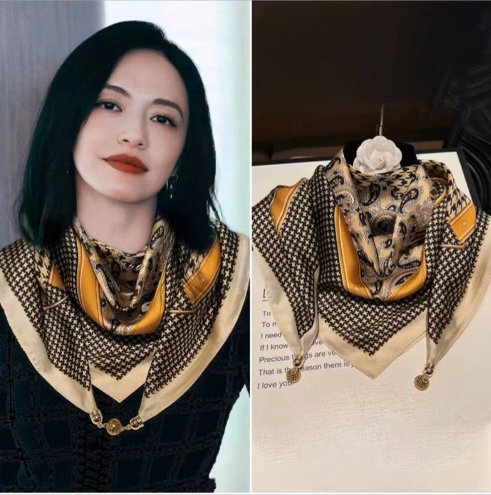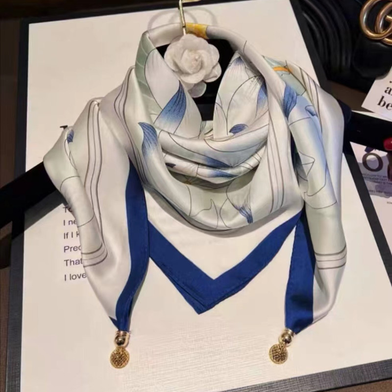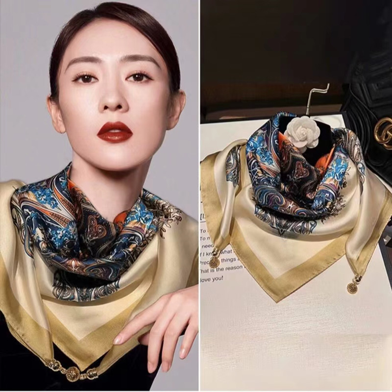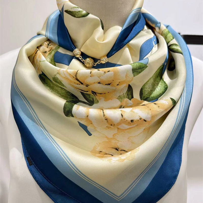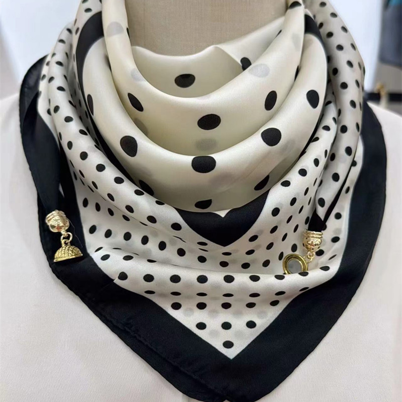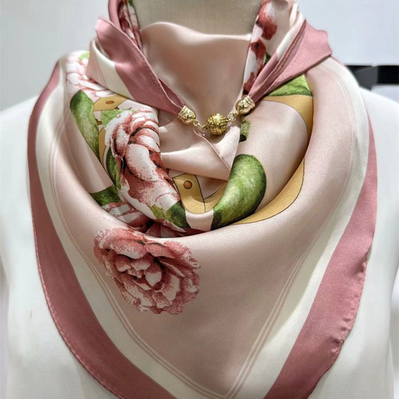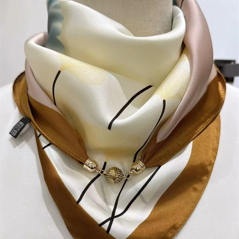 2025 신형 자석 버클 실크 스카프 인기 여성용 사각 스카프 메탈 볼 자석 버클 인조 실크 프린트 얇은 스카프
