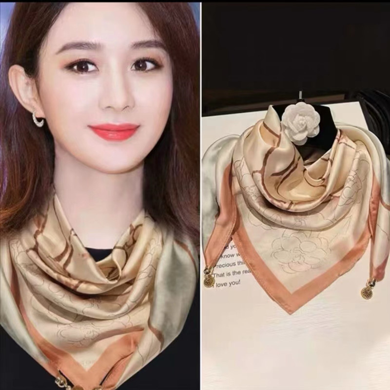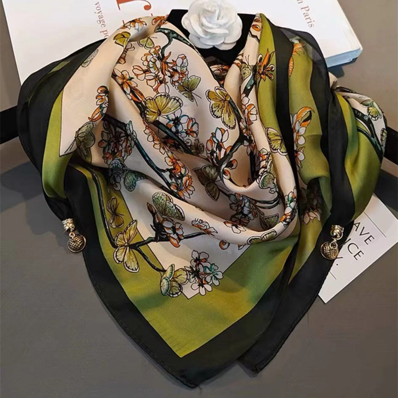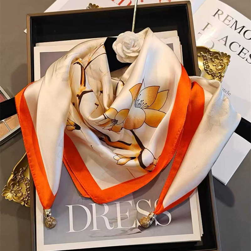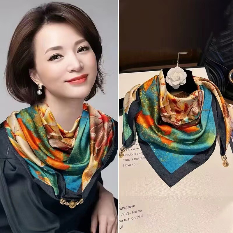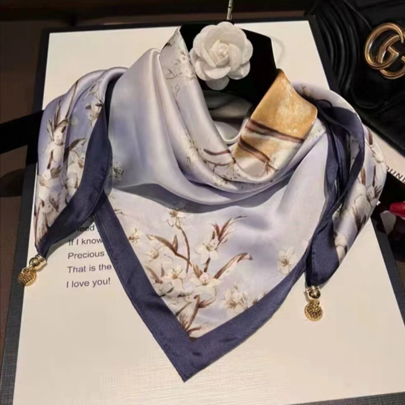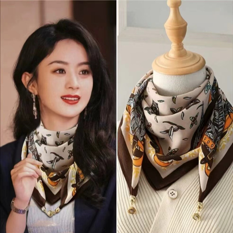 2025 신형 자석 버클 실크 스카프 인기 여성용 사각 스카프 메탈 볼 자석 버클 인조 실크 프린트 얇은 스카프